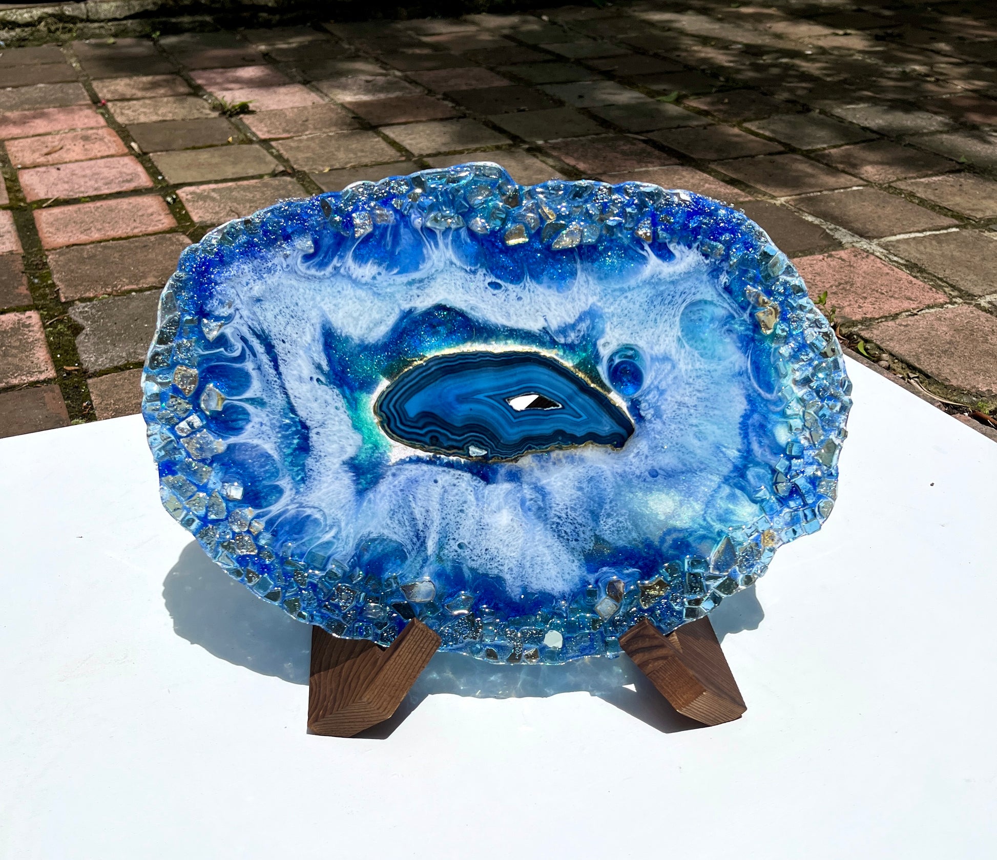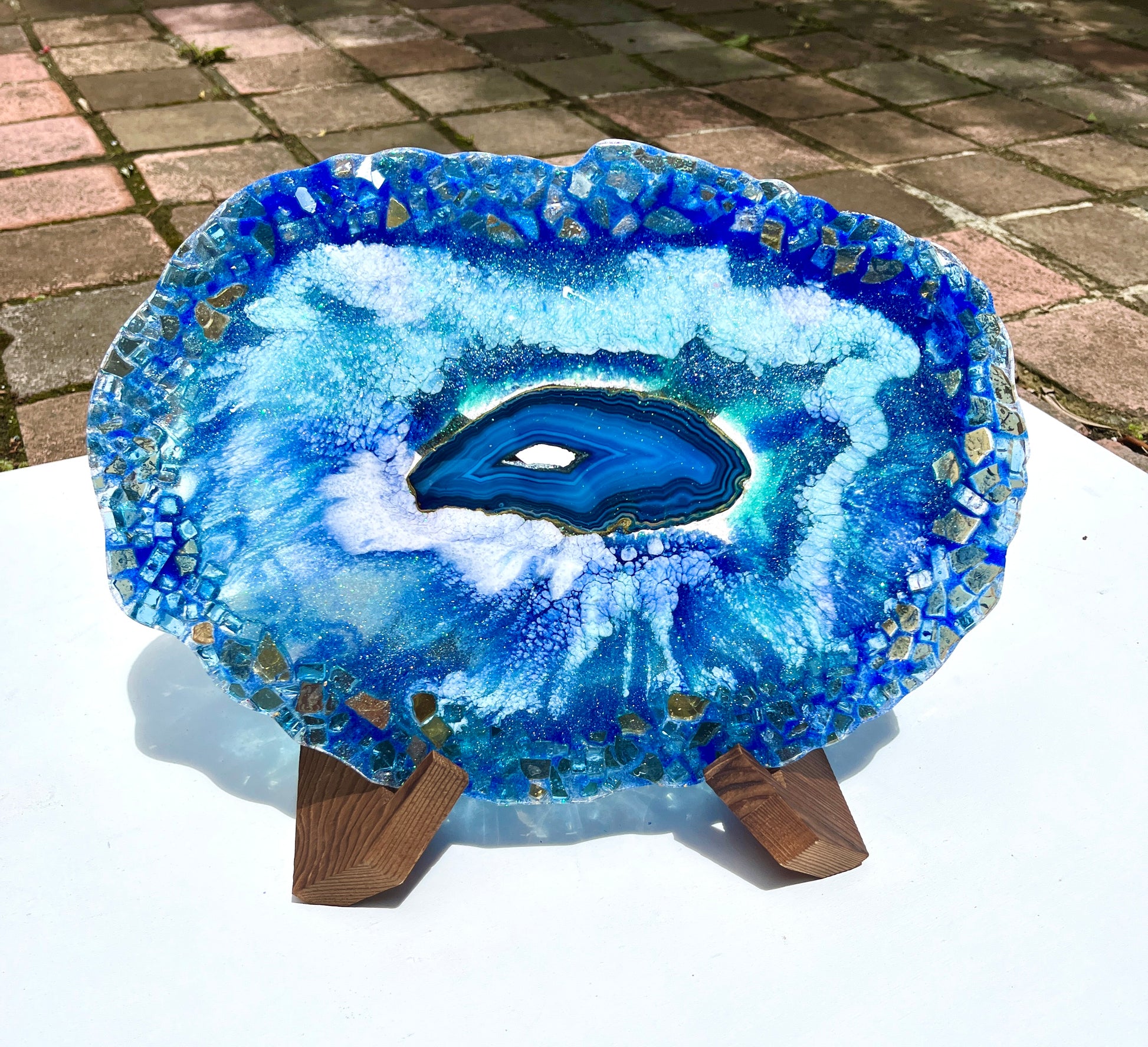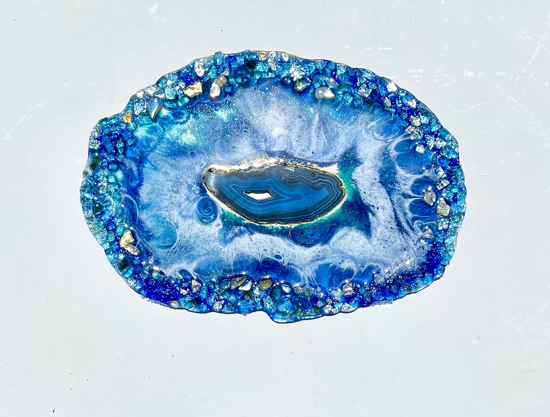 Geode inspired piece painted in shades of blue and white with an stunning blue agate centre and an outer made of glass. This piece is double sided (see photos).