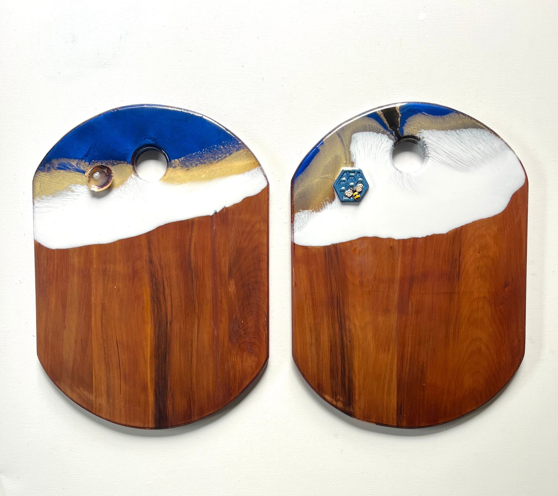 Simple and elegant, this cheeseboard will certainly be noticed. Created using deep ultramarine blue, gold and white, with a gorgeous detail of a beehive and gold bee.