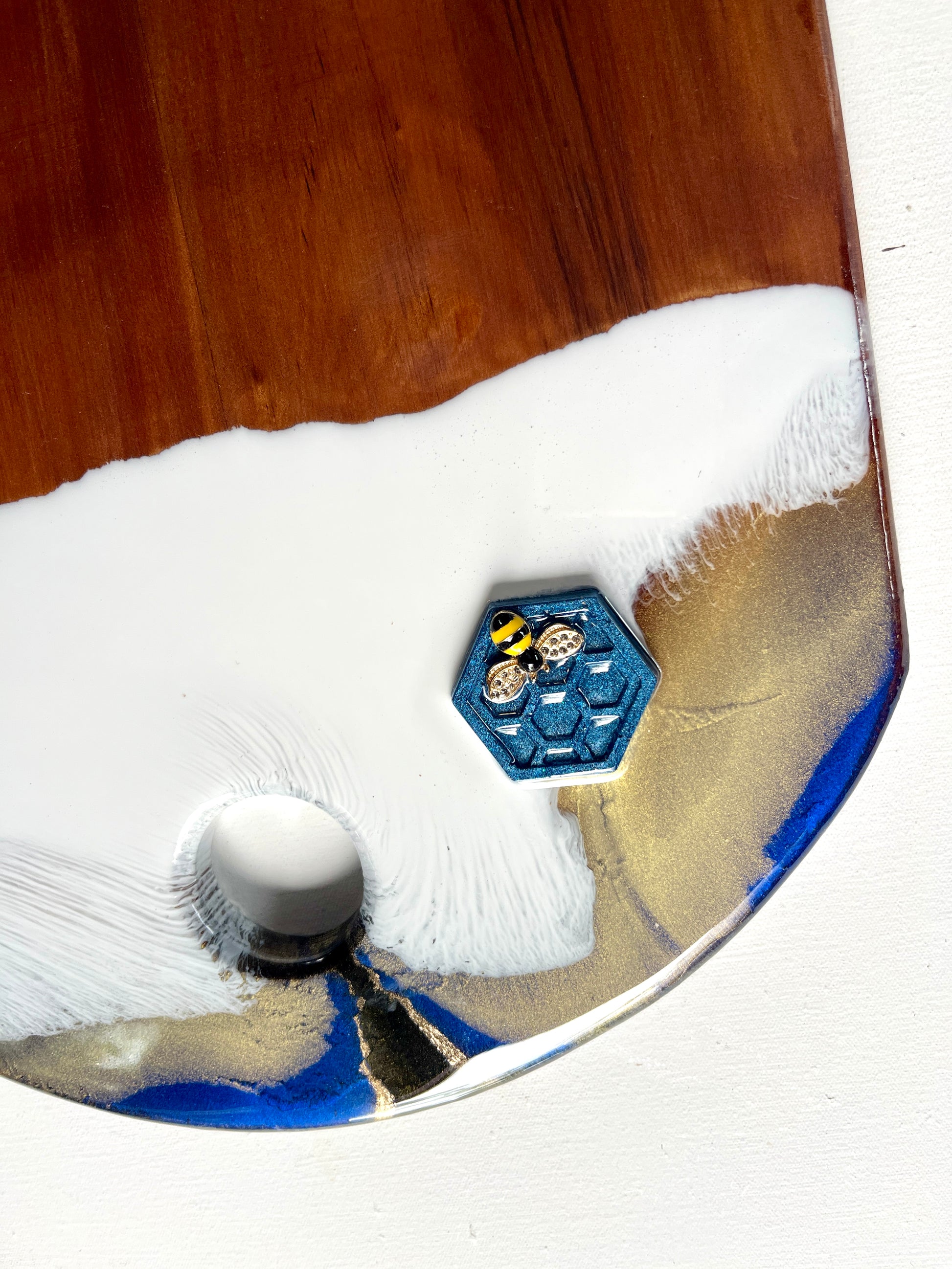 - Resin beehive detail and metal golden bee.