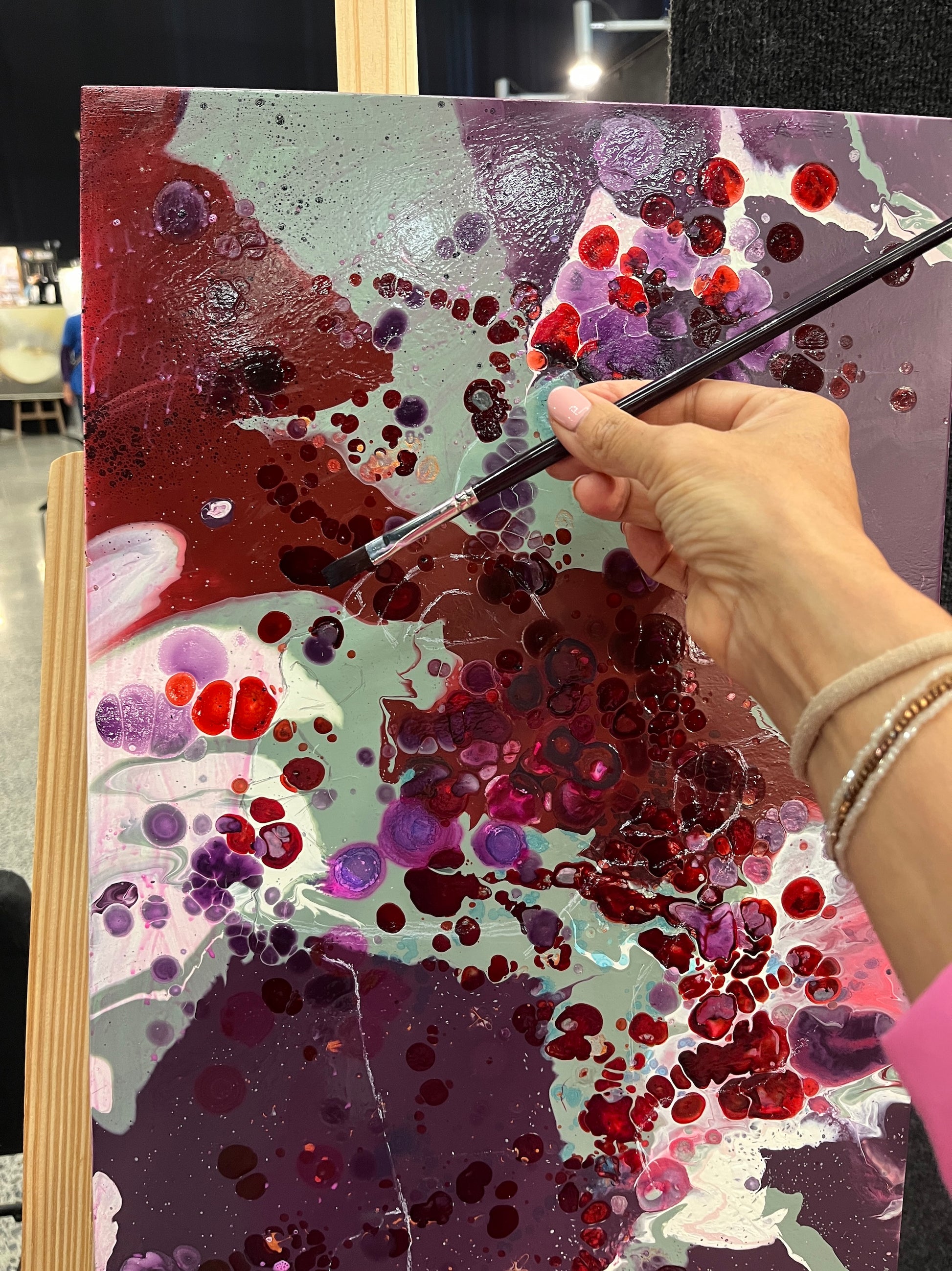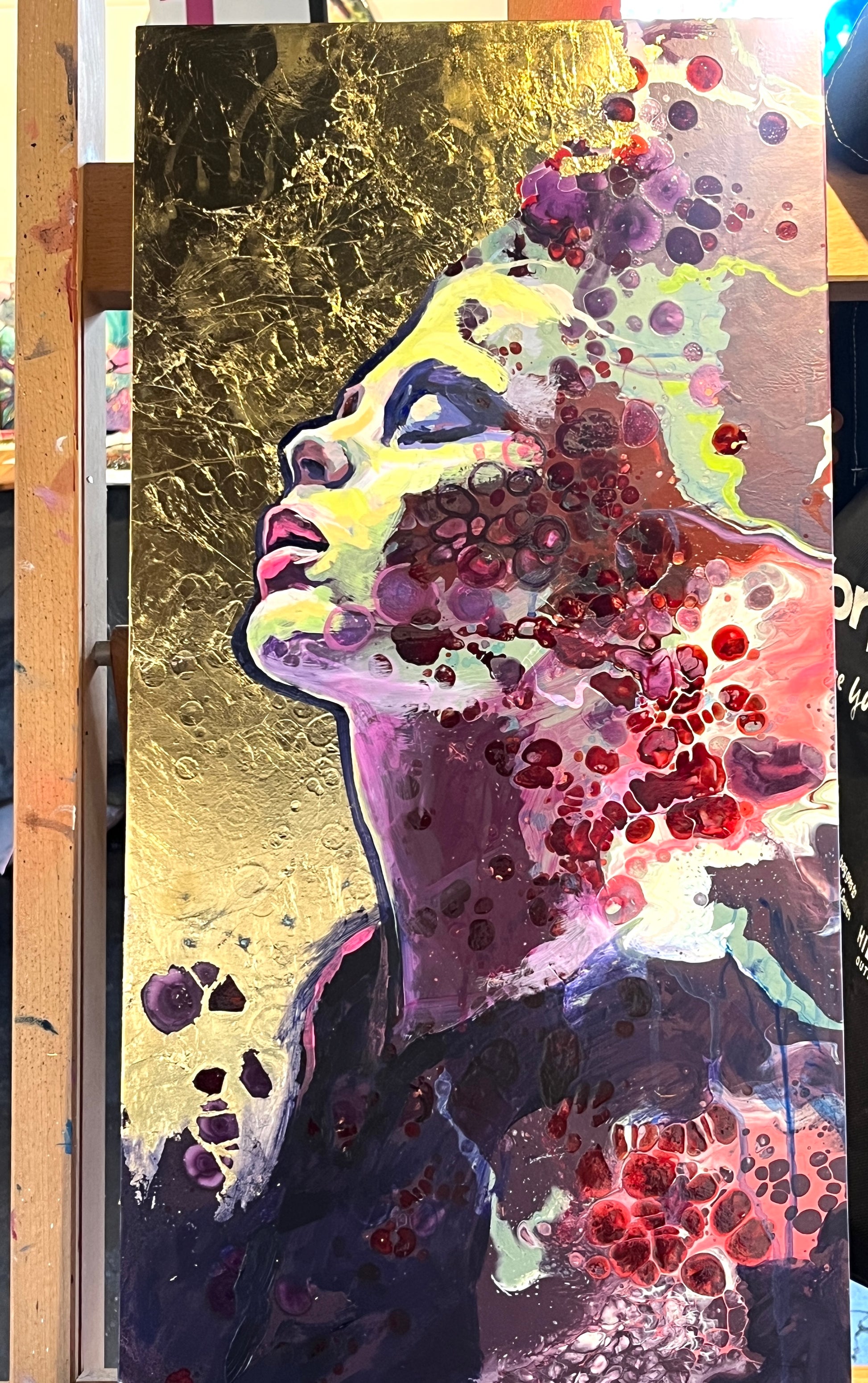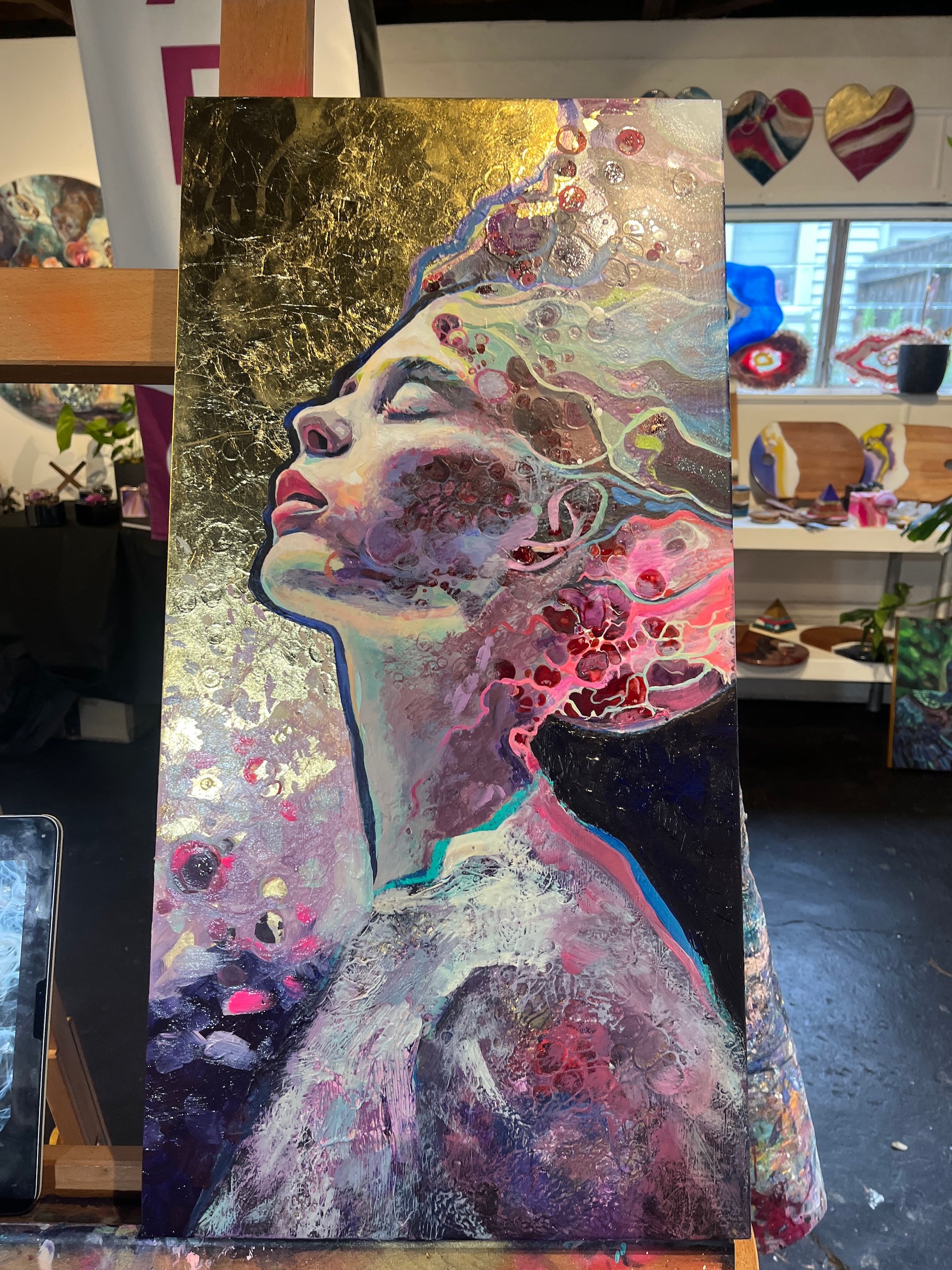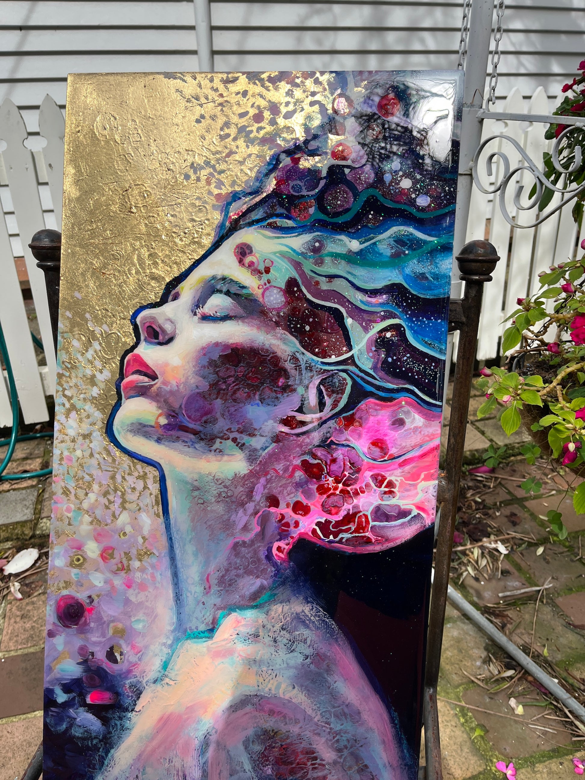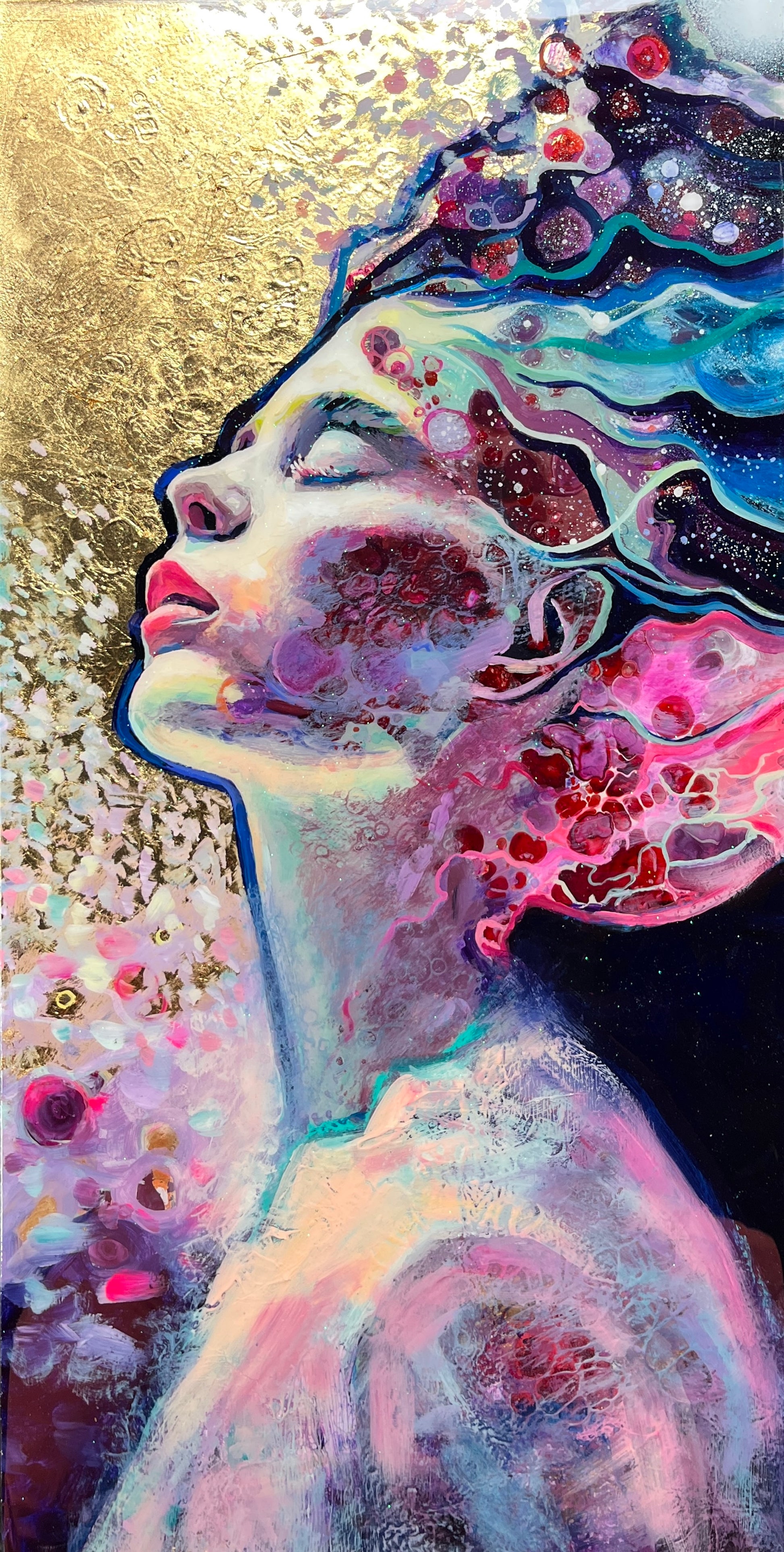 Painted with rich layers of pinks and blues and featuring gold leaf, creating a sense of movement and depth.