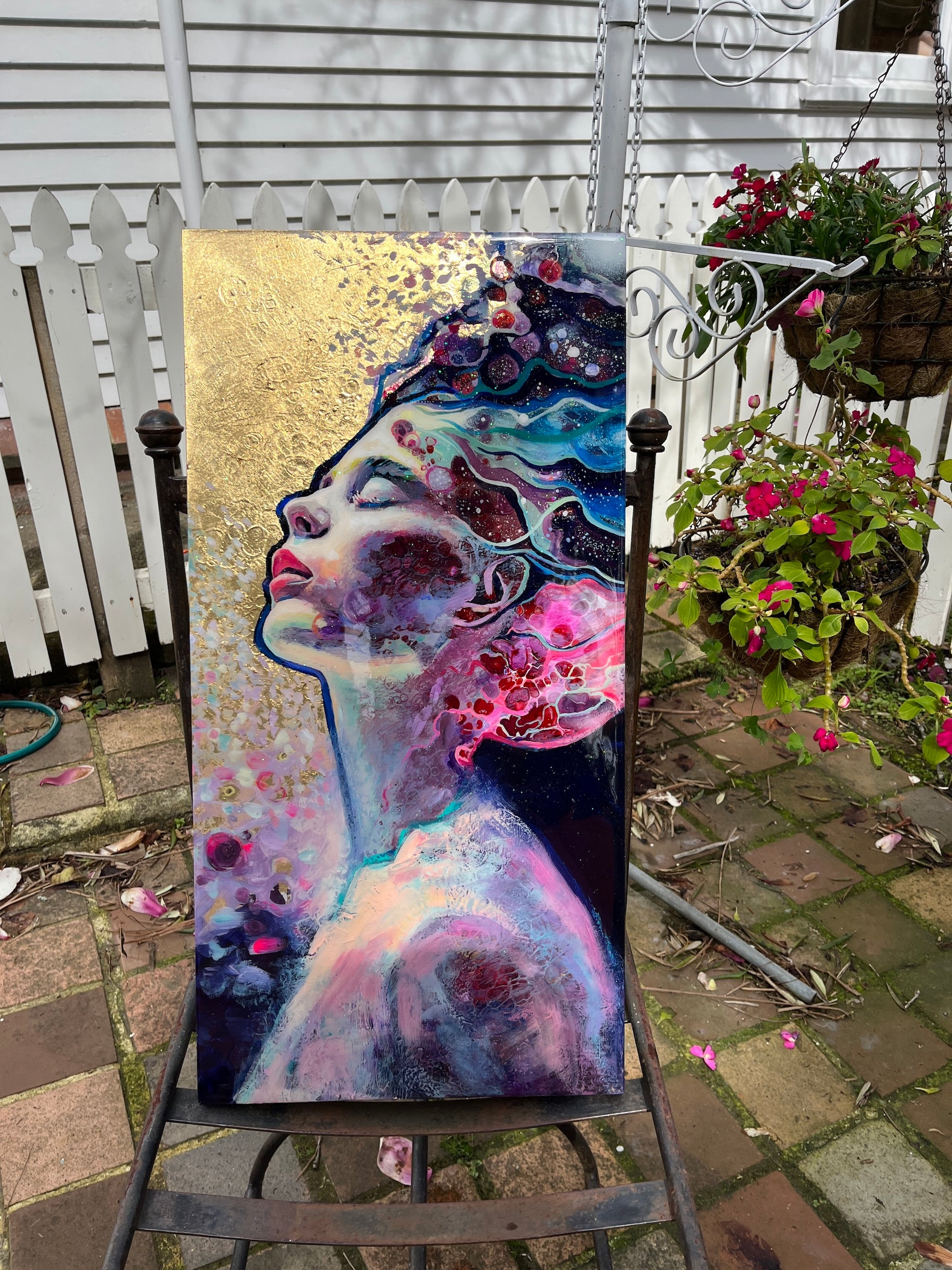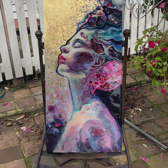 This mixed media piece portrays a woman in a quiet moment of surrender, her eyes are closed as a myriad of colour and texture flow through her like visible emotions. This artwork explores inner stillness and the beauty found in vulnerability.