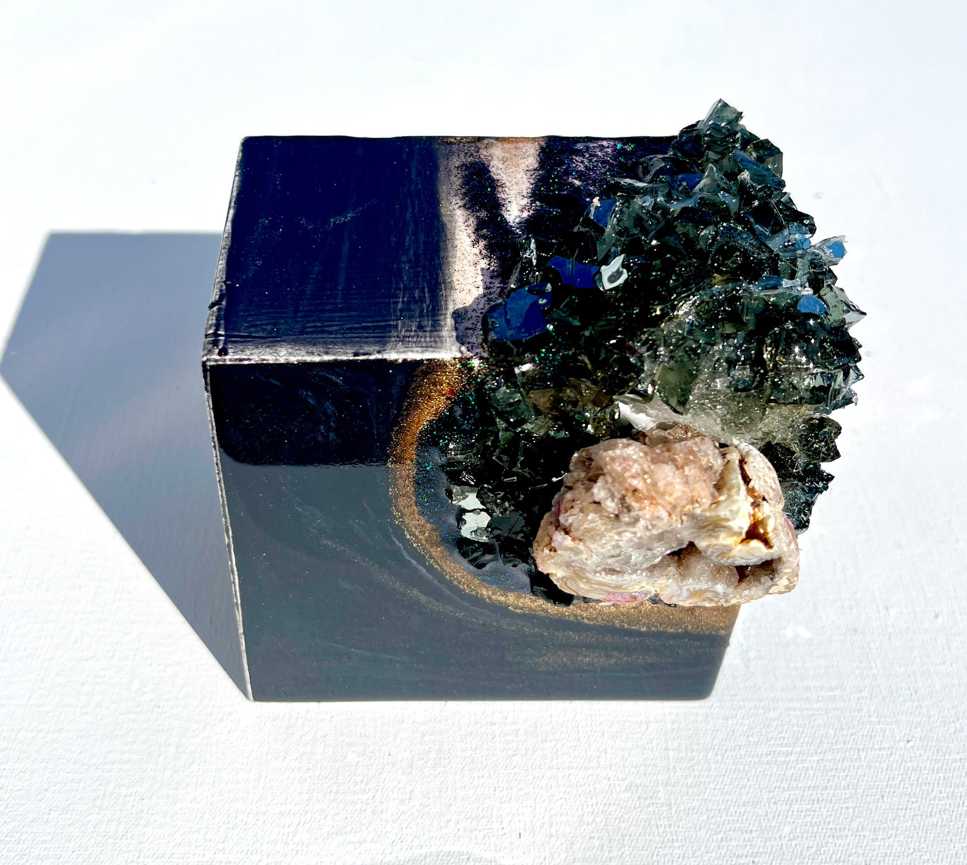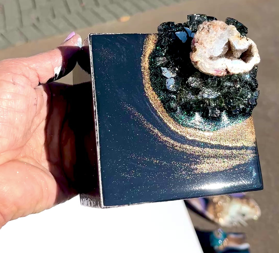 Black Beauty is painted in shimmering black-blue with golden lashes. Nestled among dark sparkling glass there is a beautiful genuine quartz geode.