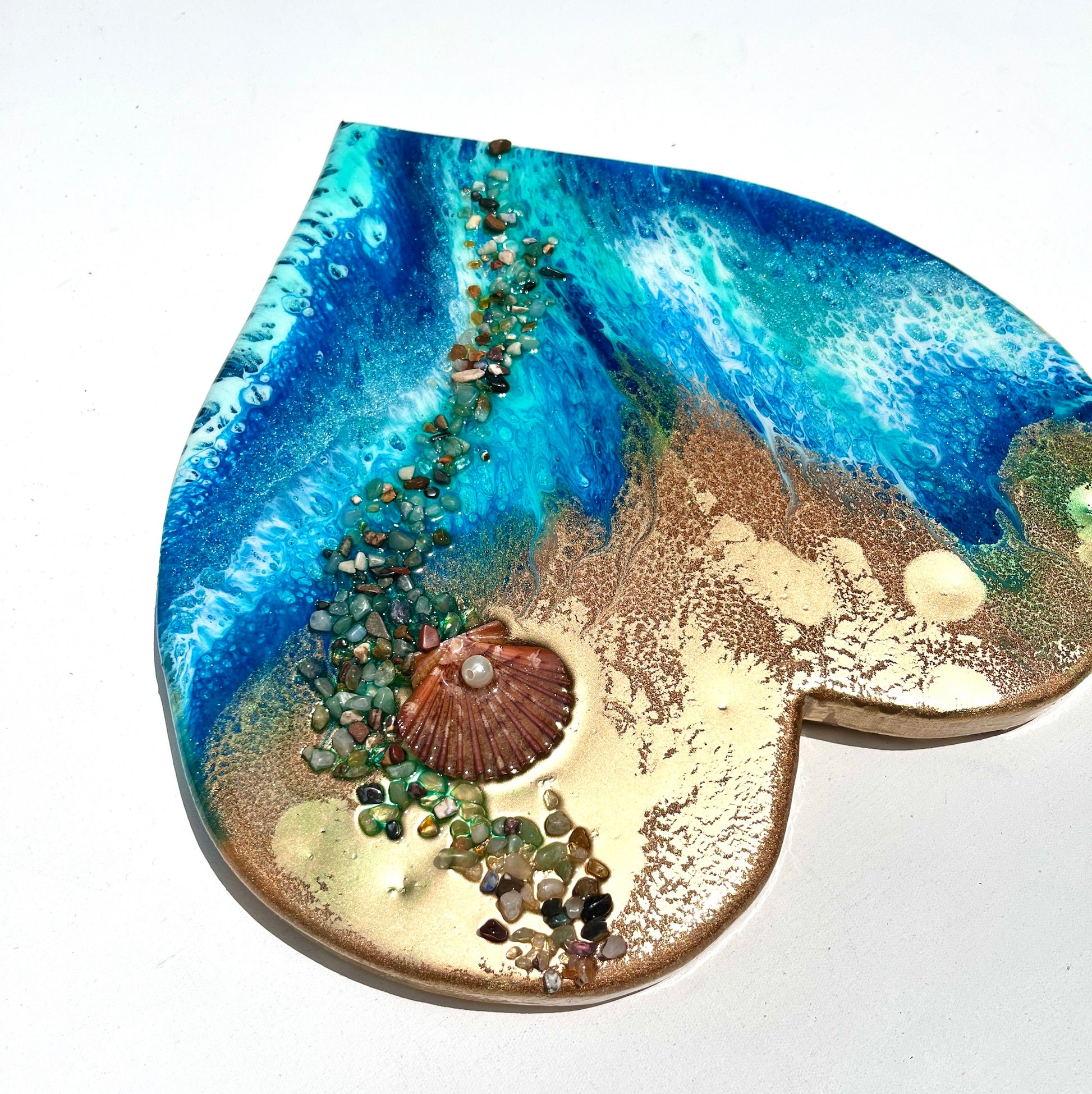 Painted in shades of turquoise and blue, with lashings of lacy gold and a smattering of mixed gems framing a gorgeous shell with pearl accent.