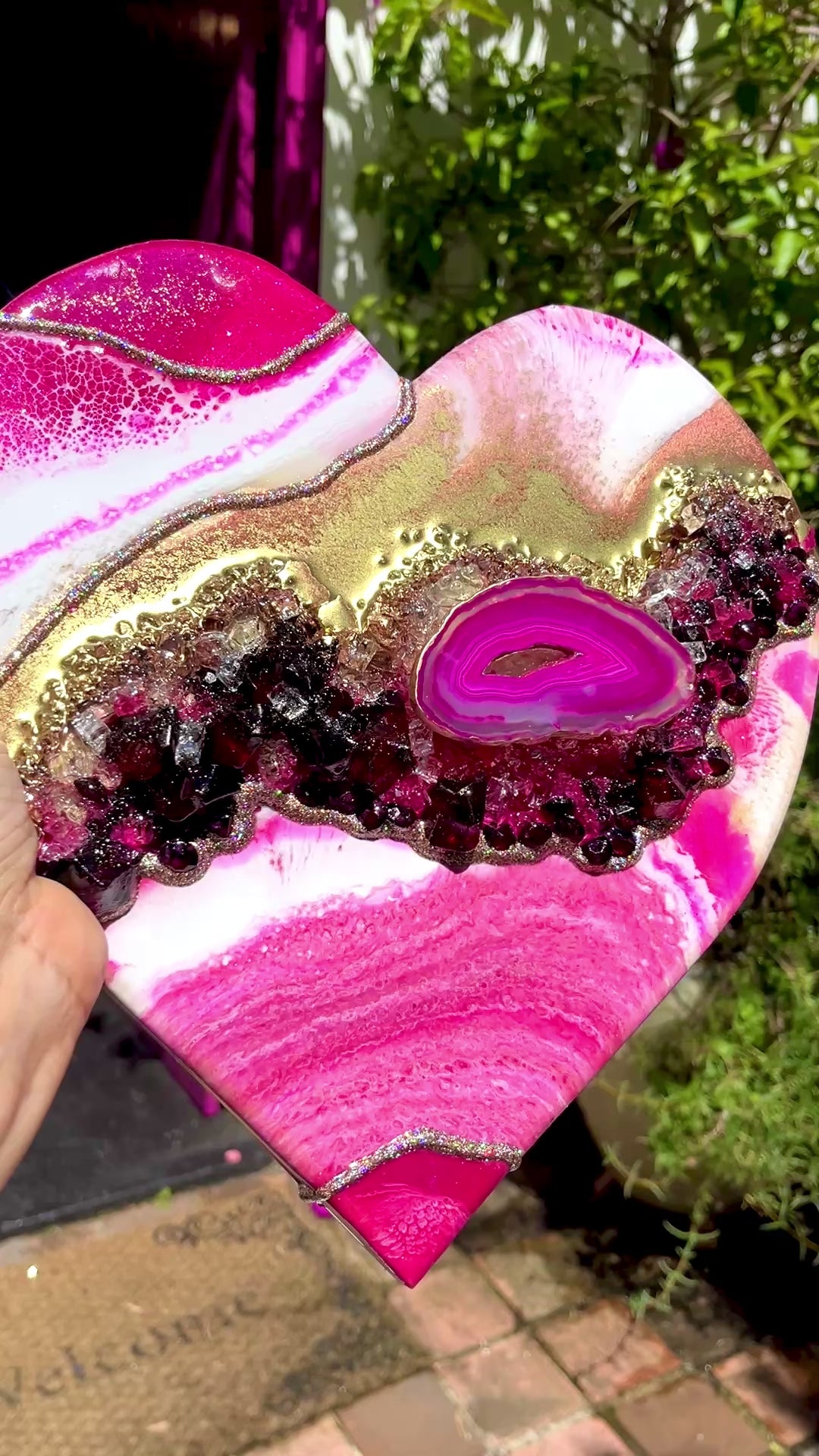- Inspired by this Spanish traditional dance, painted in luscious shades of pink, gold and white with a band of glass and acrylic crystals. Nestled amongst this is a pink agate slice with hollow centre.