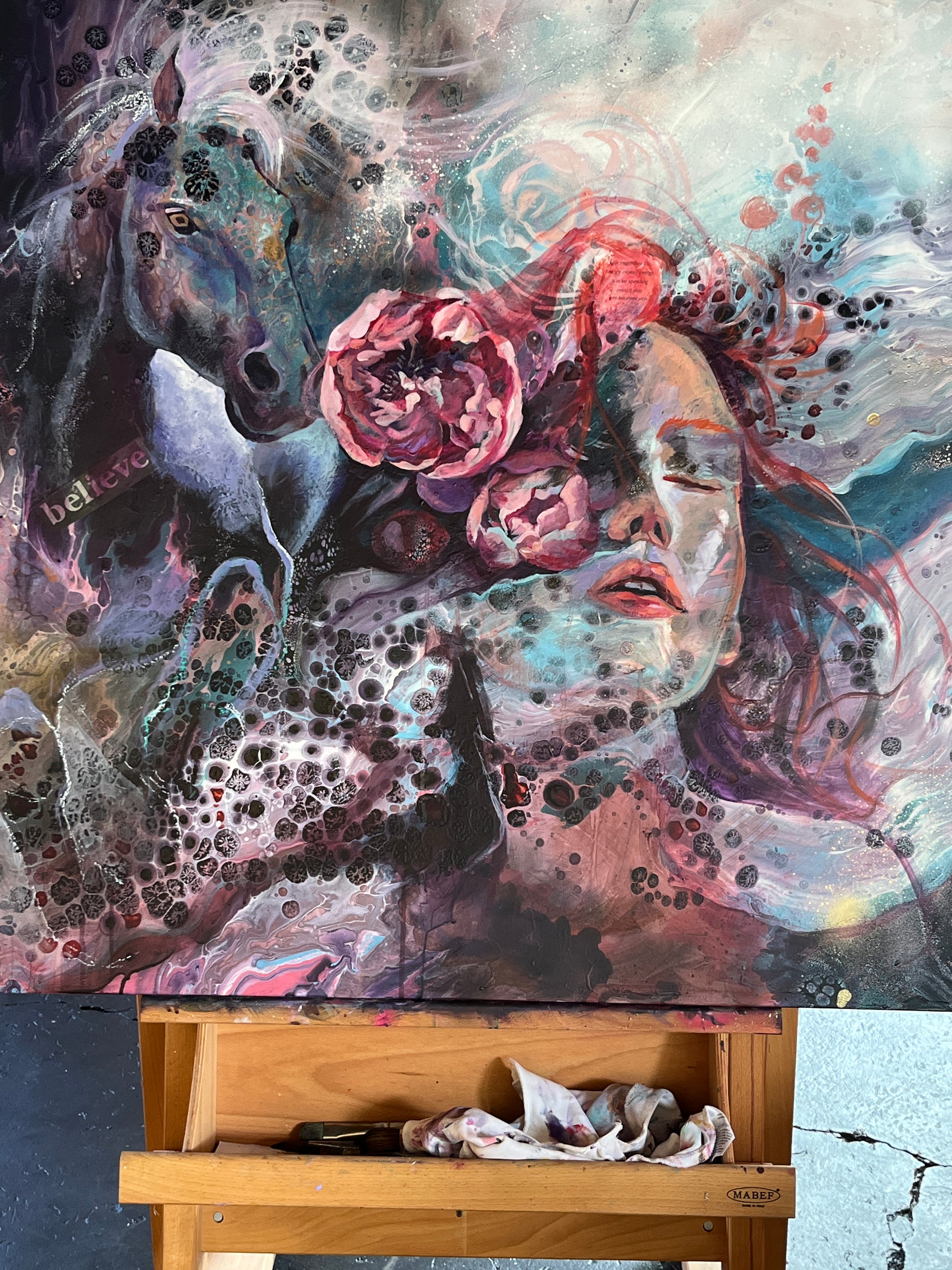 Adding a dynamic element to this artwork, a majestic galloping horse captures the viewer's attention on the left. The horse's intense gaze locked onto the woman creates a dialogue between the two figures, evoking a sense of connection that transcends words.
