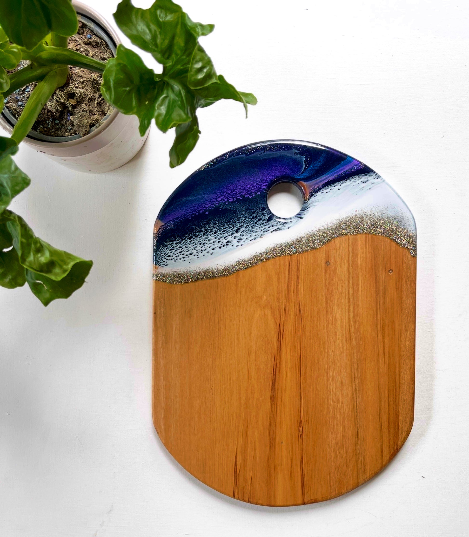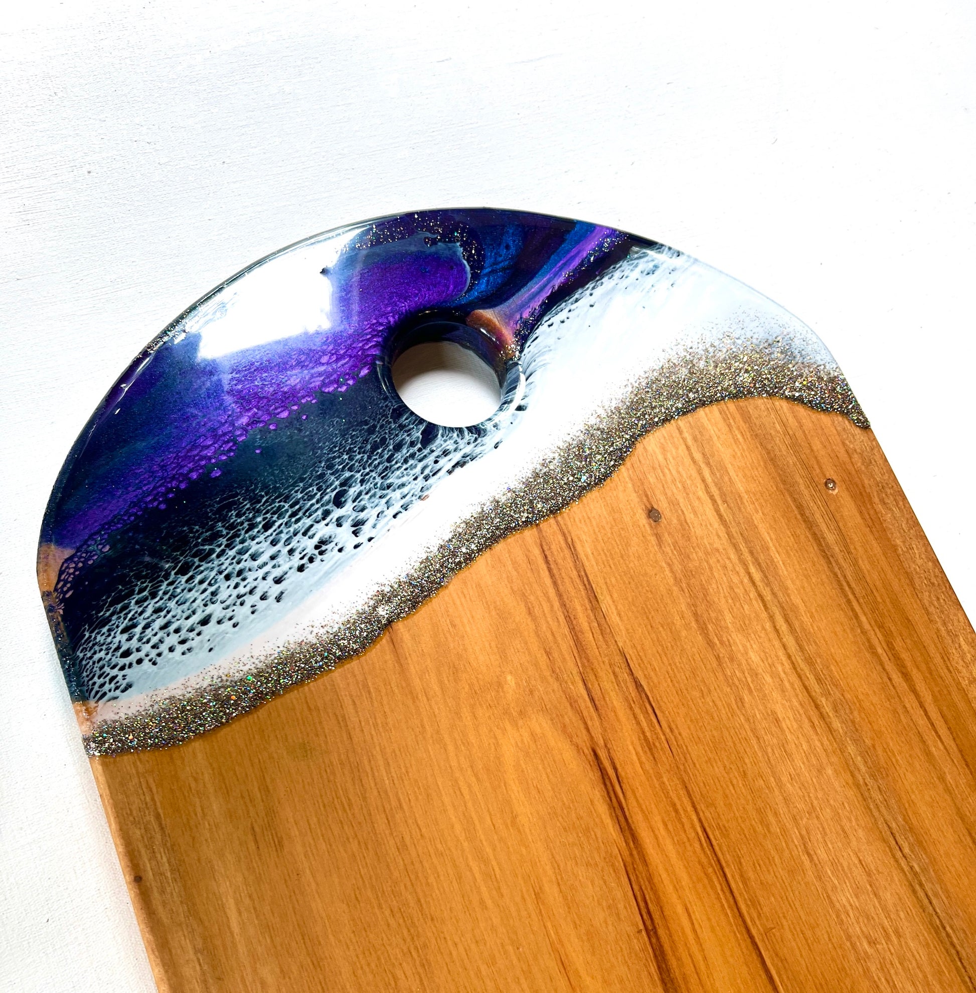 Unique design custom made locally from recycled rimu. Painted in deep purple and black with white lacing and glittery gold edge.