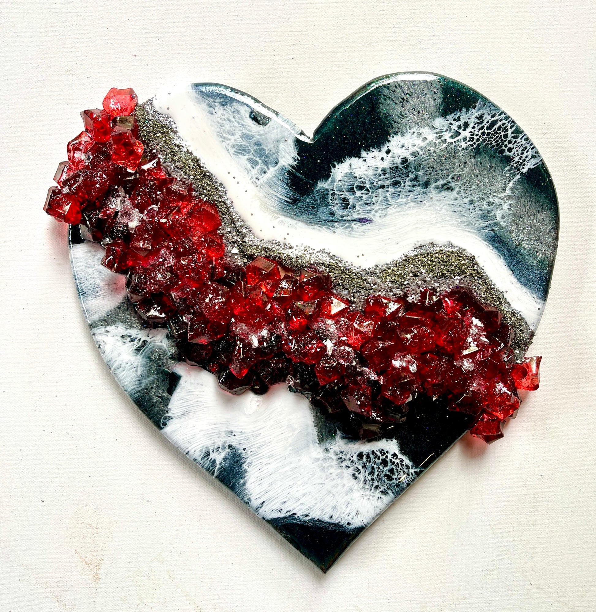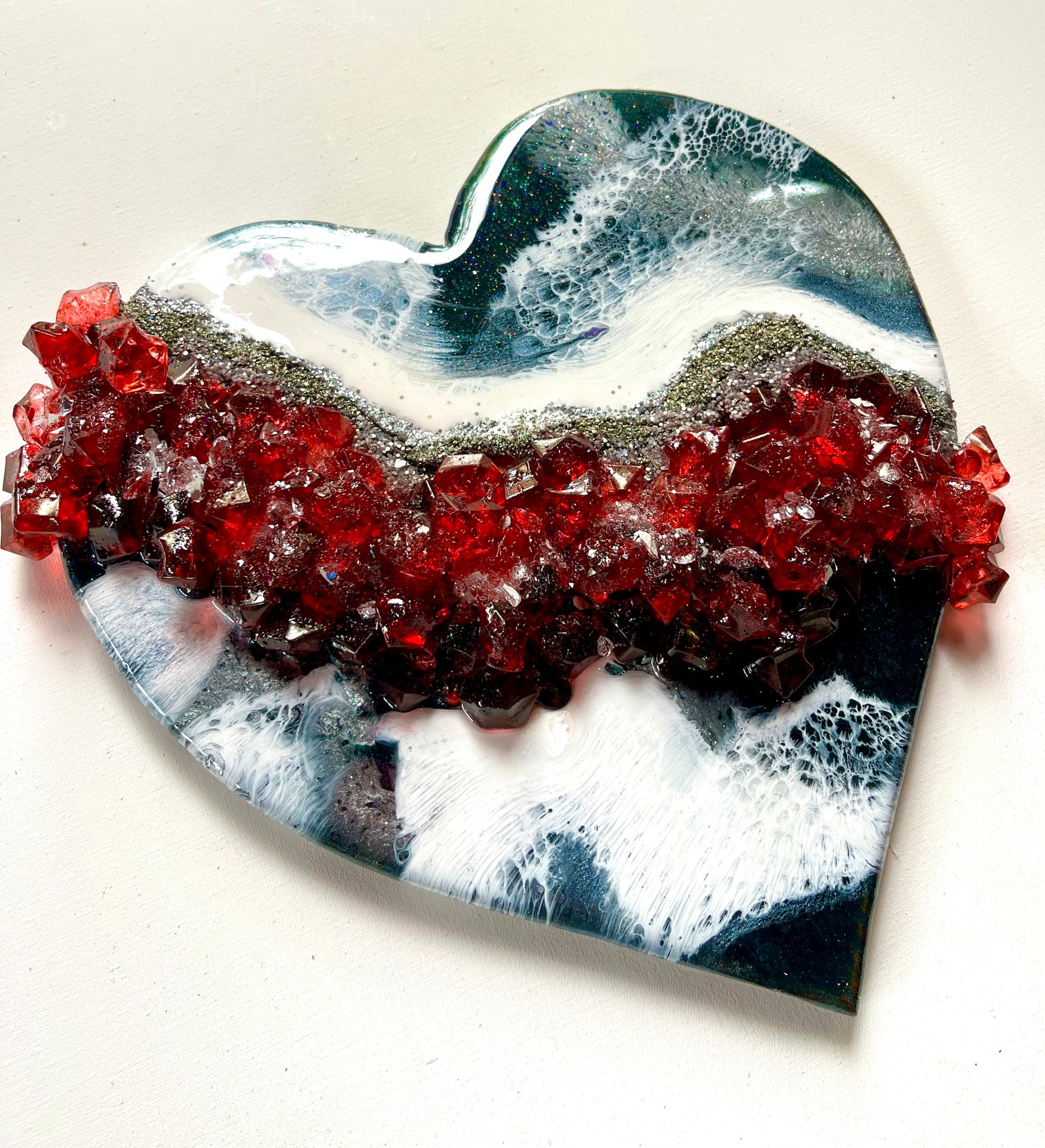 Enchanting love heart painted in deep starry green and white, with a band of red acrylic shimmering crystals and pyrite sand, reminiscent of Christmas lights shining from a window.
