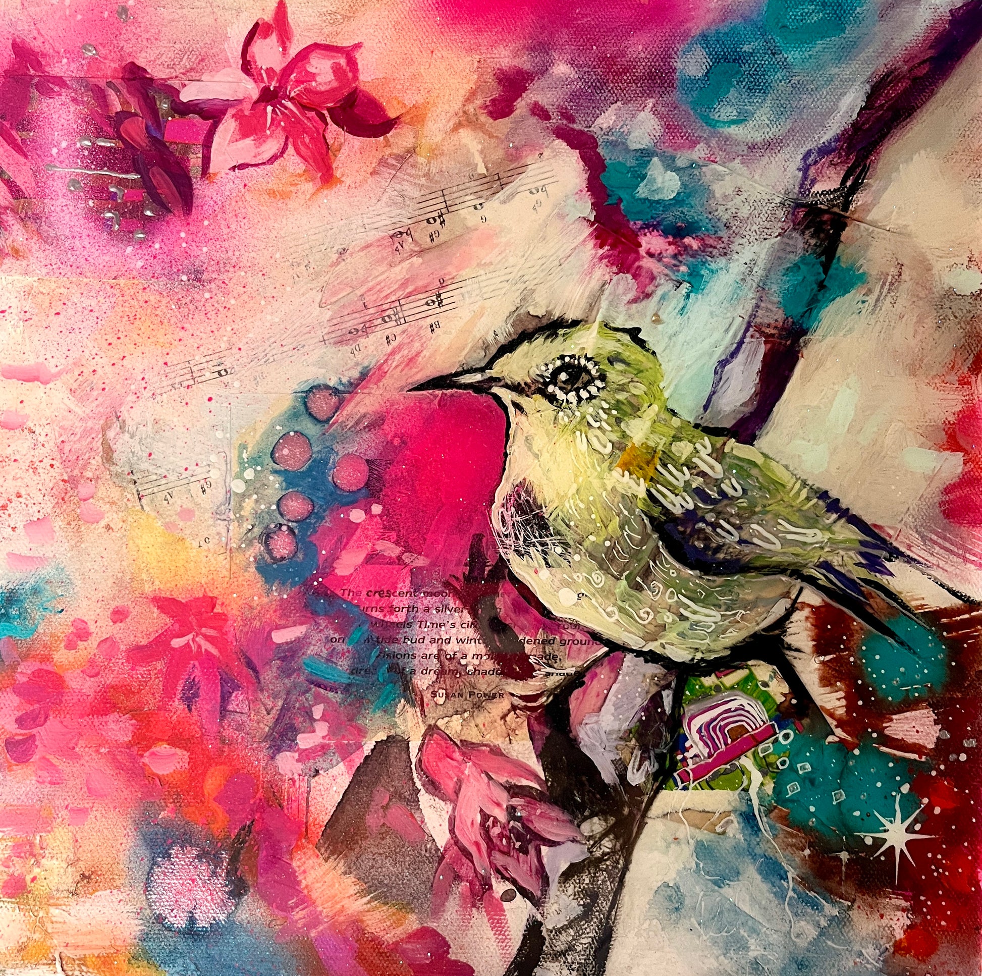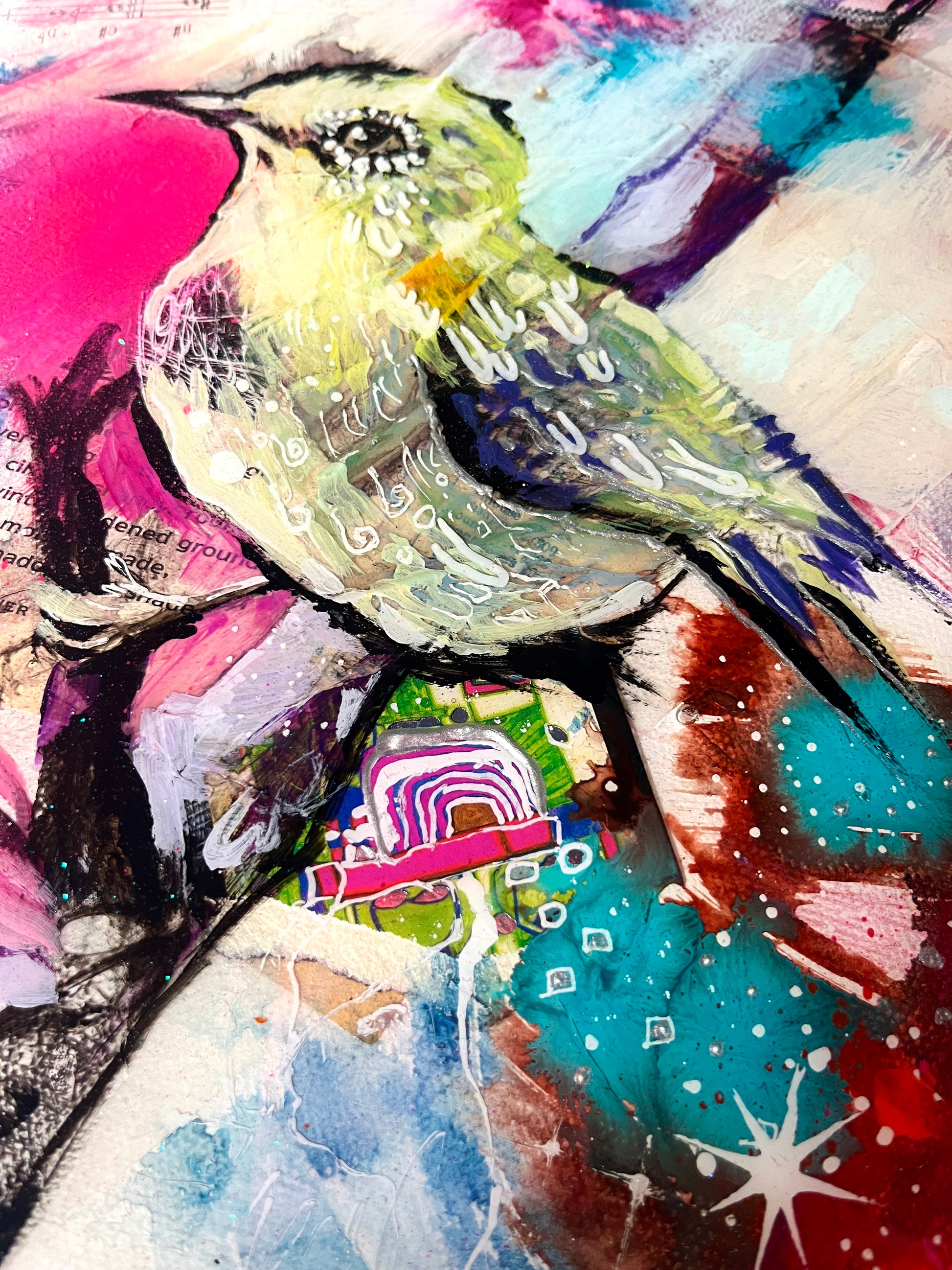 The background is adorned with suggested flowers, twinkling stars, and a charming small rainbow nestled in the bottom right corner, each element adding to the painting’s ethereal quality. Scattered among these details are collaged music notes, infusing the piece with a gentle, melodic rhythm.