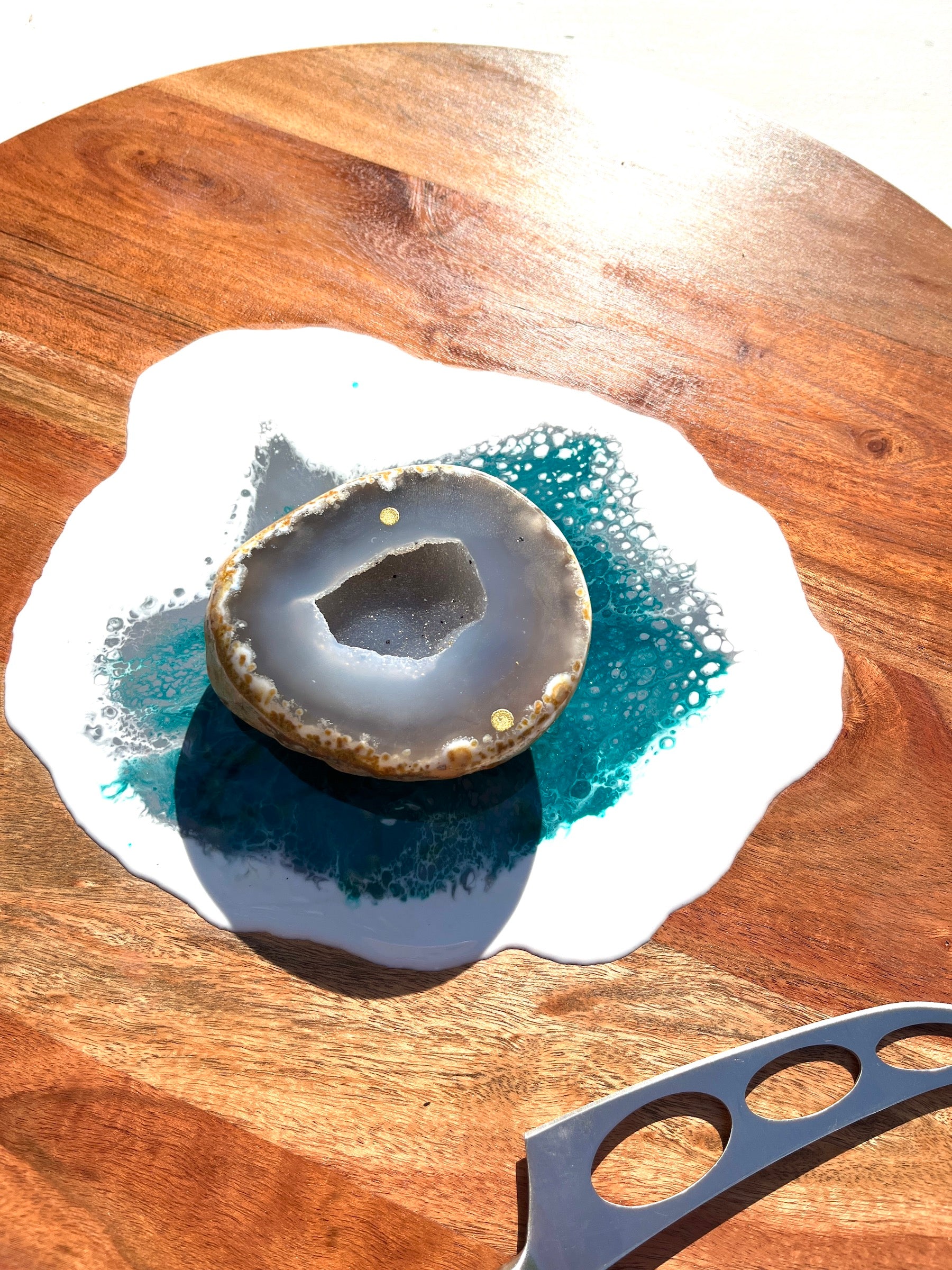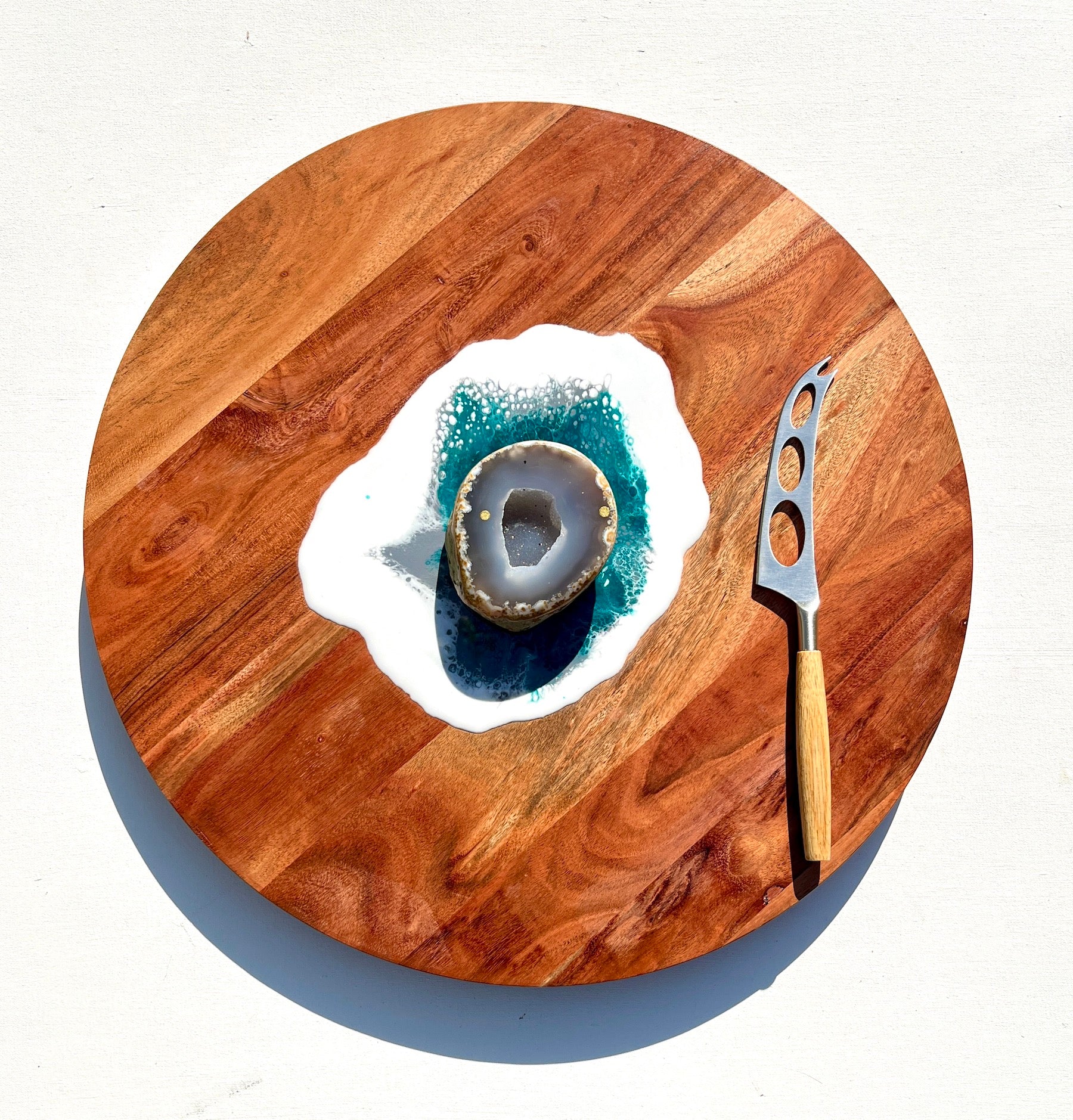 The captivating design features a vibrant colour palette of teal, grey-mauve and white with a stunning grey quartz crystal geode in its middle This is a truly unique and eye-catching centrepiece for your table. Not only does this lazy Susan board serve as a decorative element, but it also offers practicality with its smooth rotating mechanism, it allows for effortless sharing and serving of your favourite dishes, ensuring convenience and accessibility for everyone at the table.