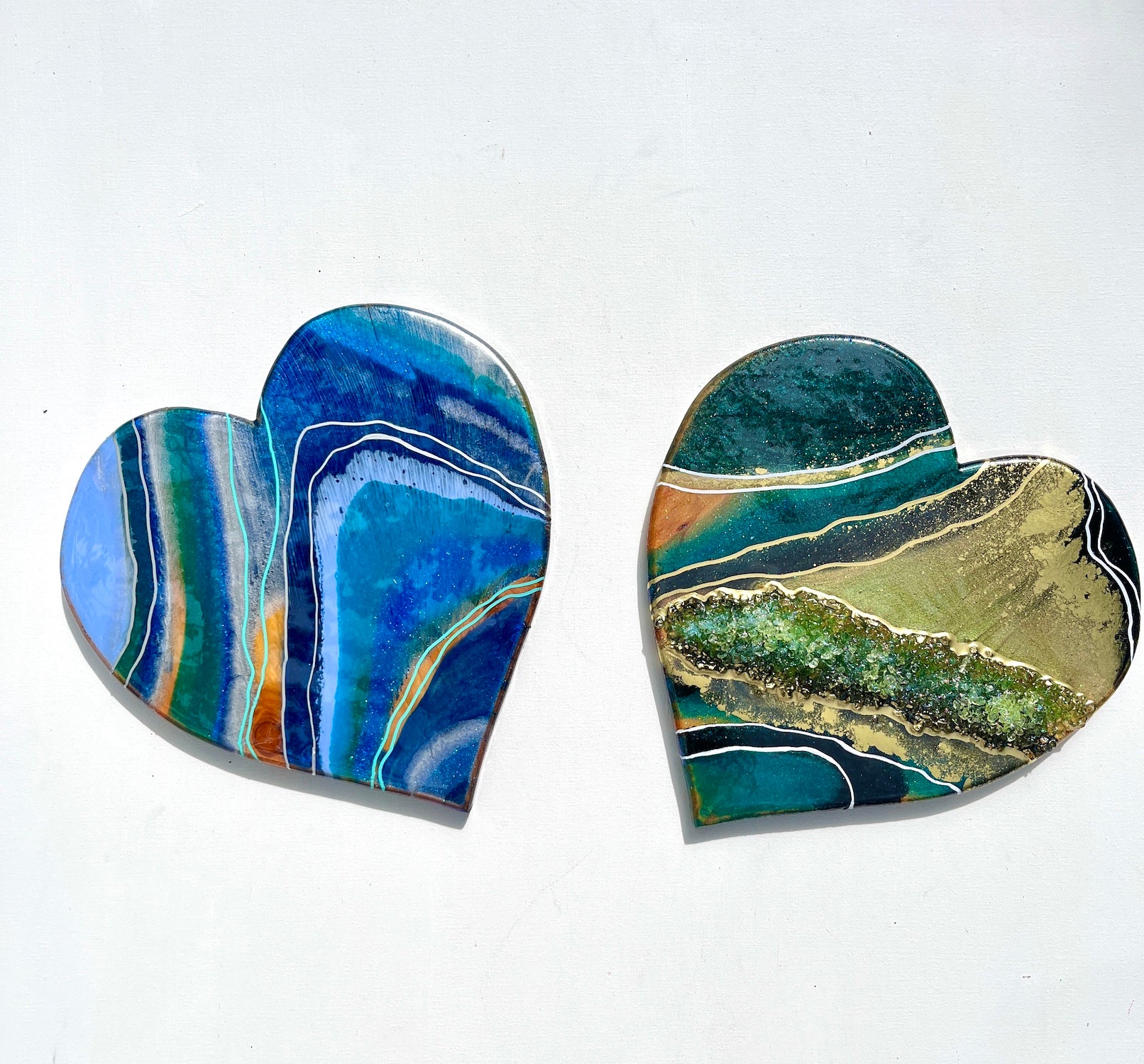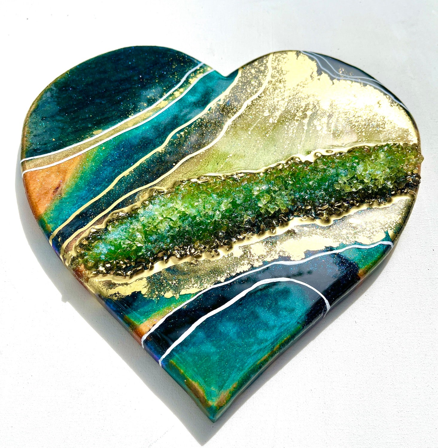 This gorgeous heart is painted in shimmering shades of emerald green with gold details. Featuring a cascade of green glass through its centre like Cupid's arrow.