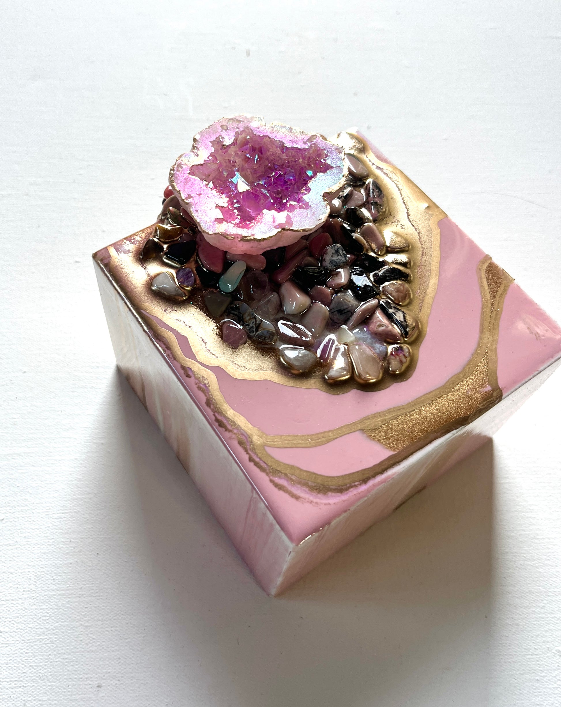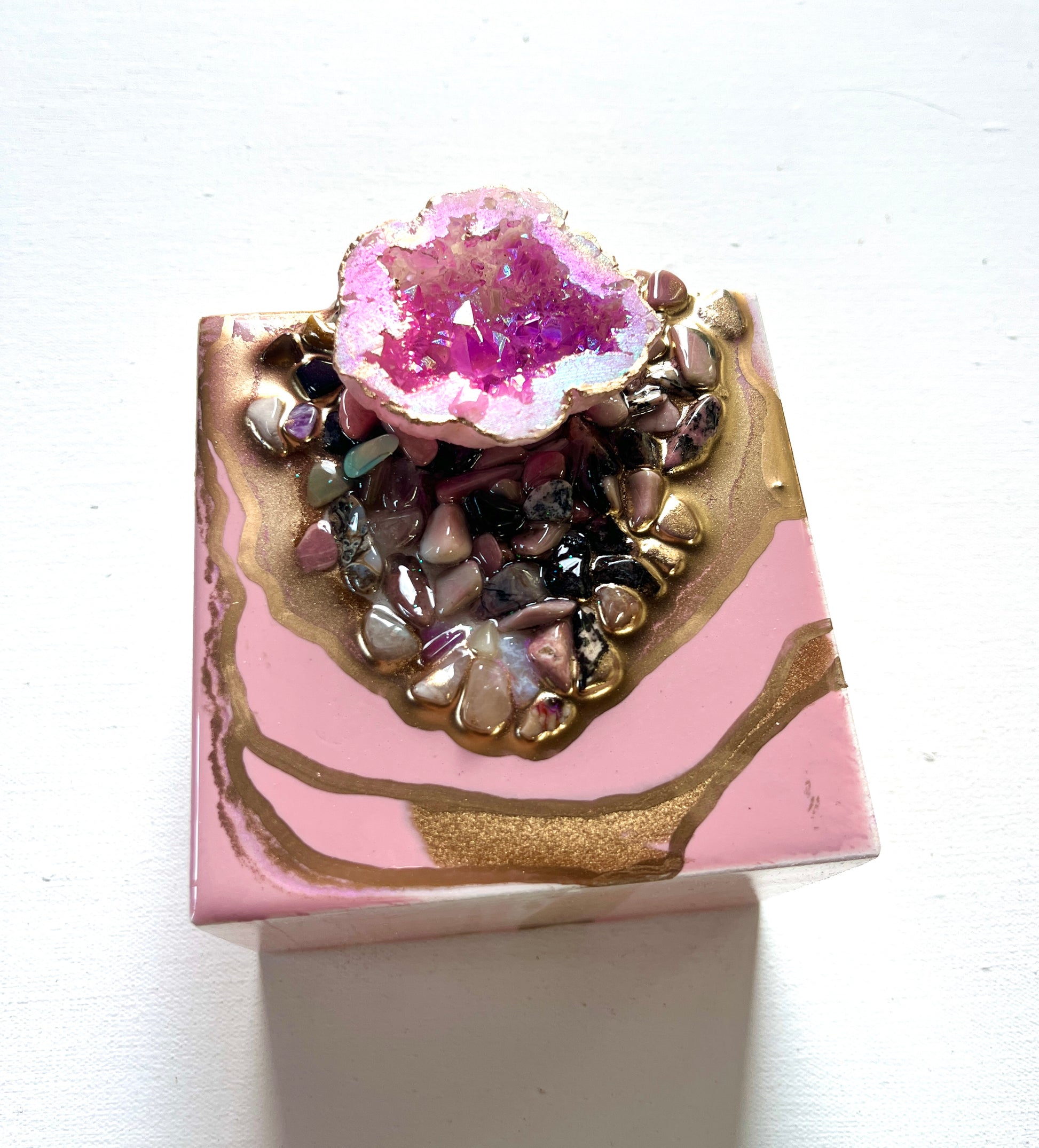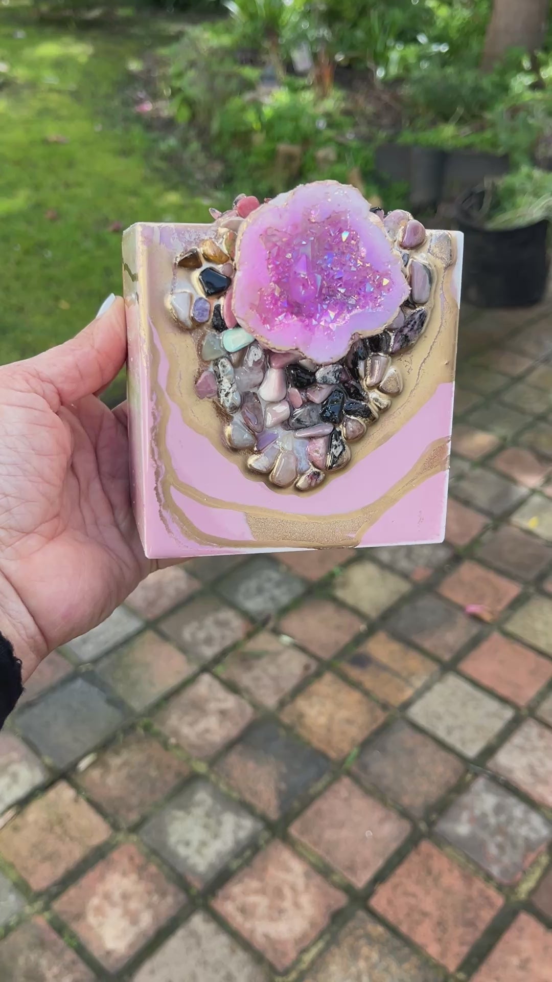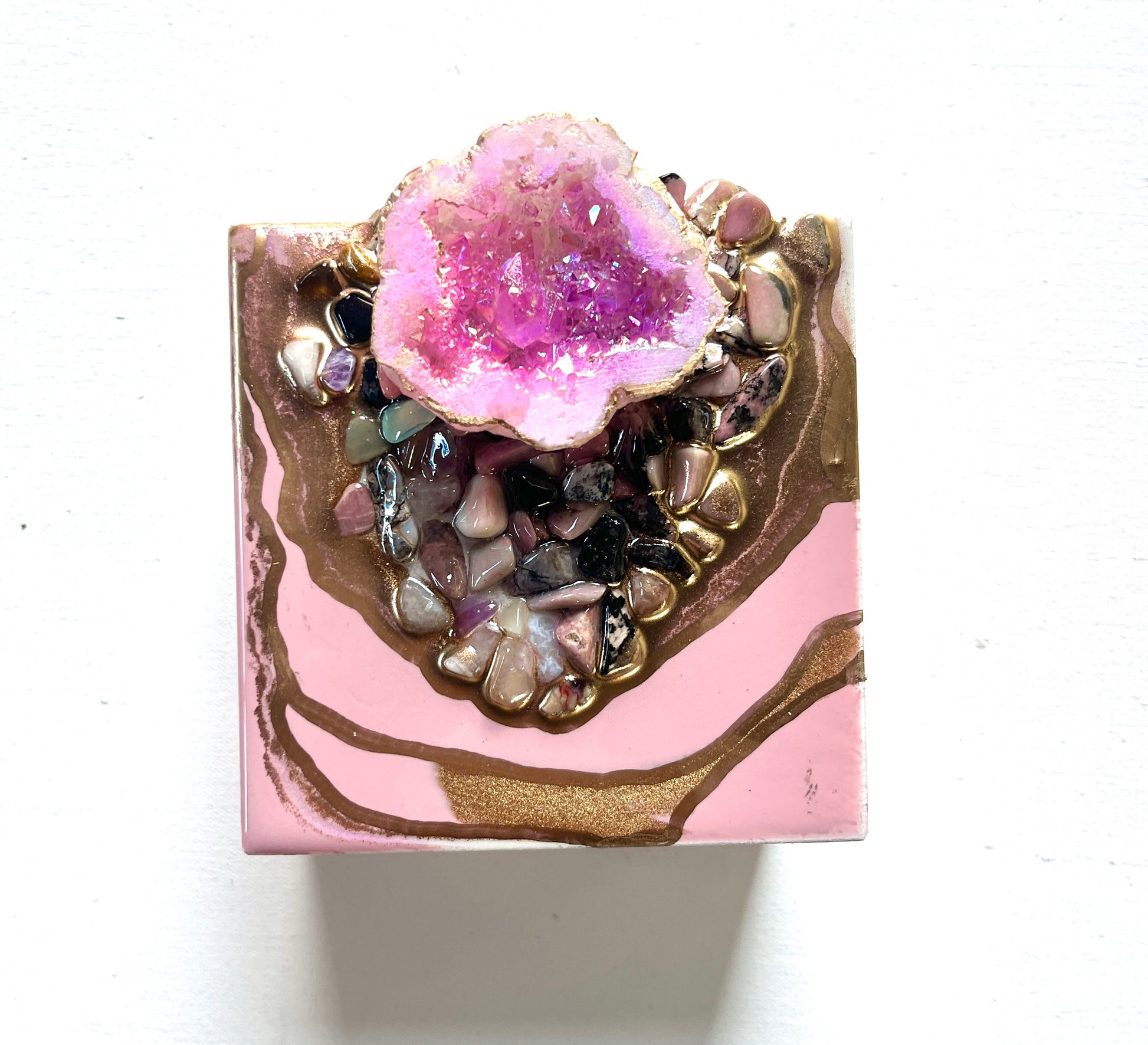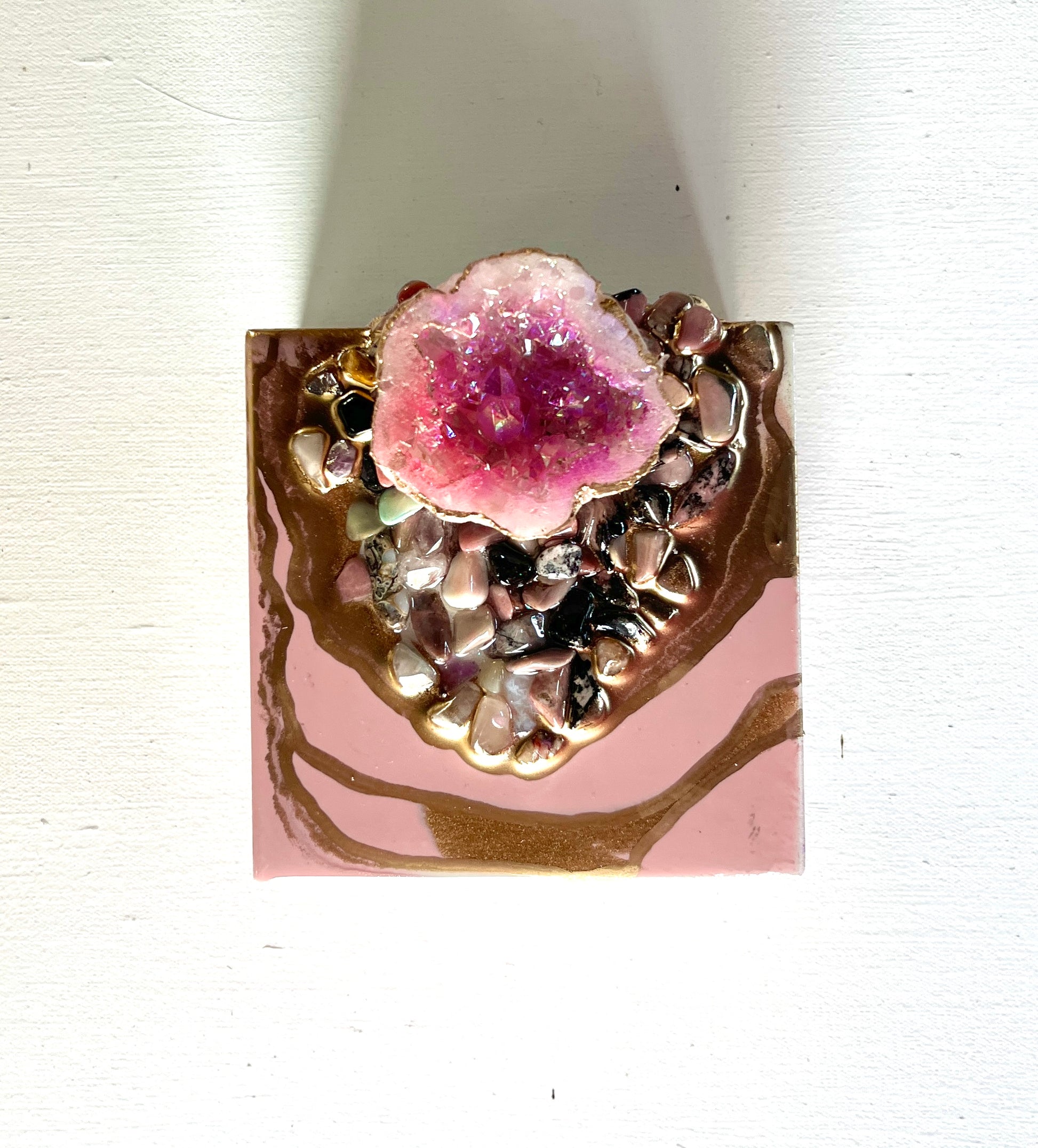 Created with love and charged with the powerful energy of a pink aura geode surrounded by a smattering of mixed gems. My Little Minis Collection is designed to either hang on a wall or to sit on a shelf or table.