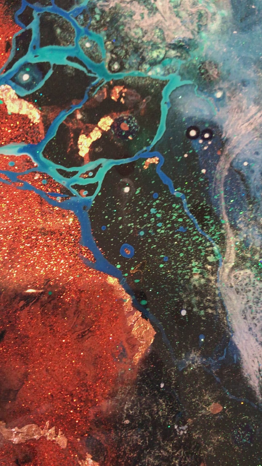 This fluid acrylic painting uses teals and cerulean blues together with dramatic copper and earth tones, surrounded by captivating white bubbles.