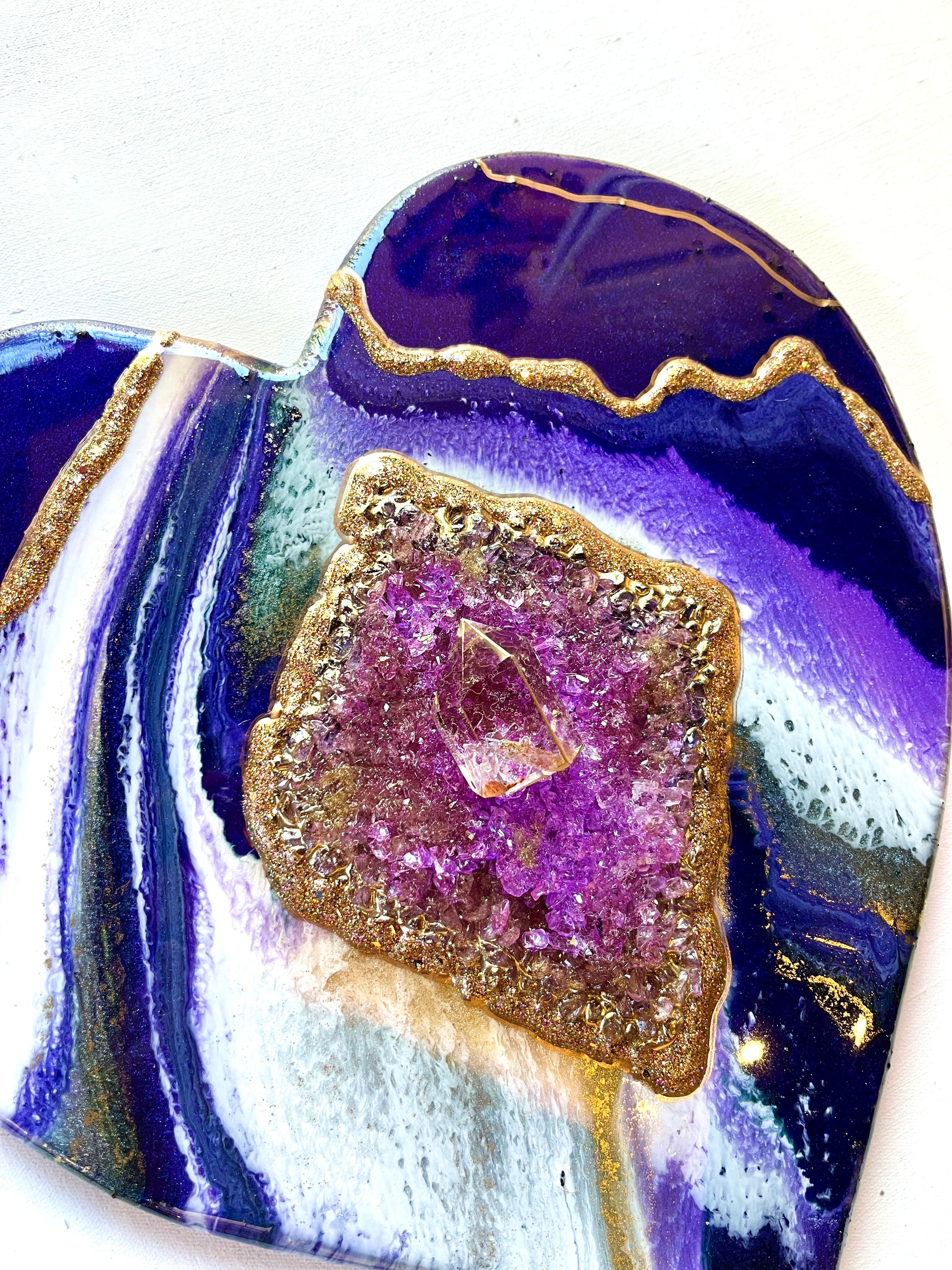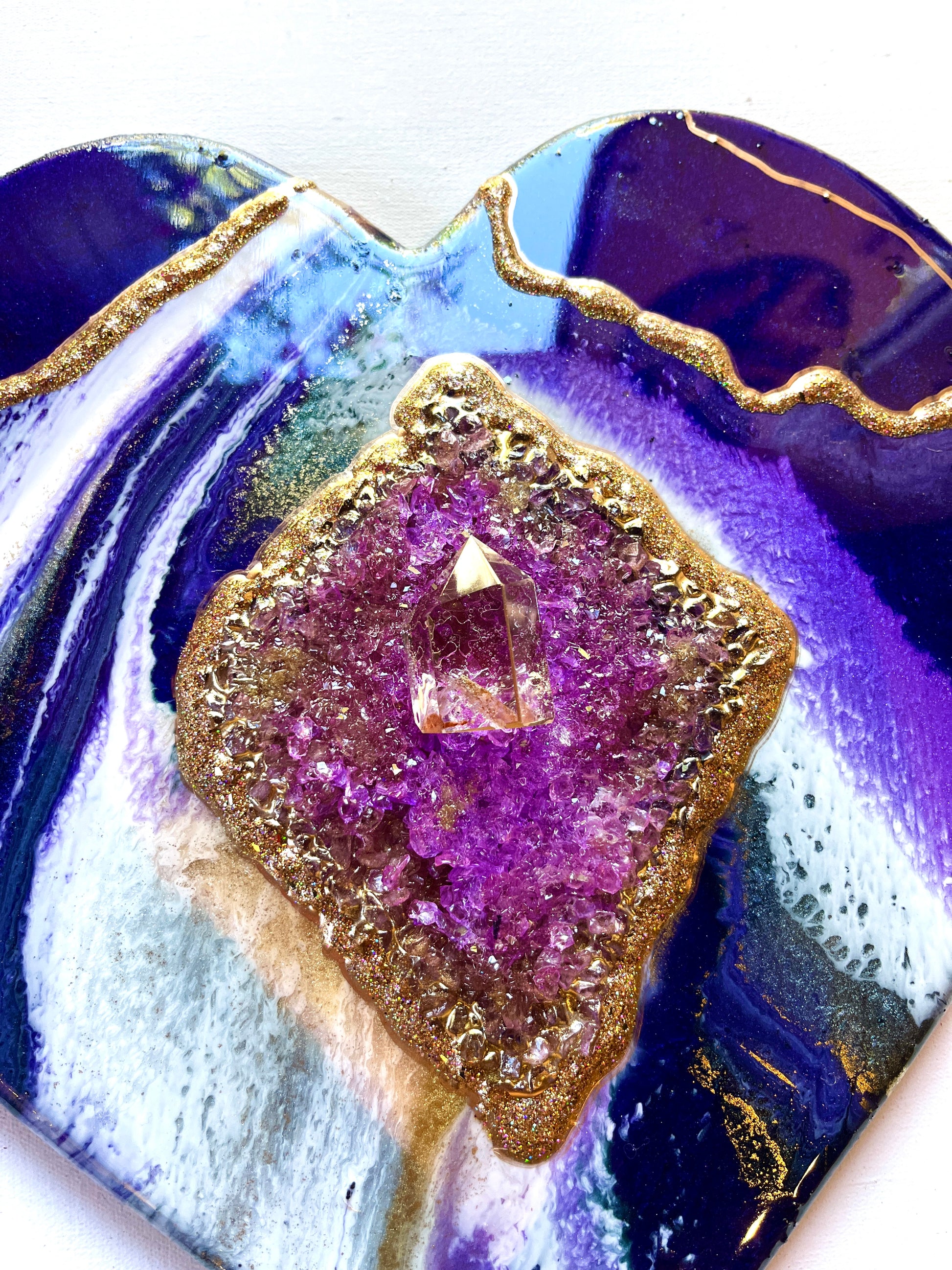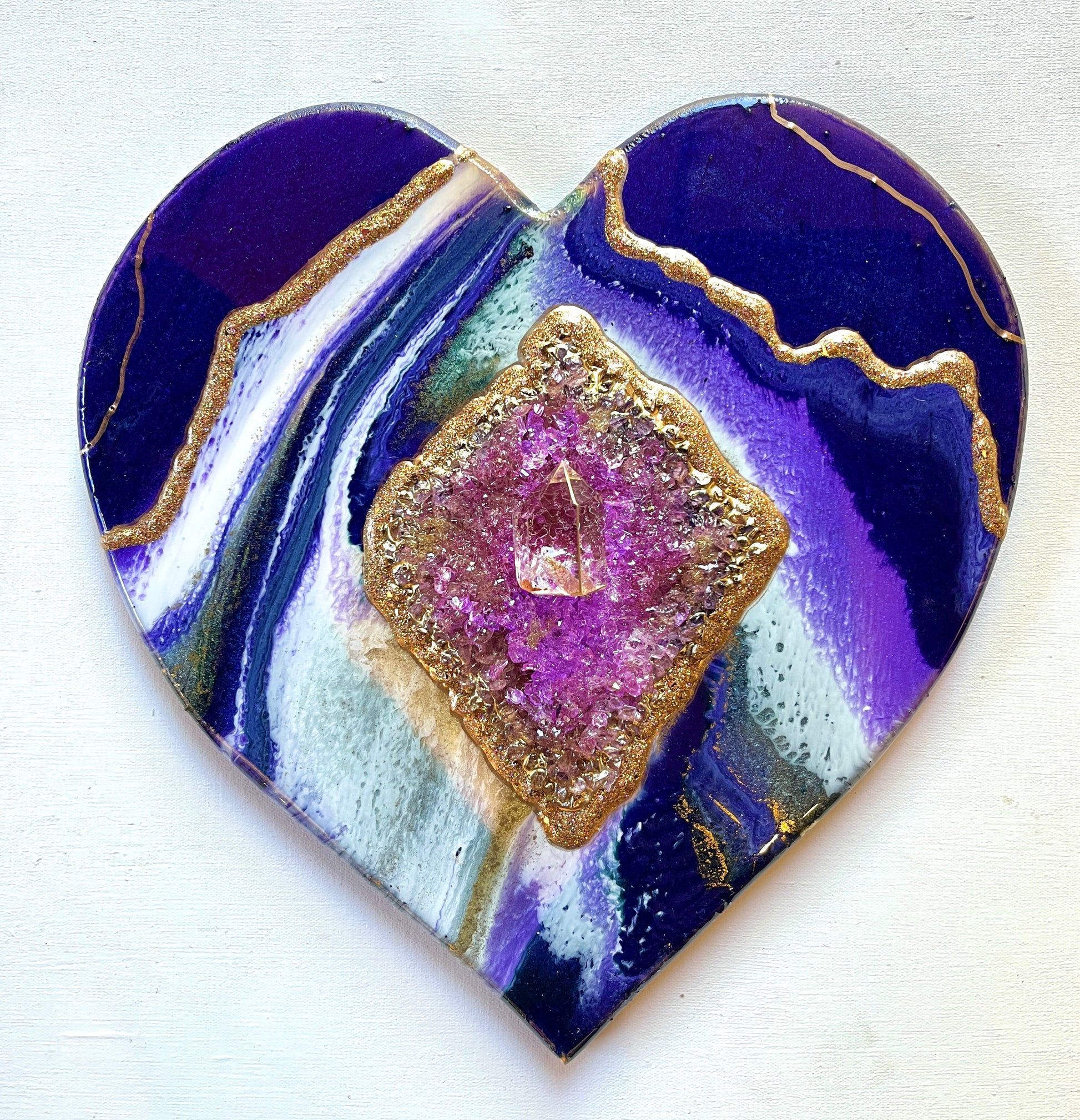 This beautiful custom made heart depicts a diamond shaped centre made with purple glass and nestling at its centre, a stunning smokey quartz point.