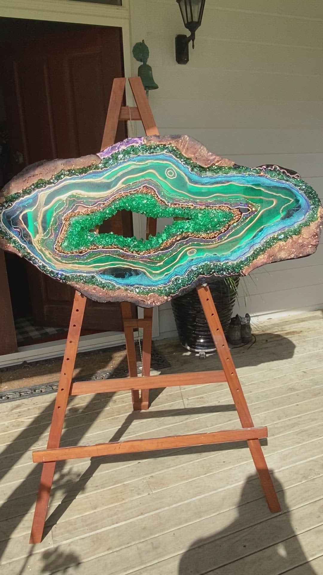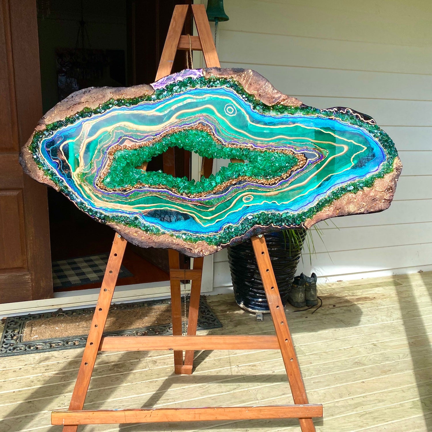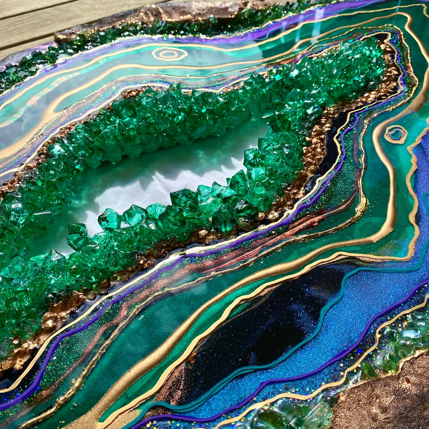Submerge yourself in this free-form geode artwork, painted in soothing shades of green with violet and golden lines. Main features are the green acrylic crystals and 3 stunning genuine rainbow Swarovsky crystals as well as gold leaf lines.