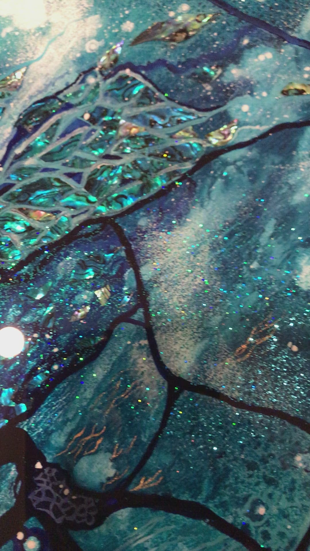 With shimmering lights filtering to its depths and stunning genuine abalone shell embedded within. Uses deep ultramarine blue, teals and gold. Detailed line work representing the moving water.