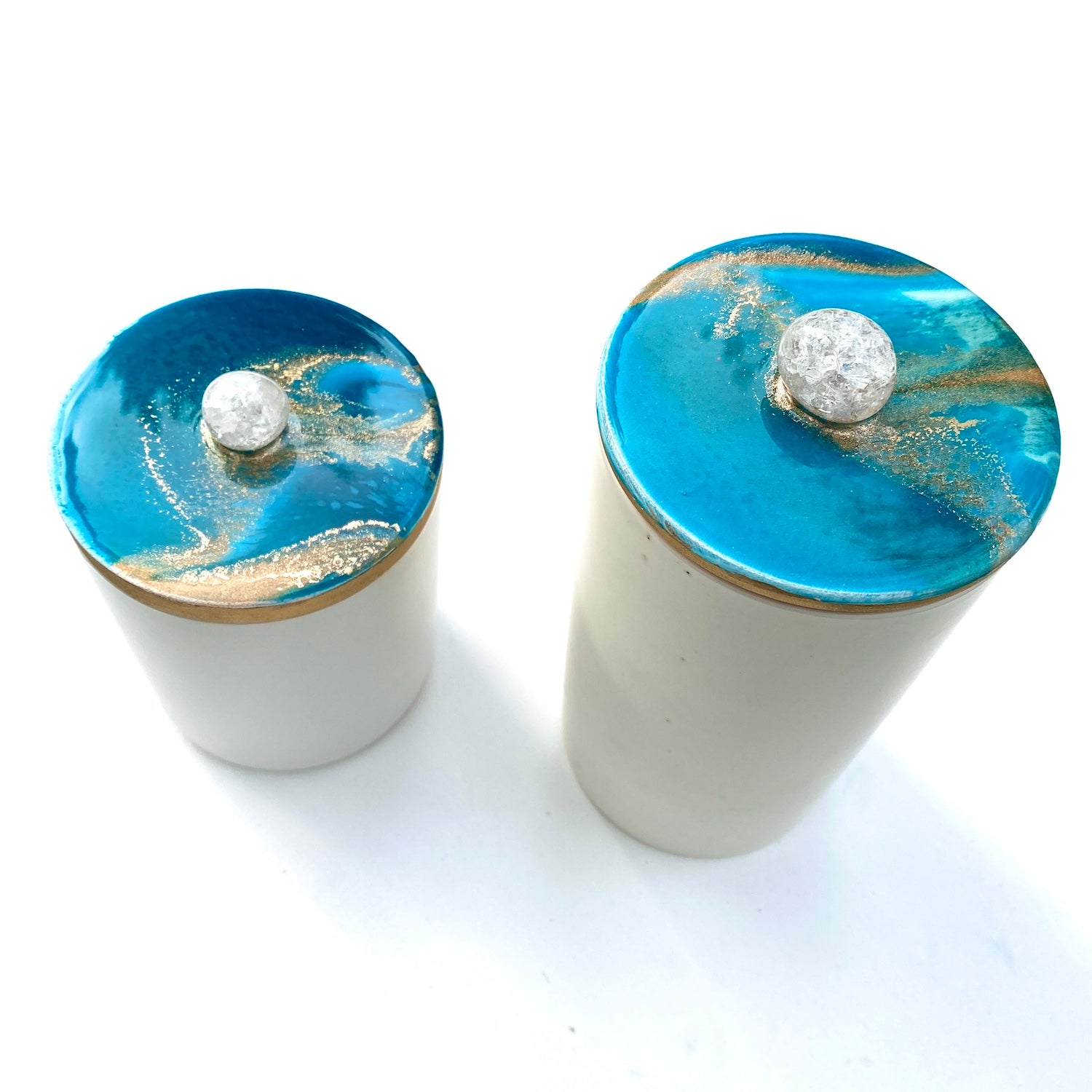 Inspired by the beautiful beaches of Fiji and painted in shades of teal with gold accents. This jars feature a beautiful cracked crystal quartz gem at the centre.