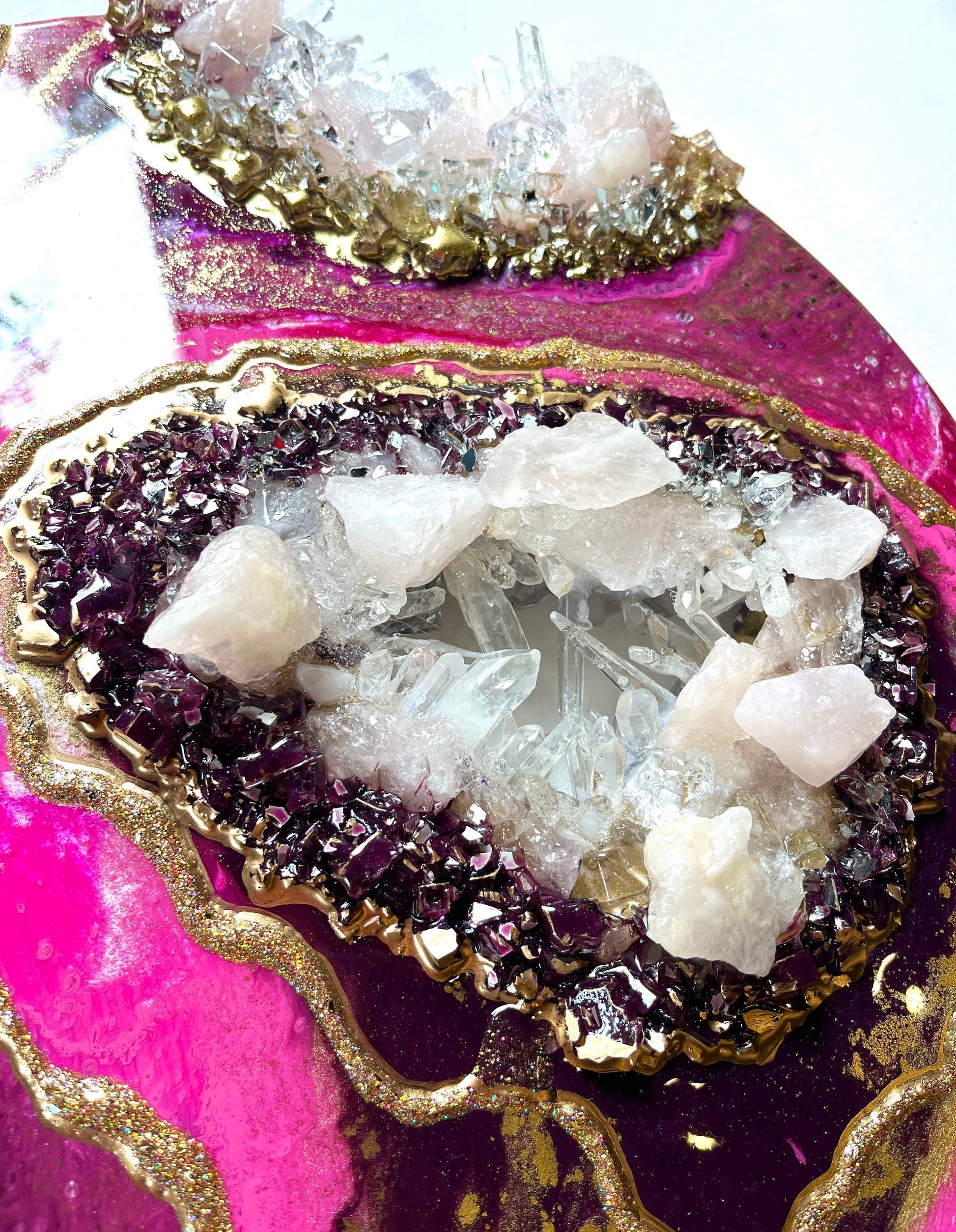 Features details with genuine crystal quartz points and rose quartz gems, embedded within.
