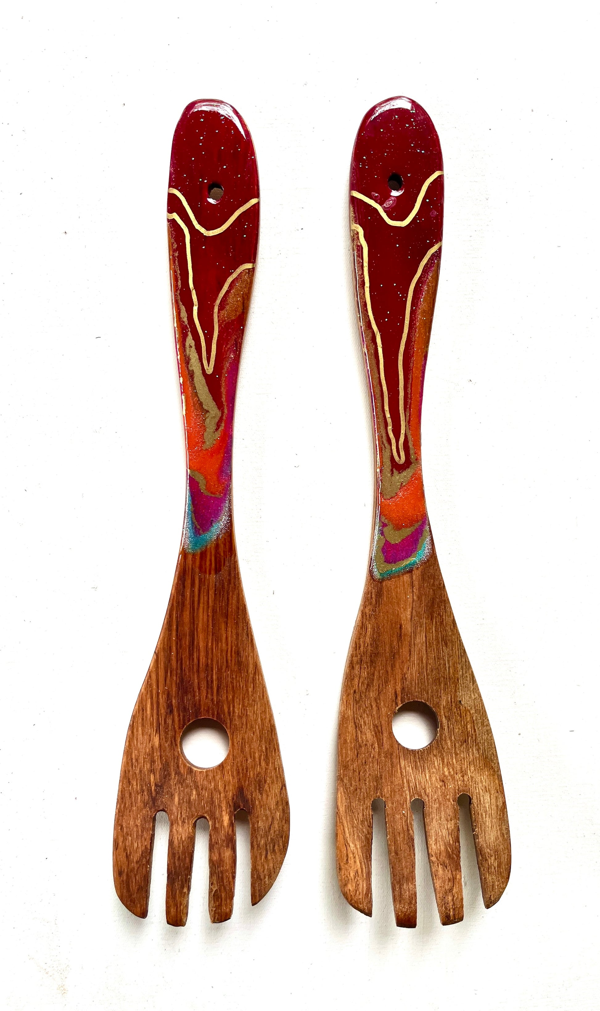 Custom made spoons, painted in red, pink, orange and teal with golden accents.