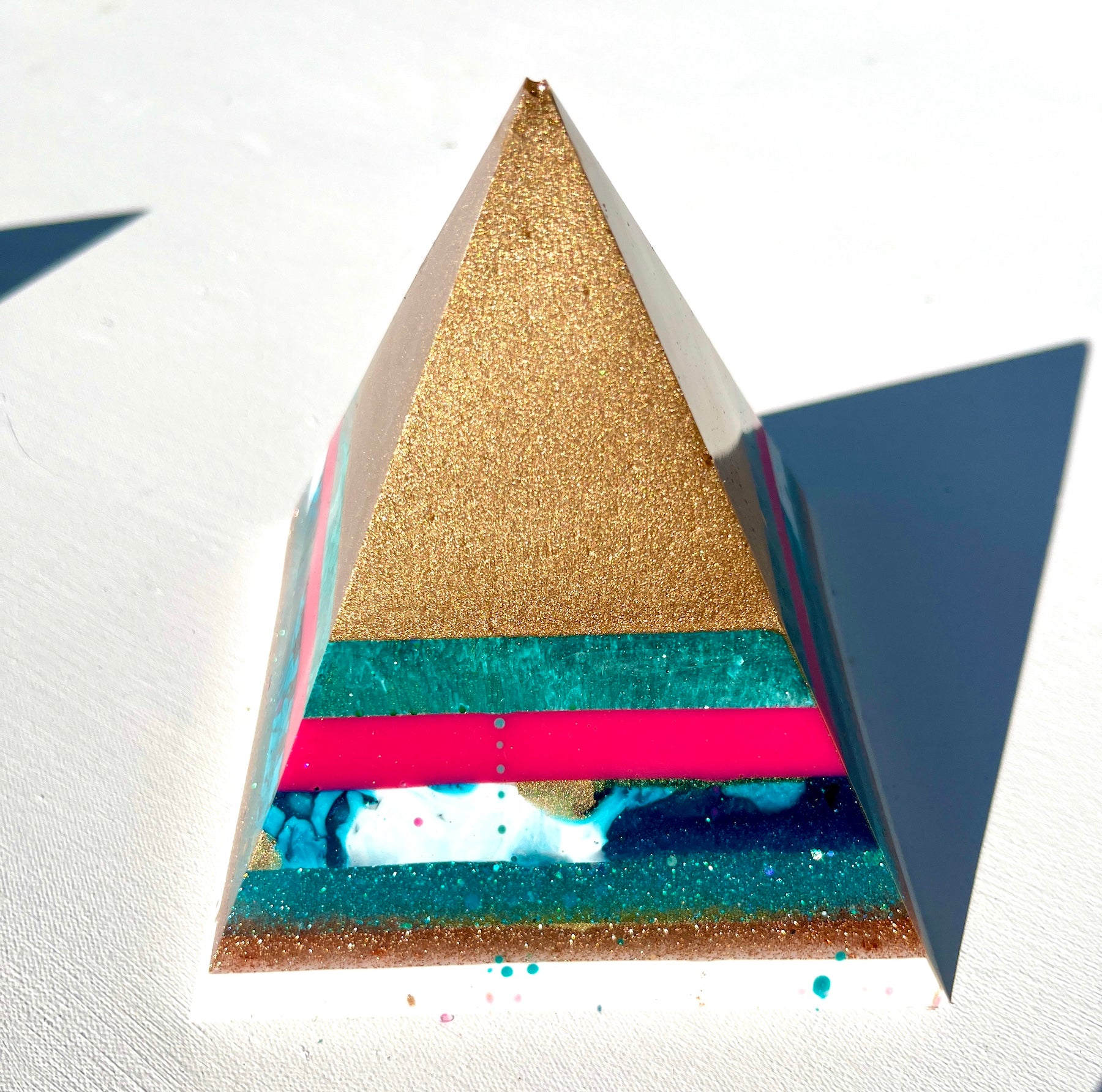Adorned with a stunning array of colors, including vibrant teal and hot pink, this pyramid is a visual delight. Its vibrant hues add a touch of vibrancy and joy to any setting. Whether used as a paperweight or a simple ornament, it effortlessly enhances the ambiance of your home.