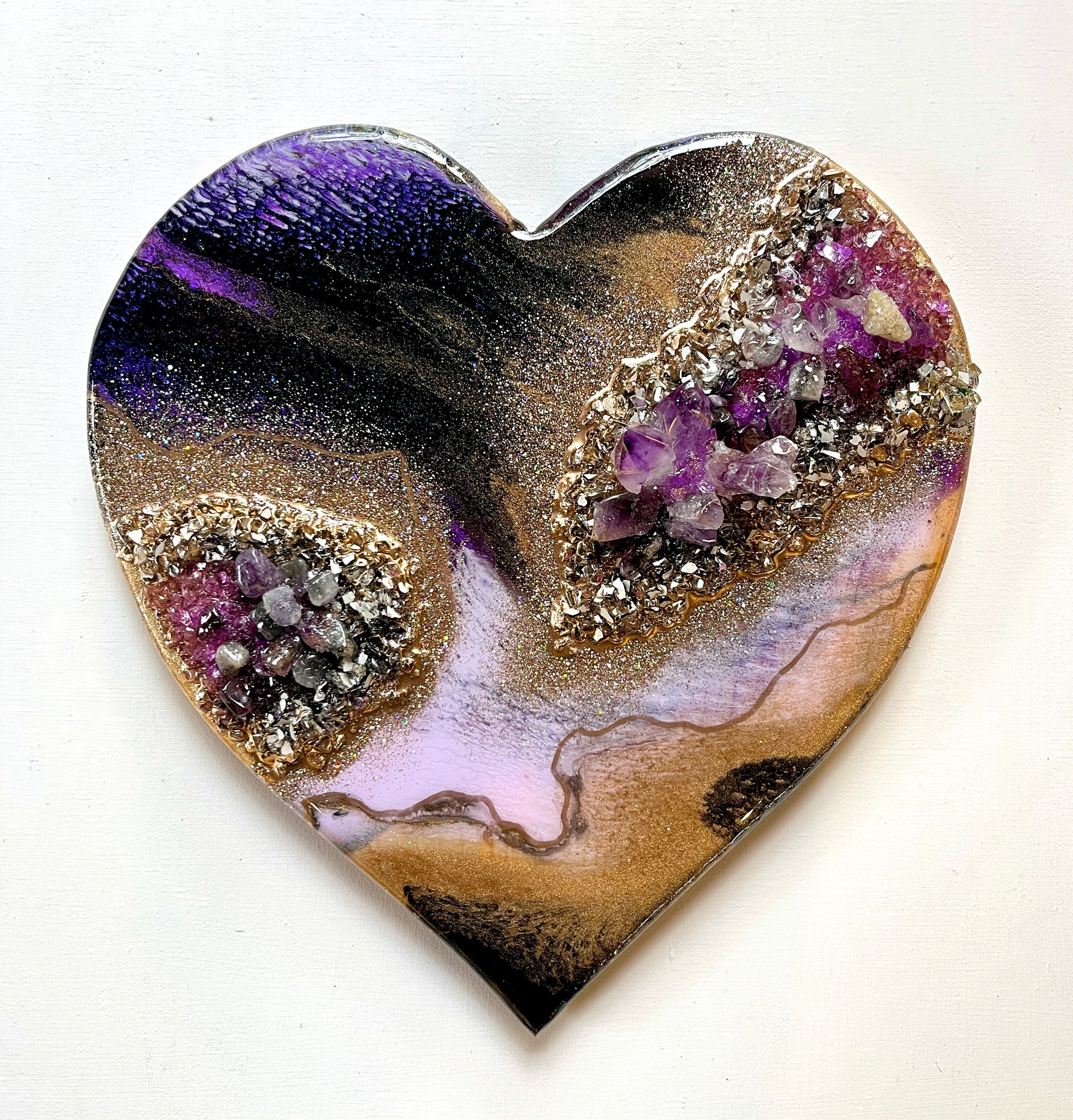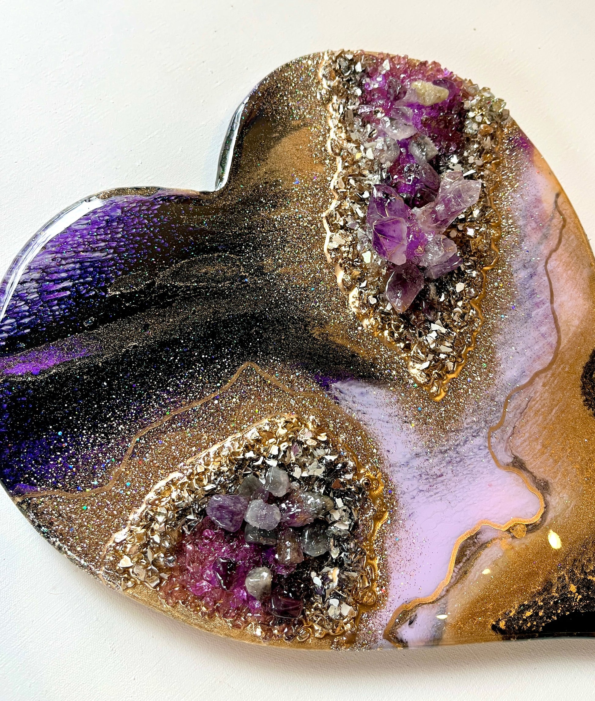 This custom made heart is painted in shads of lilac, gold and deep violet with stunning details in amethyst gems and glass..