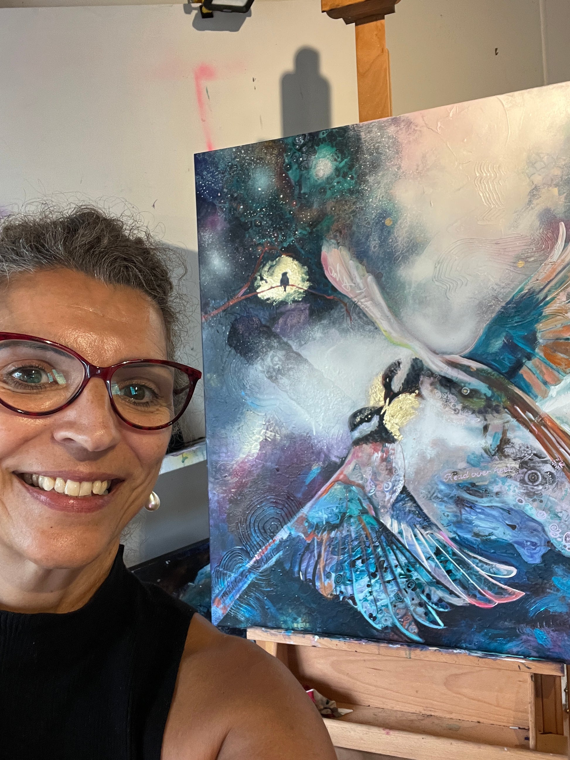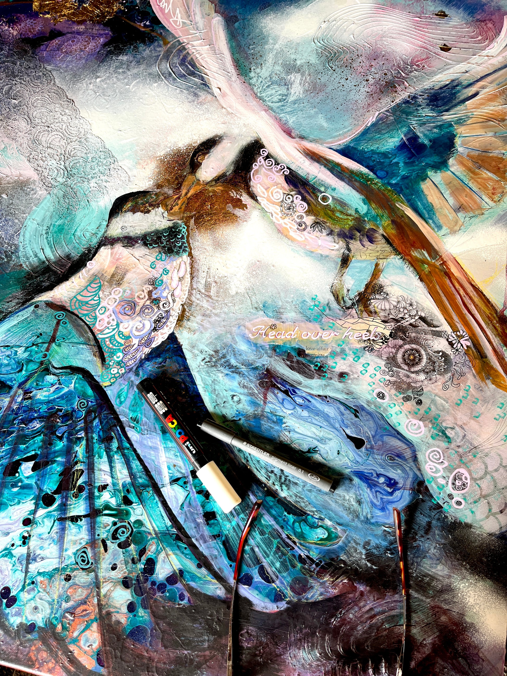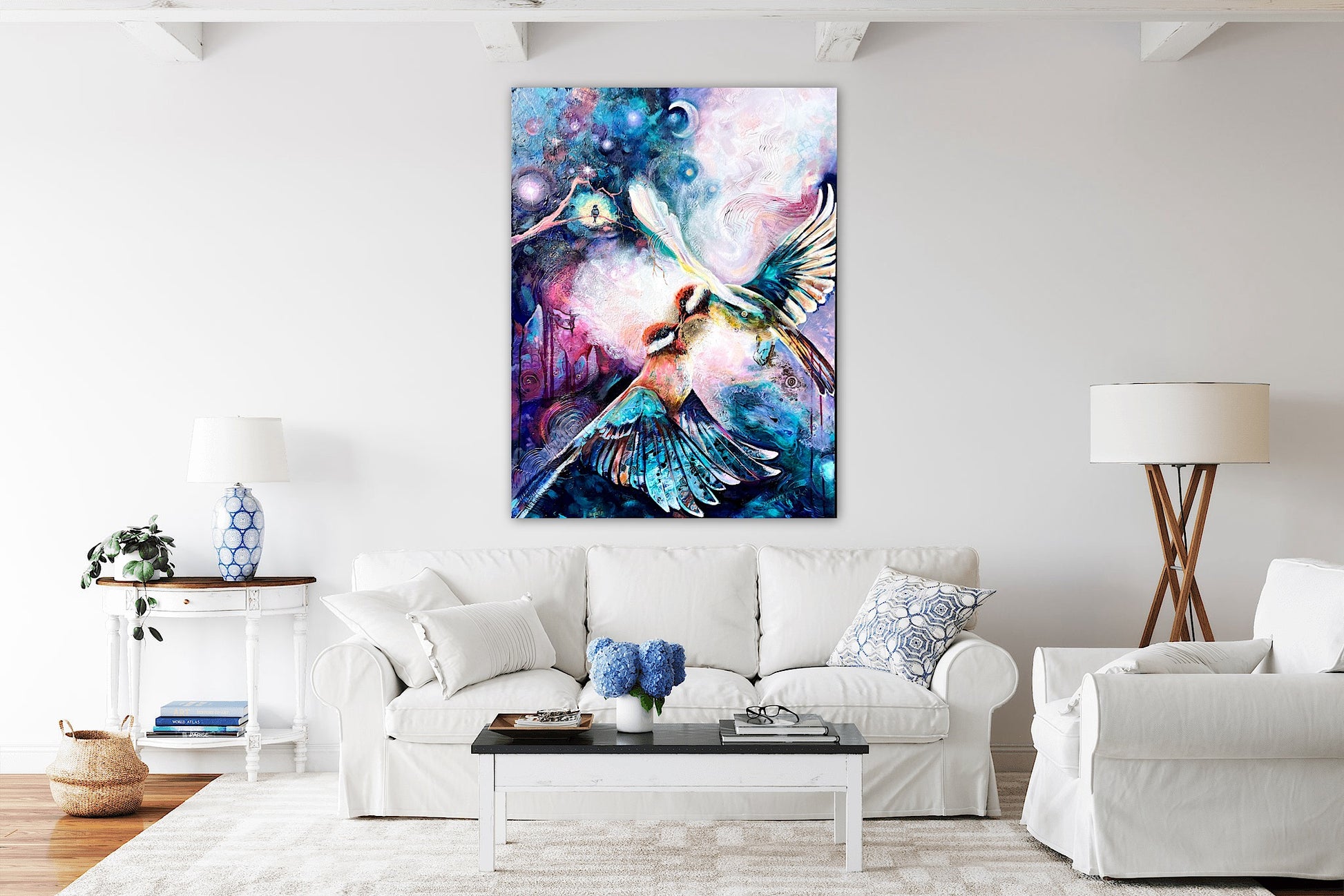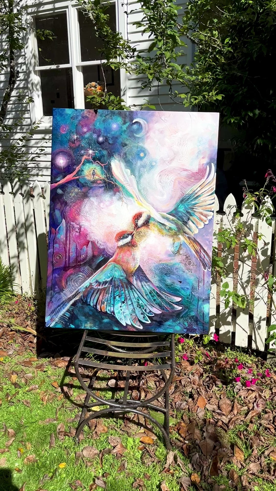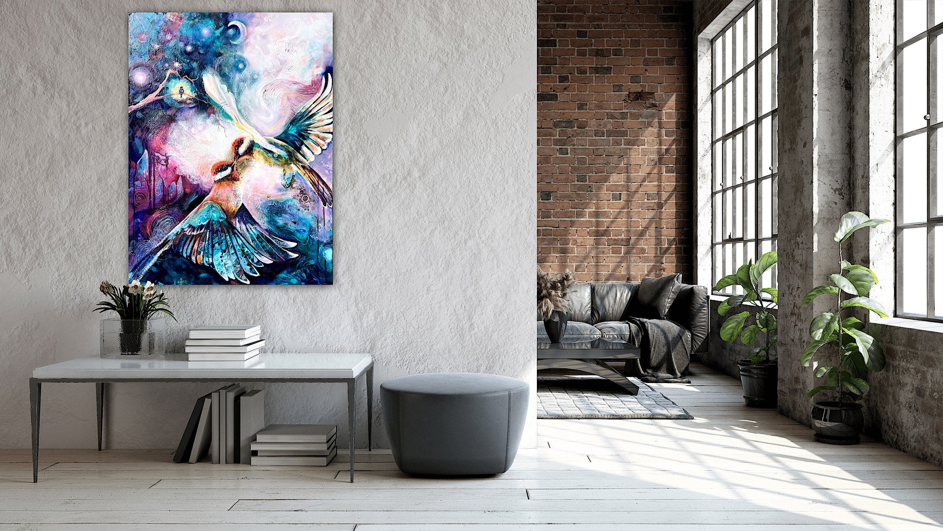 - This captivating mixed media and oil painting captures the tender moment of two birds kissing mid-air, their delicate forms brought to life in soothing tones of blues and turquoise, accented with touches of light lilac and orange. The subtle shimmer of gold leaf highlights the intimate connection where their beaks meet, adding a touch of luxury and ethereal beauty to this enchanting piece. A perfect statement artwork for any space, inviting serenity and romance into your home."