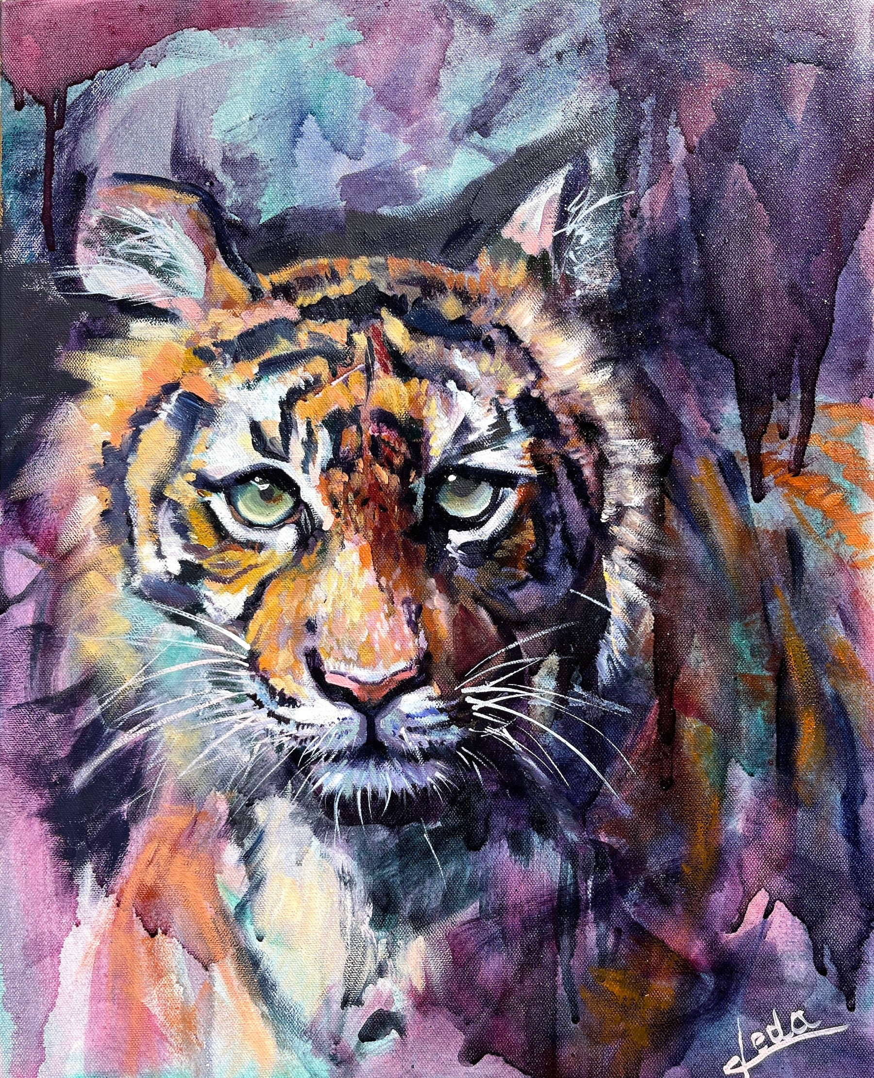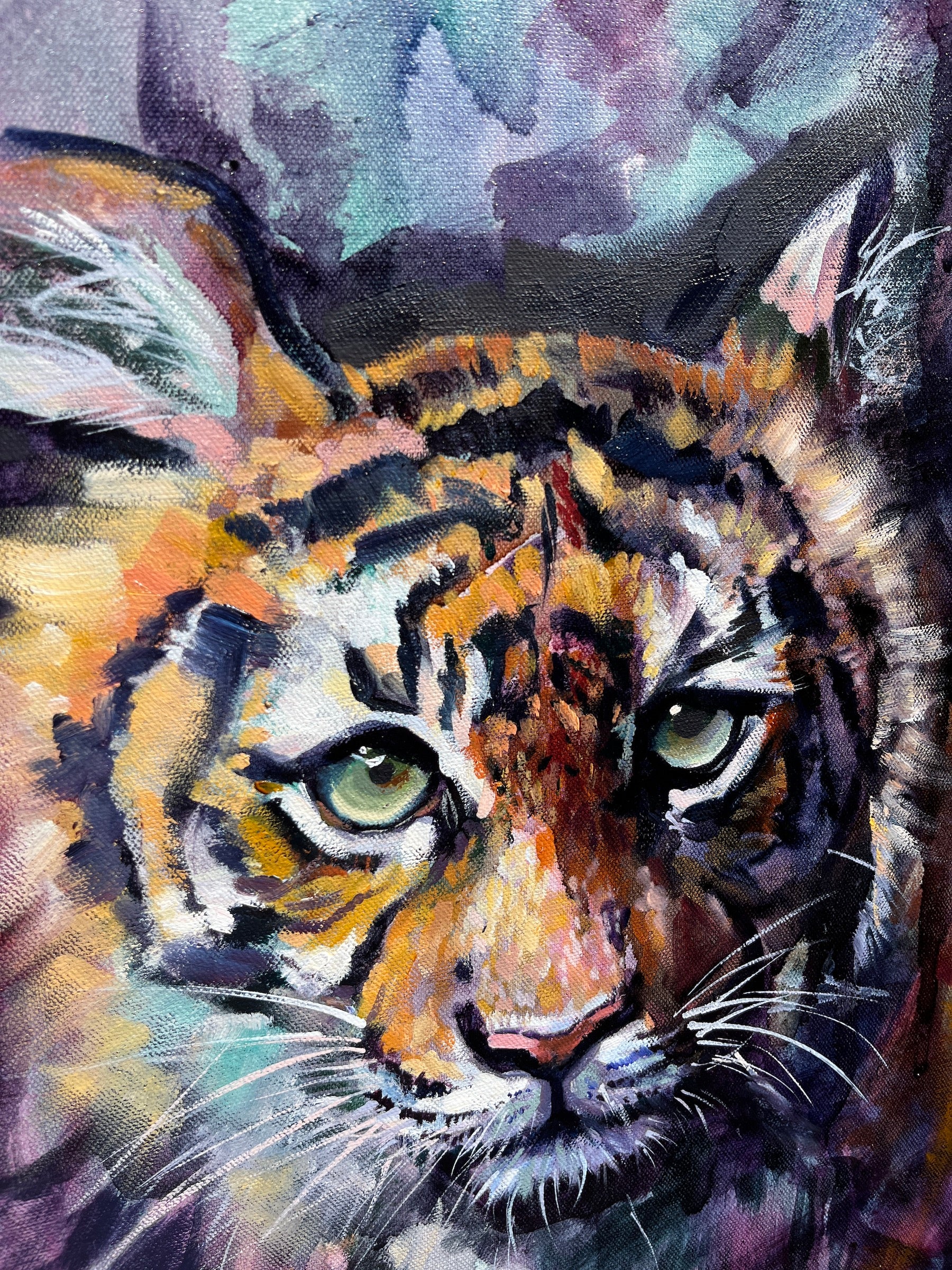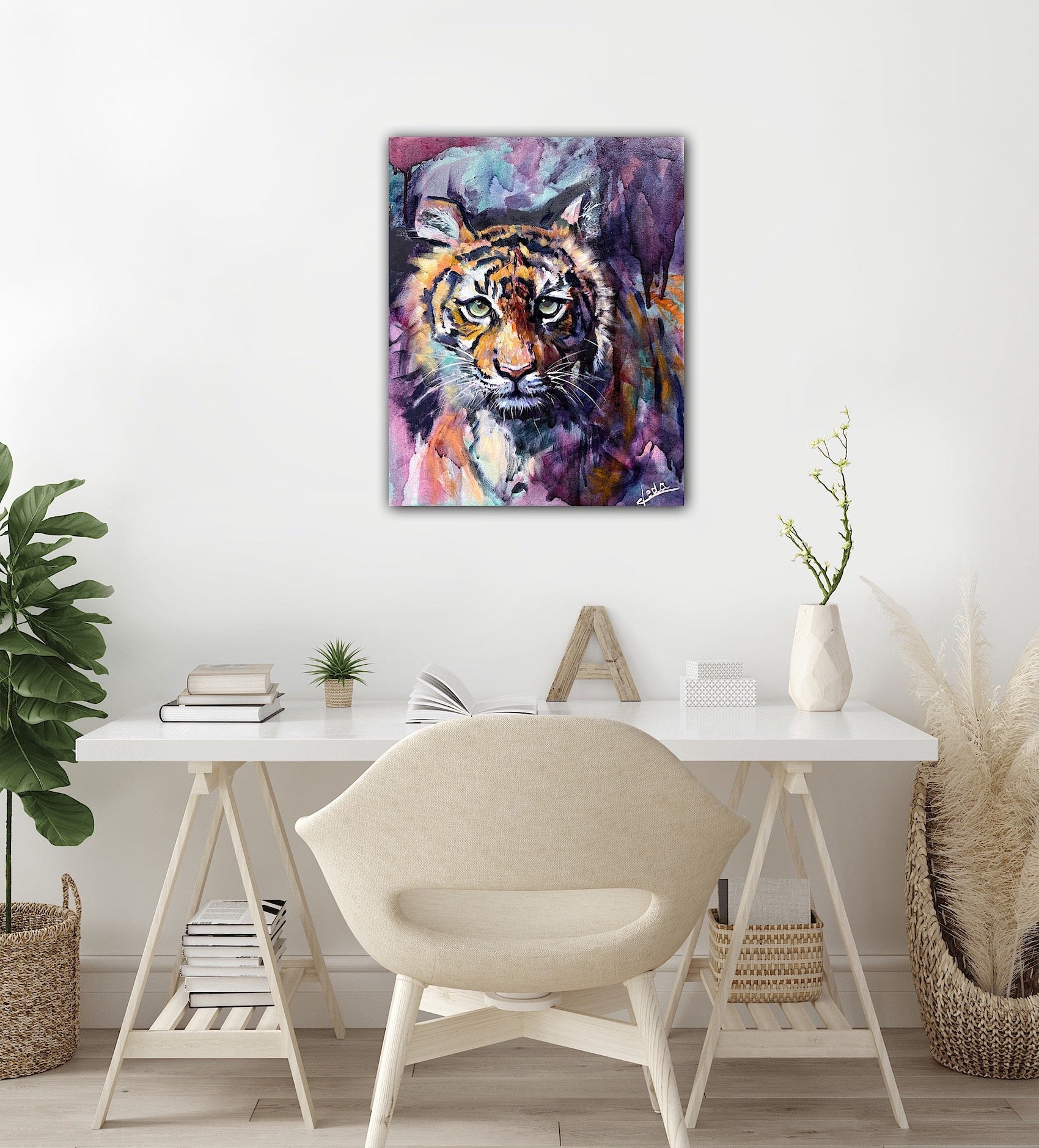 This stunning work of art has been meticulously painted with deep and luscious oil paints, featuring a mesmerizing palette of purple, orange, blue, and green accents. The expert use of colors and strokes imbues the tiger with an almost tangible sense of power and grace.