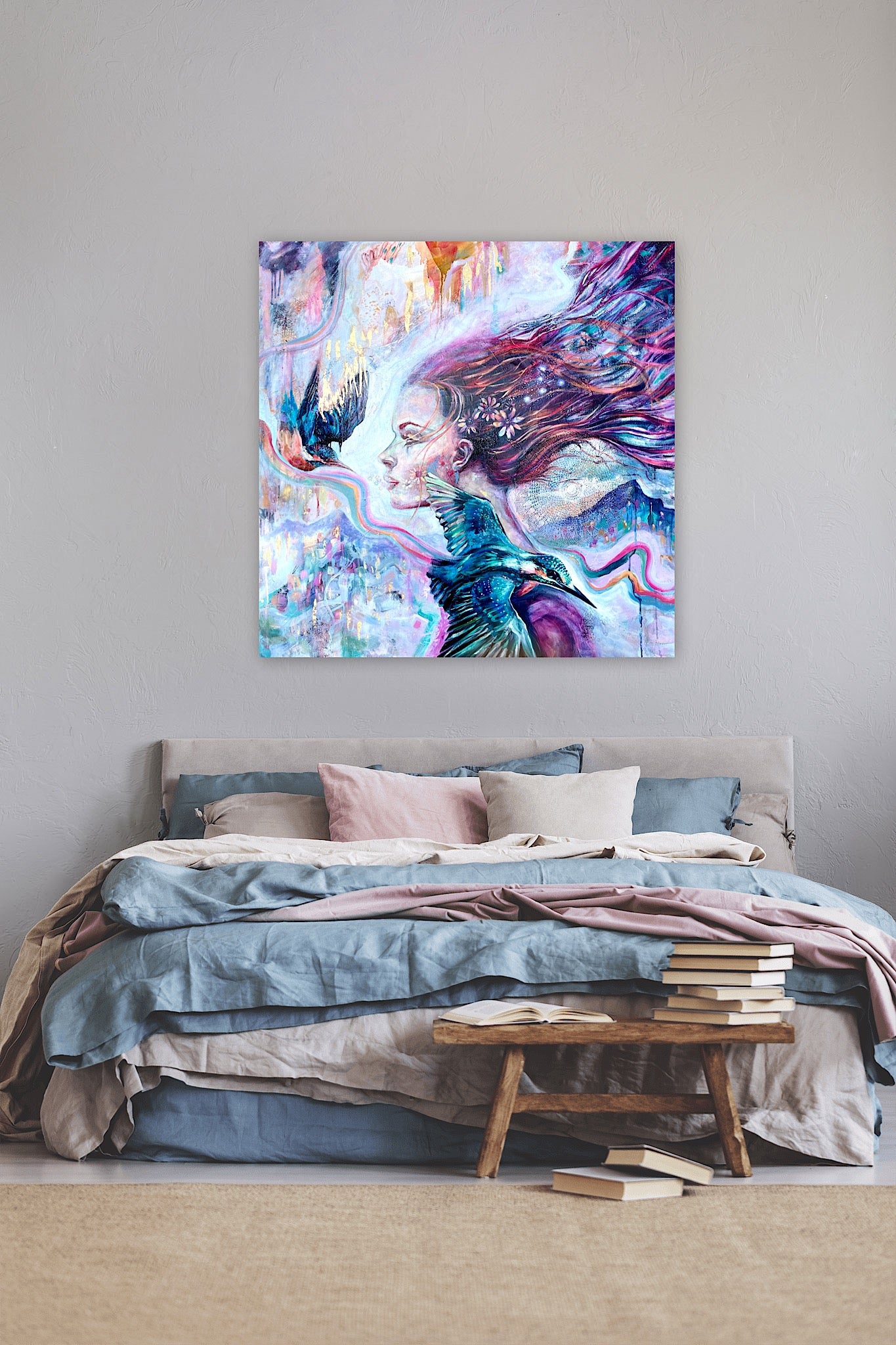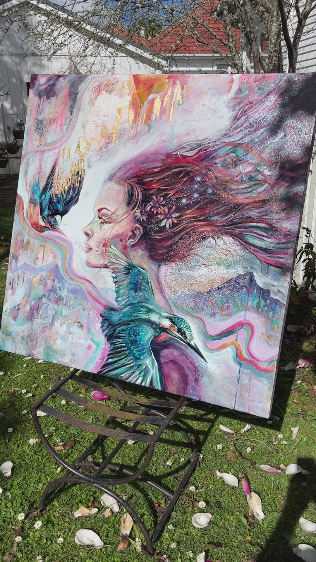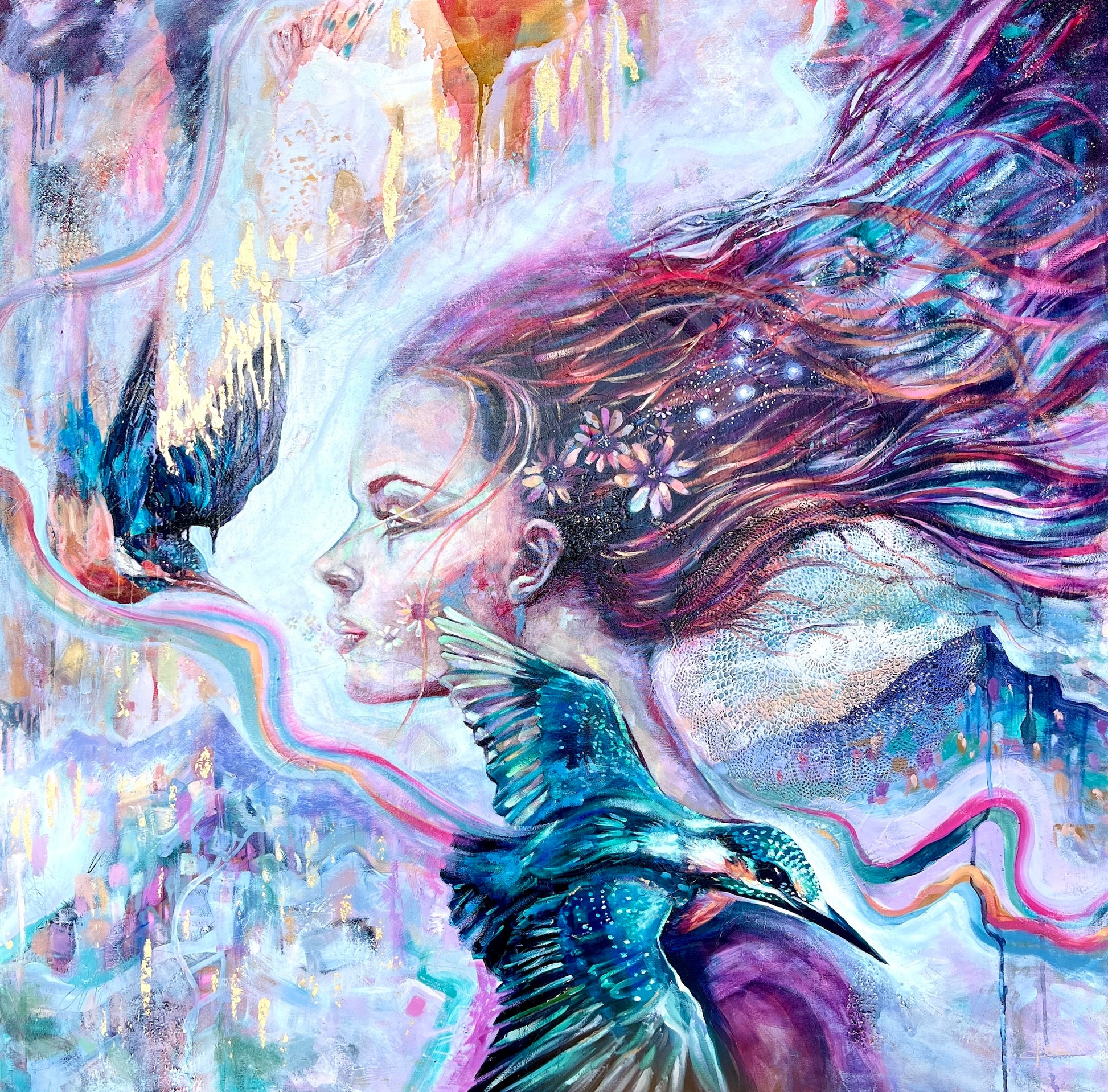 The woman embodies the essence of unity with the natural world, her hair swept by the wind suggestive of the fluidity of our existence. The two kingfisher birds are swooping past her in a dance of mutual admiration and respect.