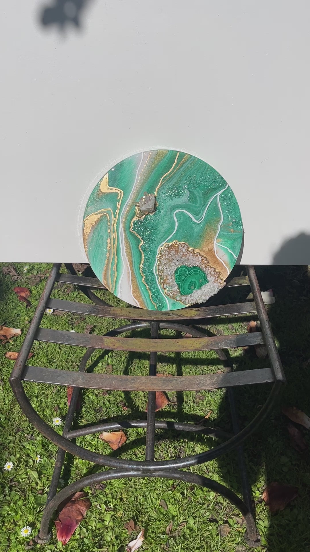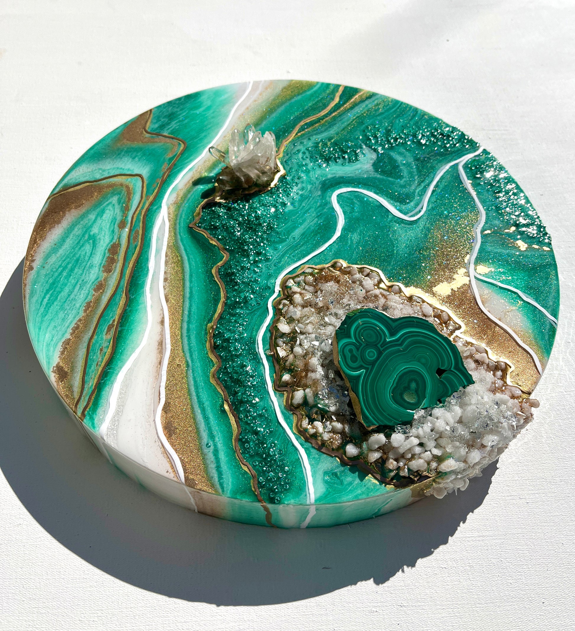 Immerse yourself in the serene beauty of this custom made painting painted in shades of green that evoke a sense of peace and harmony while delicate white lines and gold accents add a touch of opulence to this piece. The focal point is a breathtaking malachite agate, symbolising transformation and joy, resting gracefully in a bed of pure white river stones. Also features a beautiful crystal quartz cluster further enhancing the serenity of this piece.