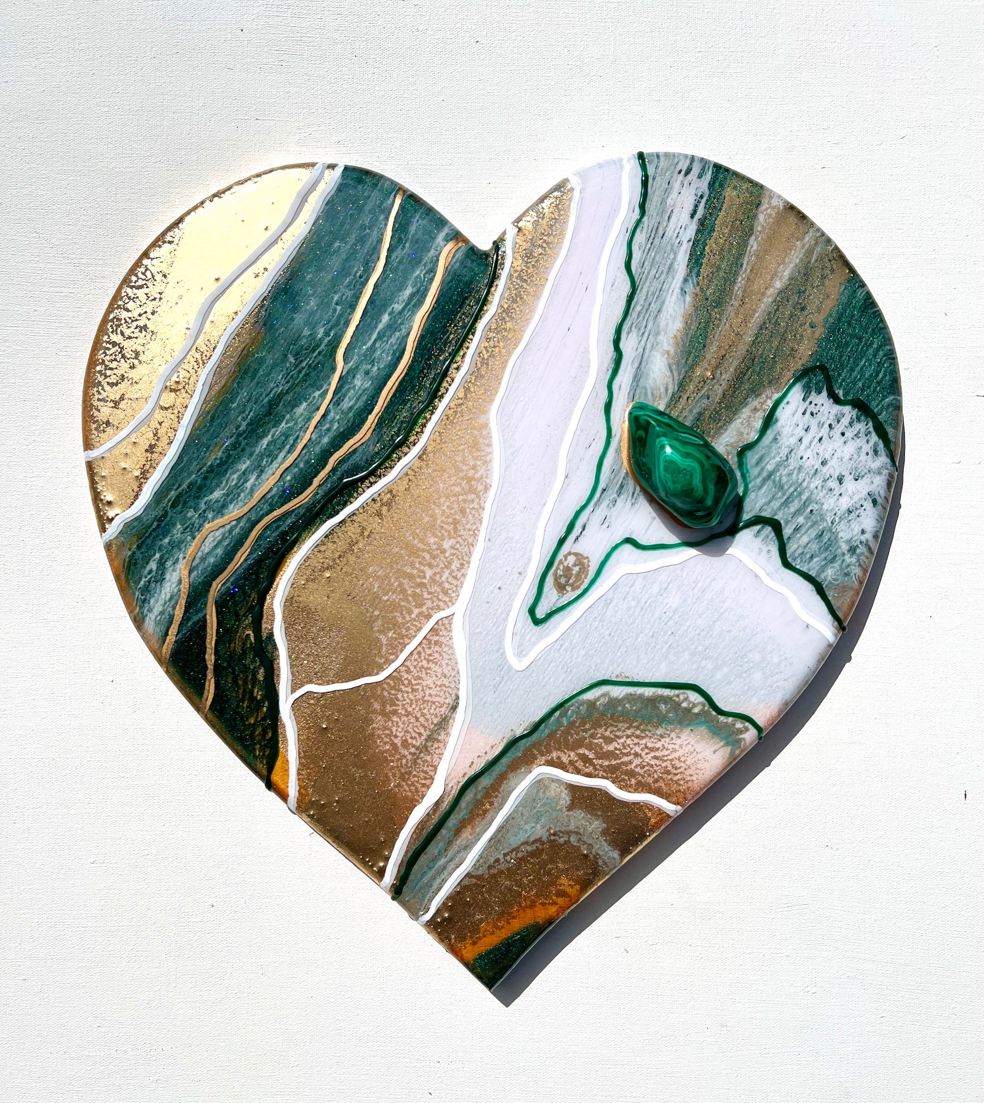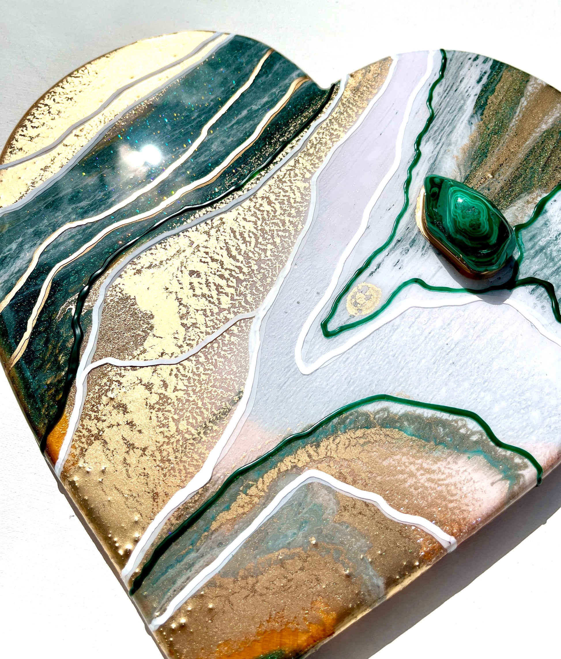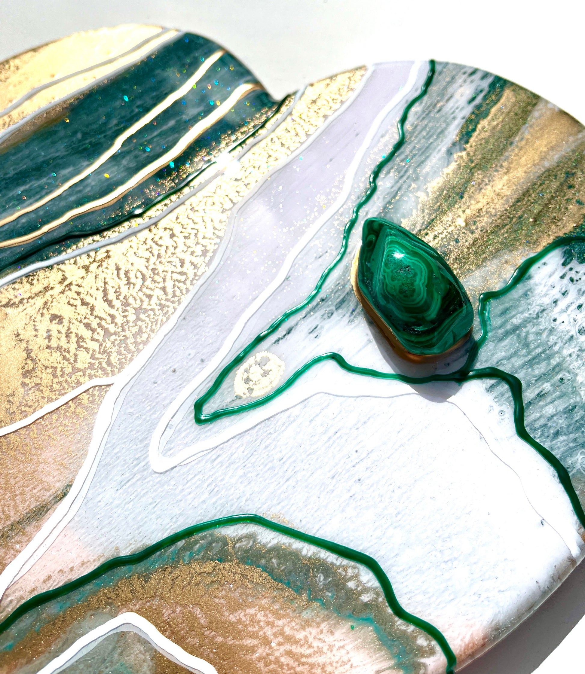 This captivating piece is adorned in shades of green, gold and white, creating a harmonious symphony of elegance. The centrepiece of this creation is a stunning malachite gem. Embrace the essence of love and sophistication as you showcase this beautiful piece.