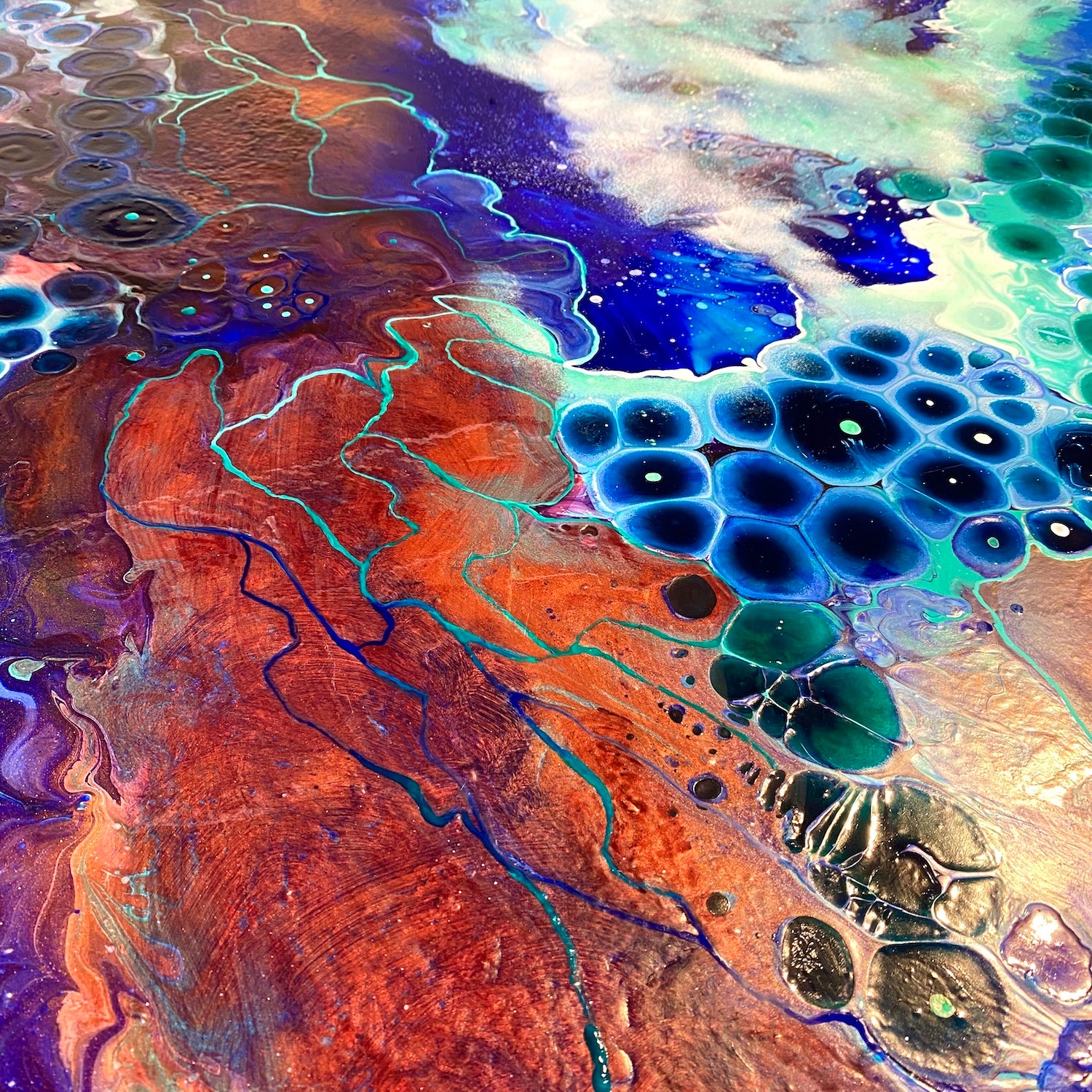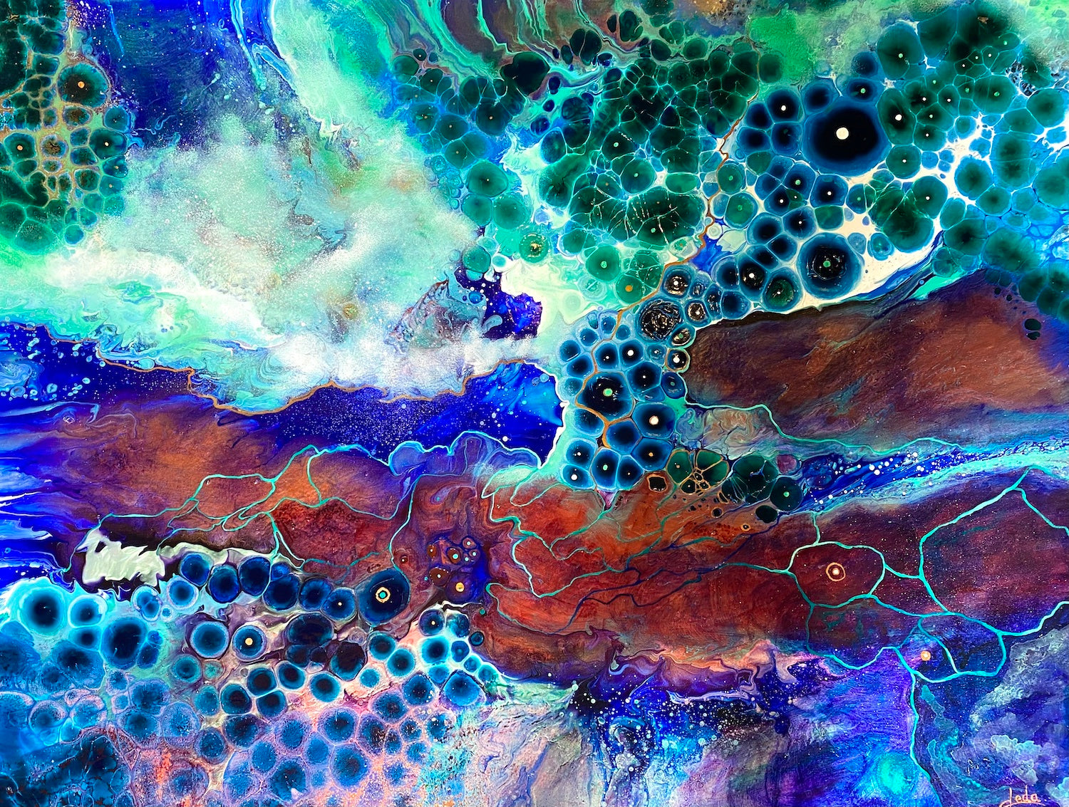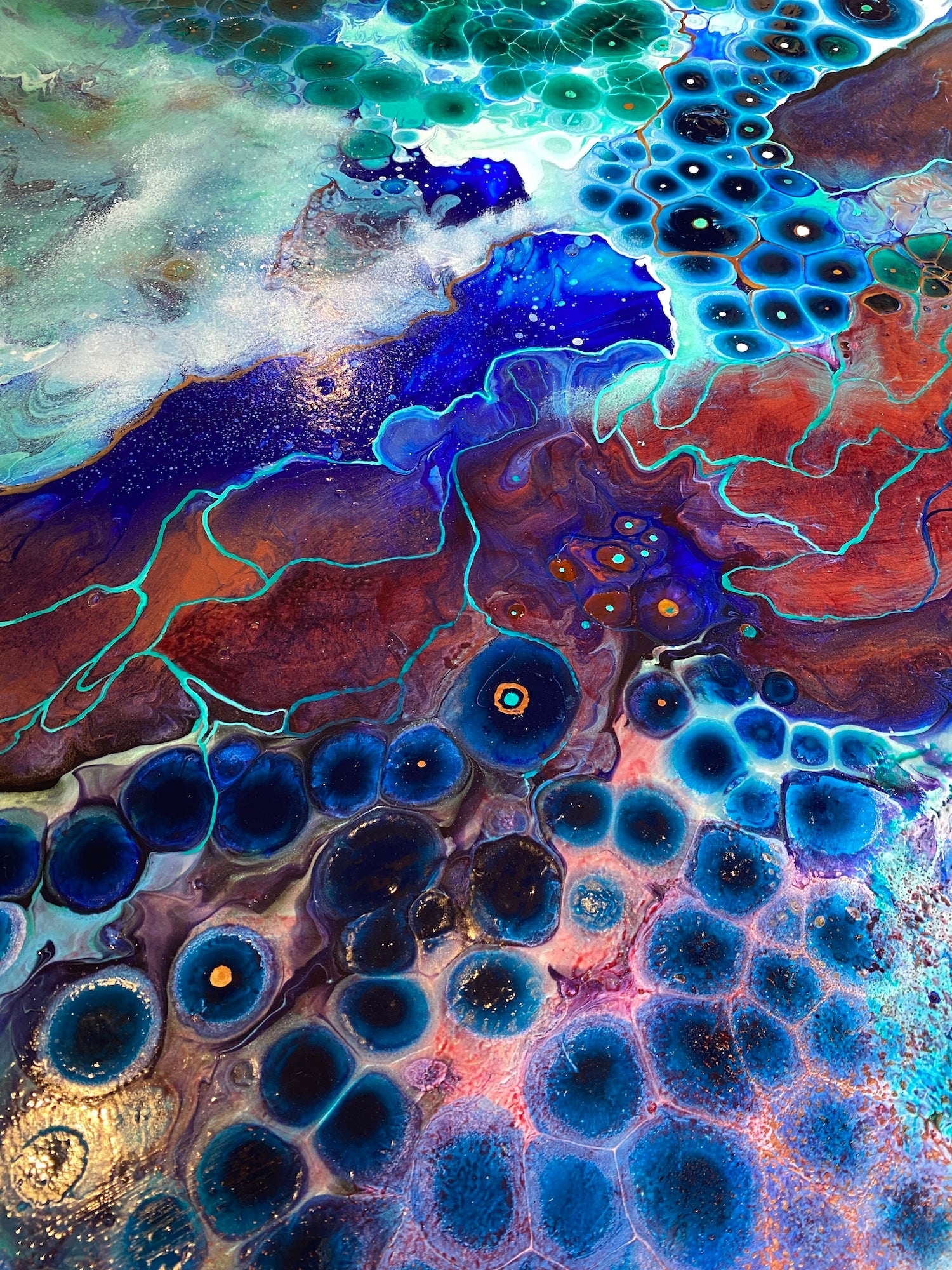 Painted in canvas with my favourite shades of blues, aqua and green with rust areas and golden accents.