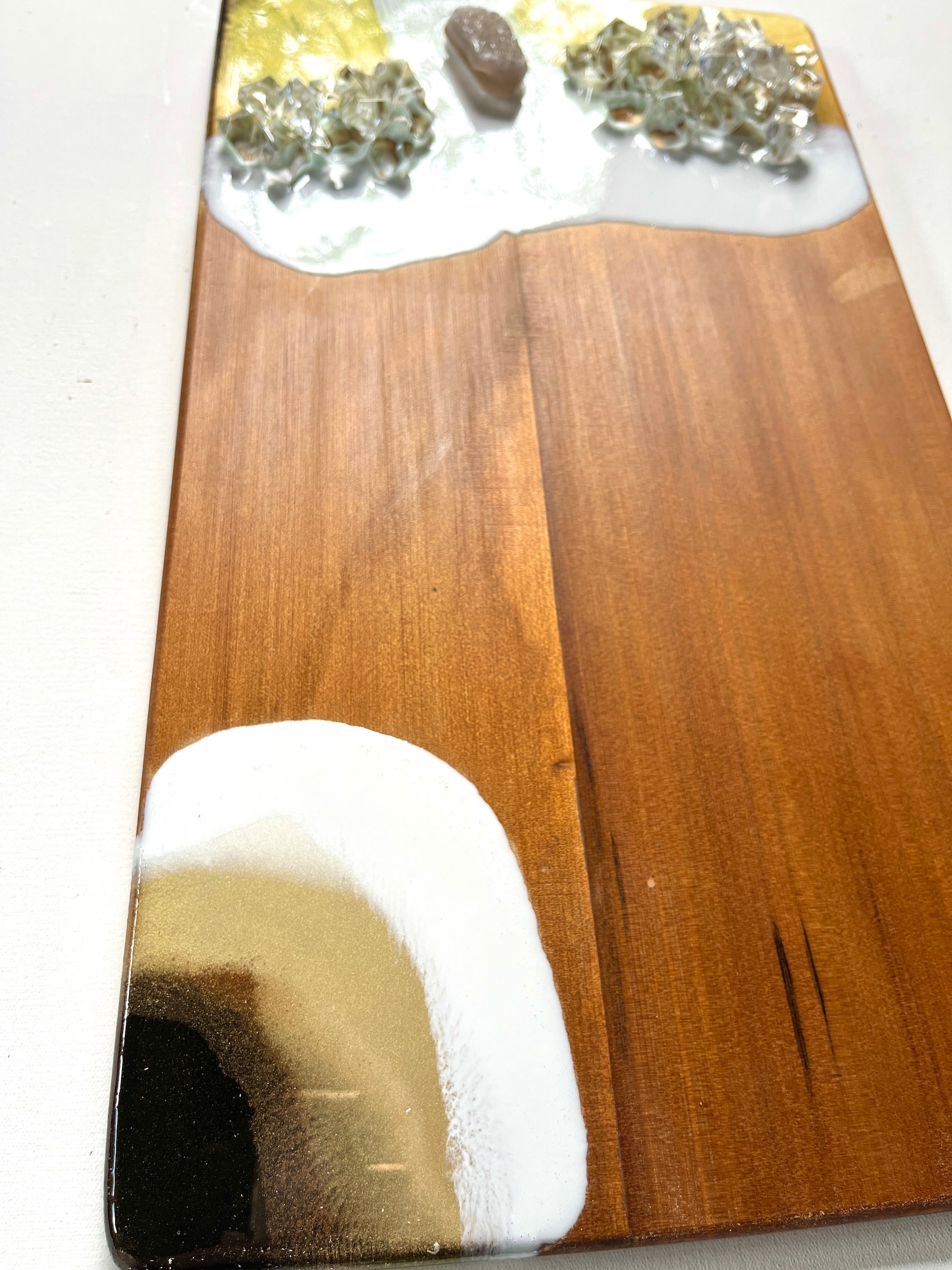 Finished with a clear resin coating.