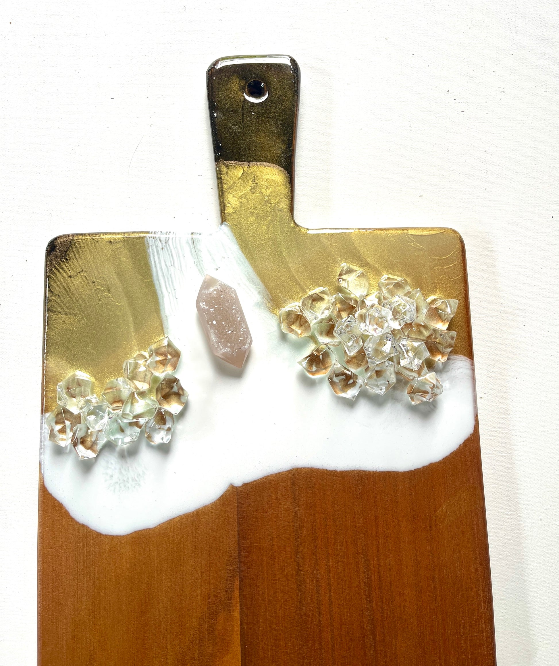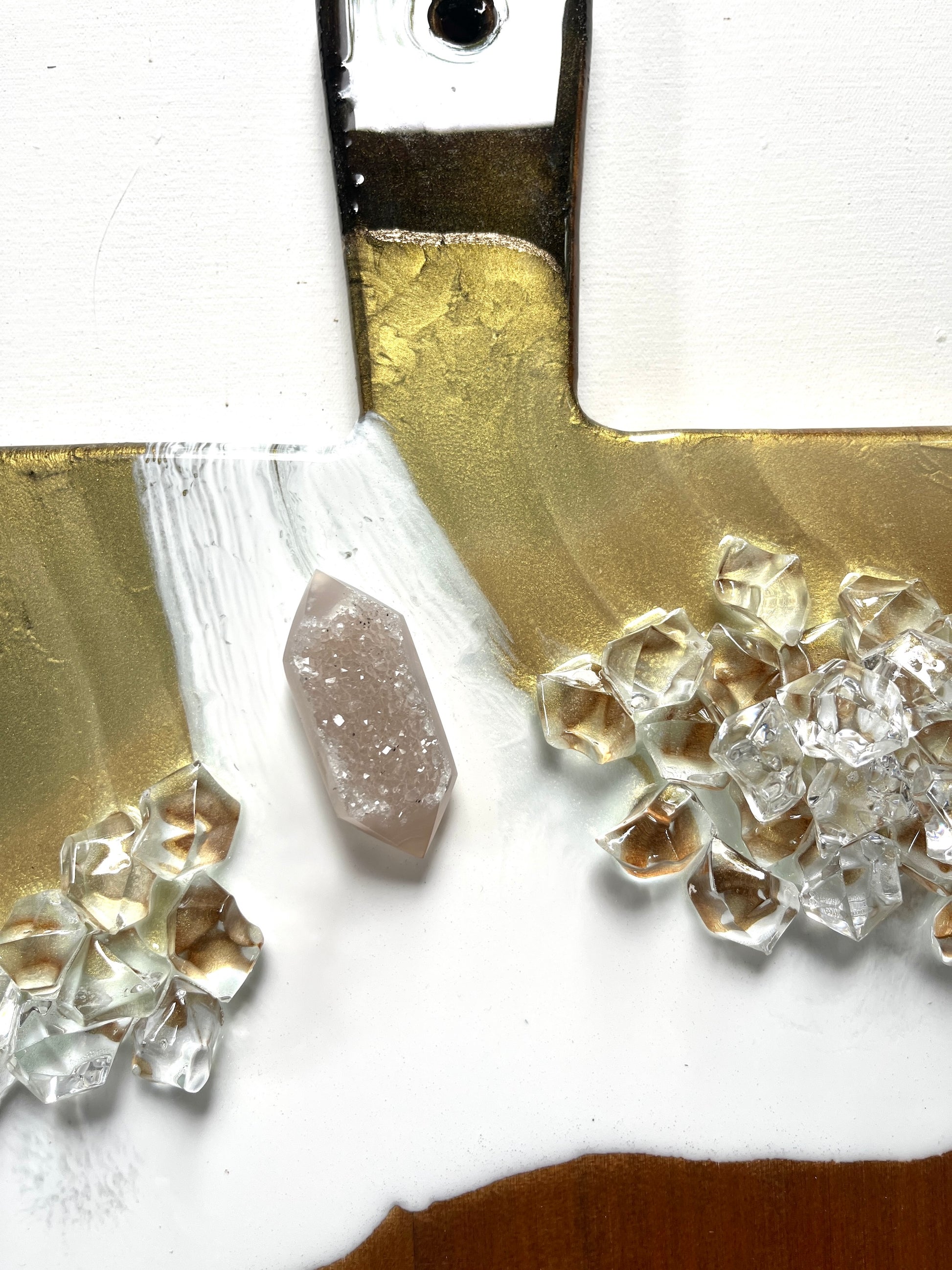 Painted in gold, dark chocolate ad white, features a smattering of clear crystals and a stunning genuine double pointed smoky quartz crystal nestling on the white background.