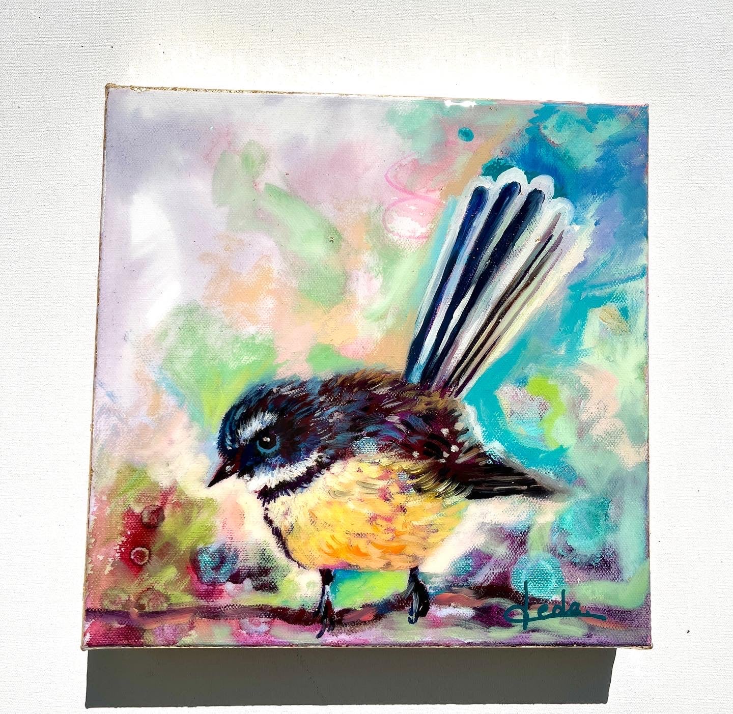 This adorable bird is painted using inks, acrylics and premium quality oils. Featuring a gold leaf surround and sealed with crystal clear resin.
