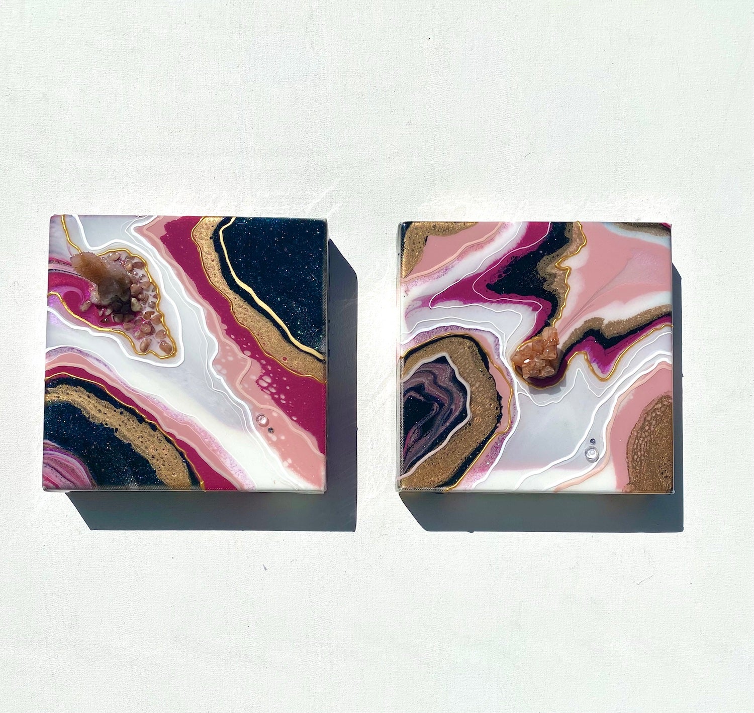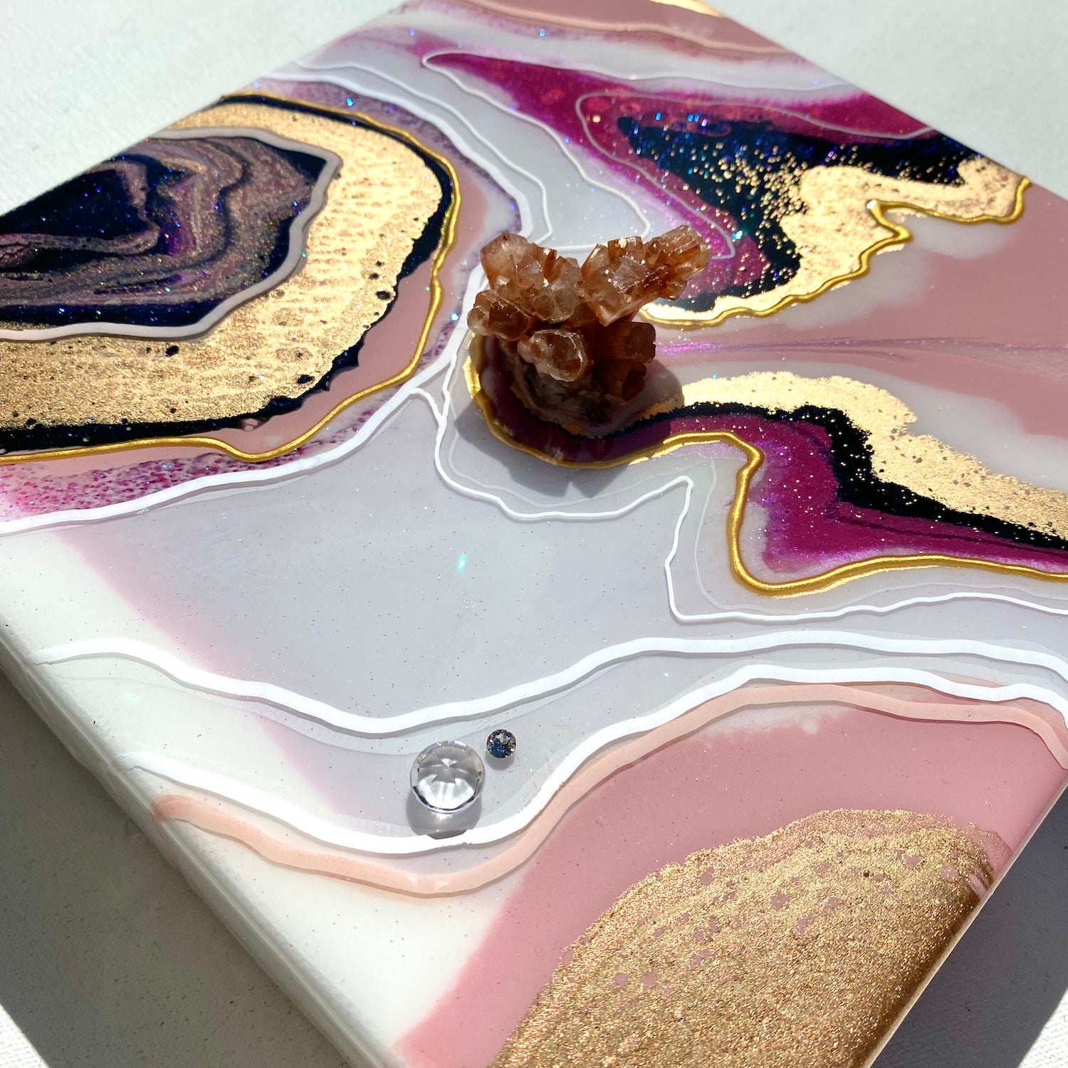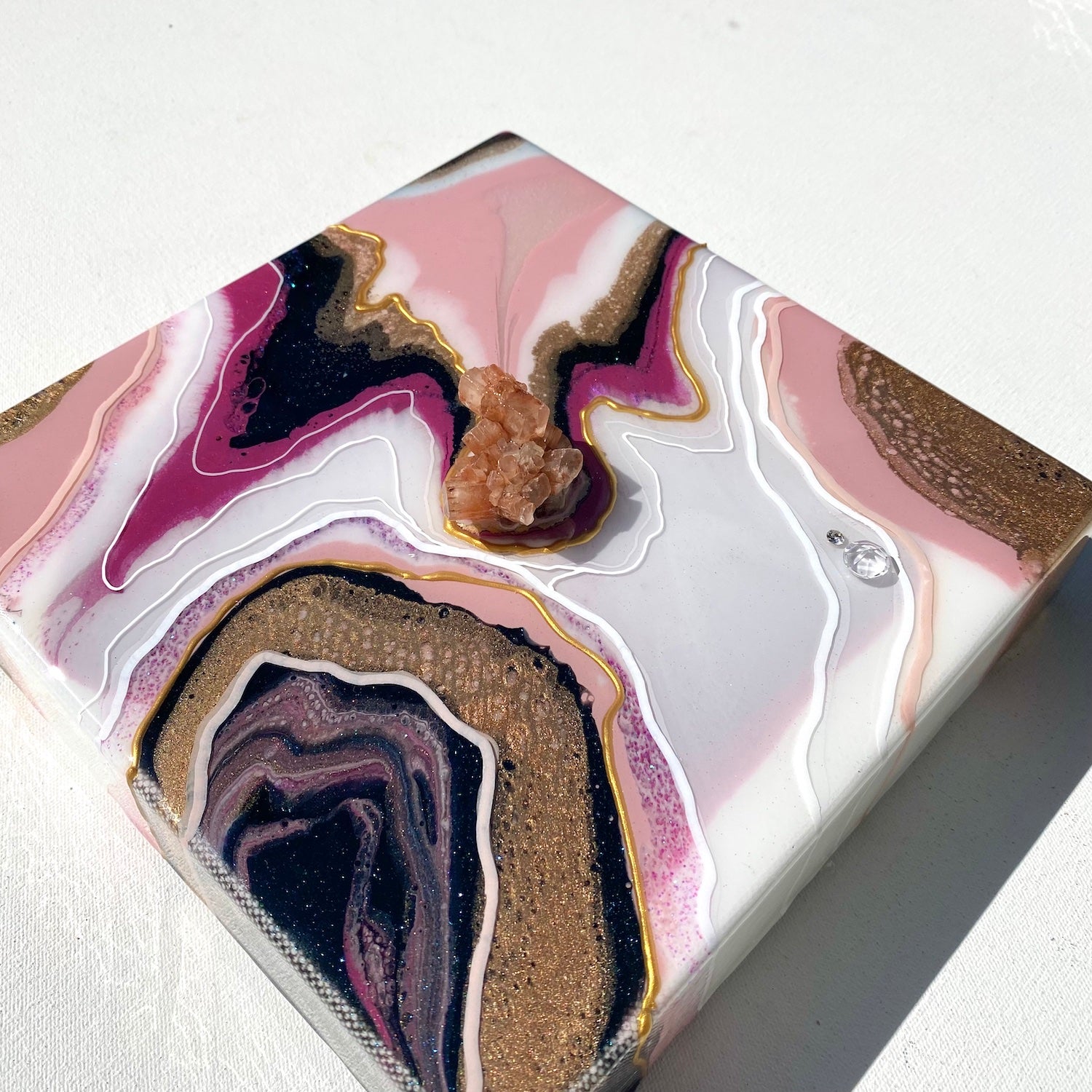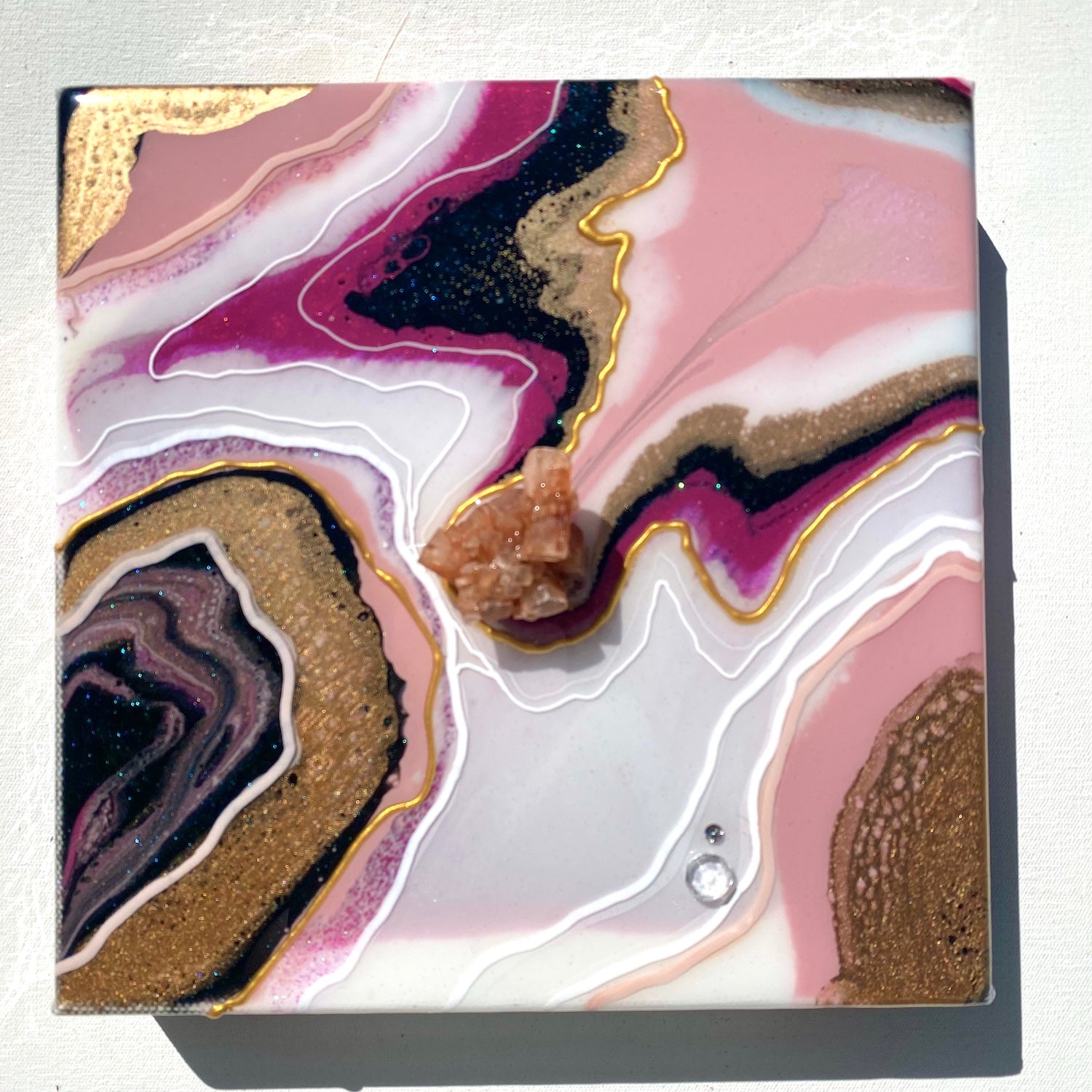 This little beauty will take your breath away. Painted in shades of pink, white, gold and black it features in its centre an Aragonite crystal cluster. This crystal is said to relieve stress and boost energy.