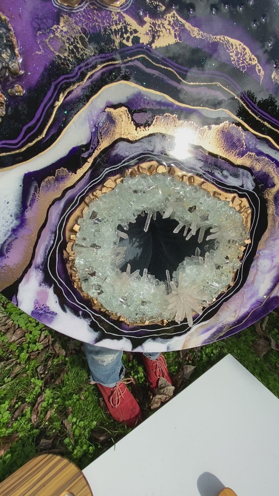 Featuring a crystal quartz and glass centre surrounded by an amethyst colour sea with gold waves and gold leaf lines.