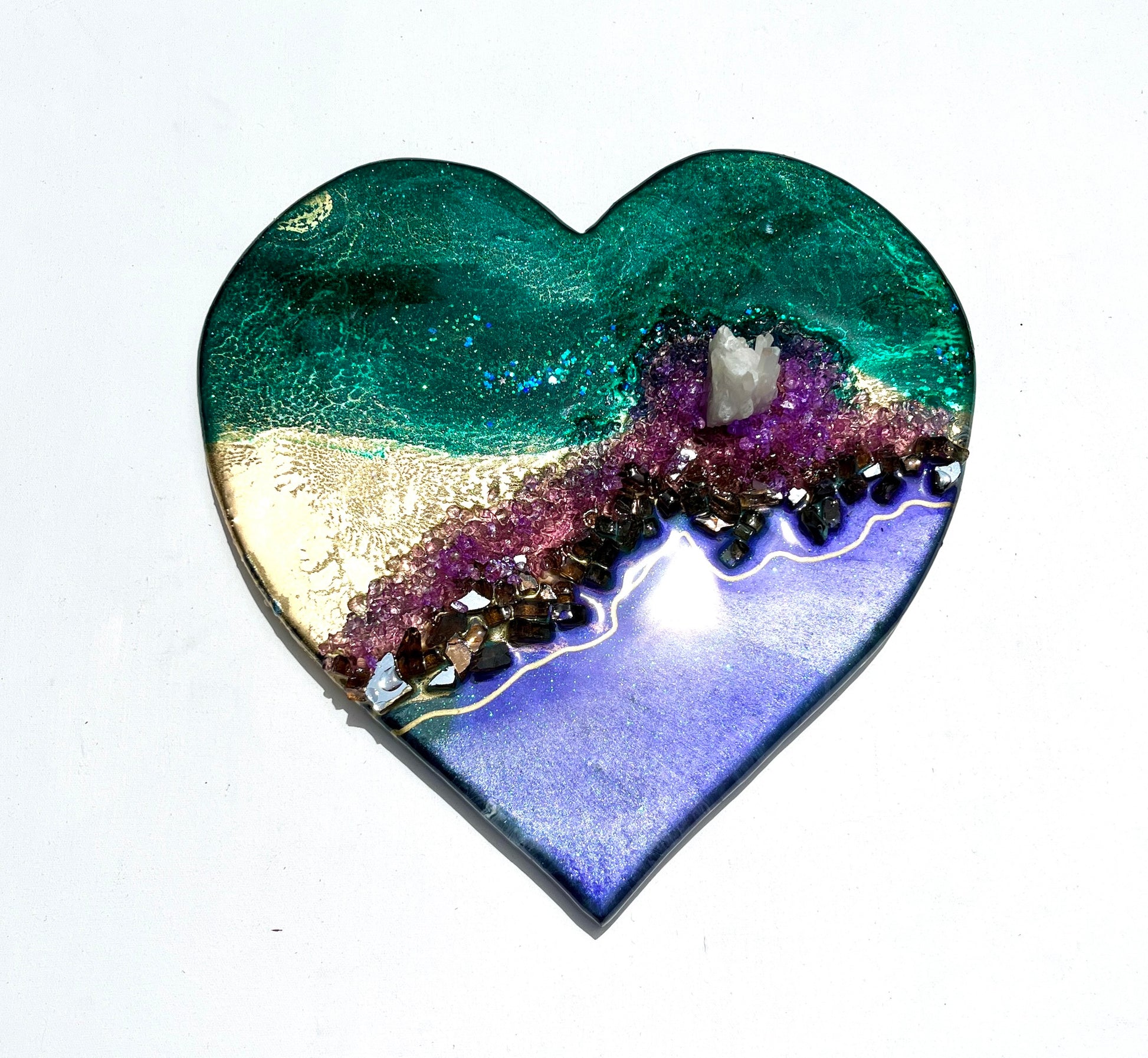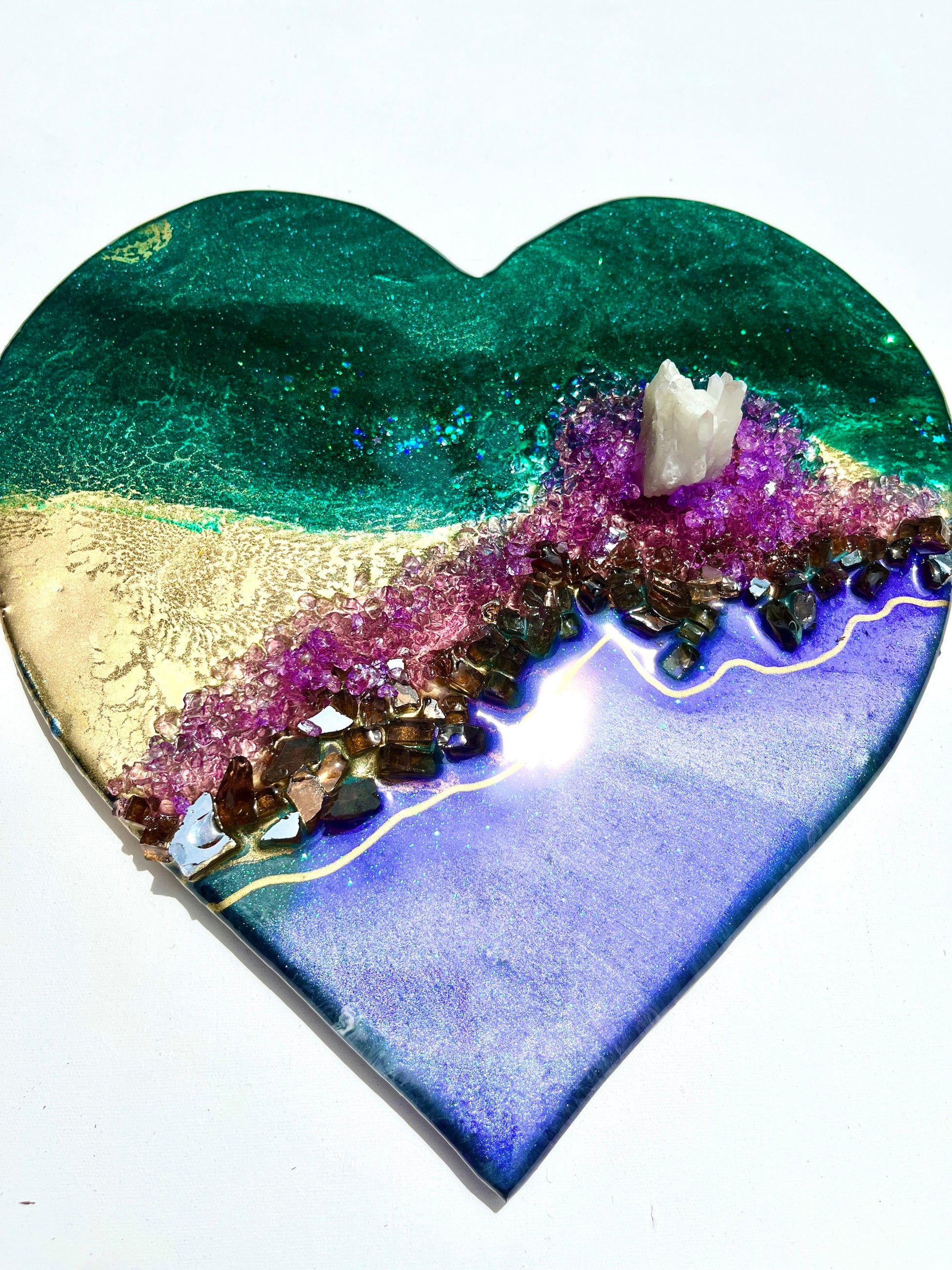 Using genuine crystals, gemstones and 24K gold, hand collected shells and stones to embellish her artworks, Leda uses her materials to create thought provoking artworks that will take your breath away.