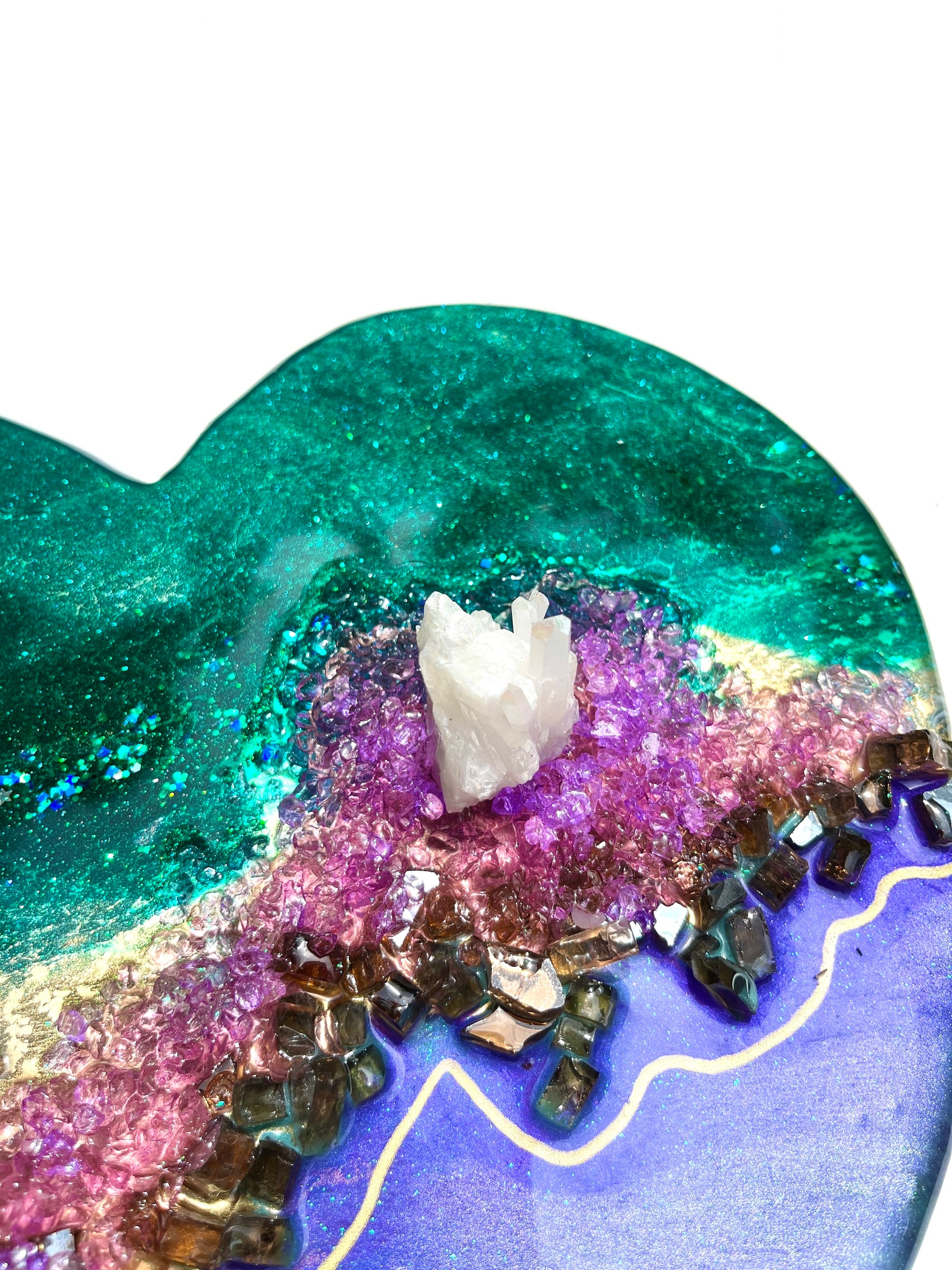 Painted in shades of deep green, gold and purple with a smattering of purple crystals and glass surrounding an stunning rainbow aura quartz cluster. This stone is believed to be the stone of manifestation, meaning it can help to turn your dreams into reality.