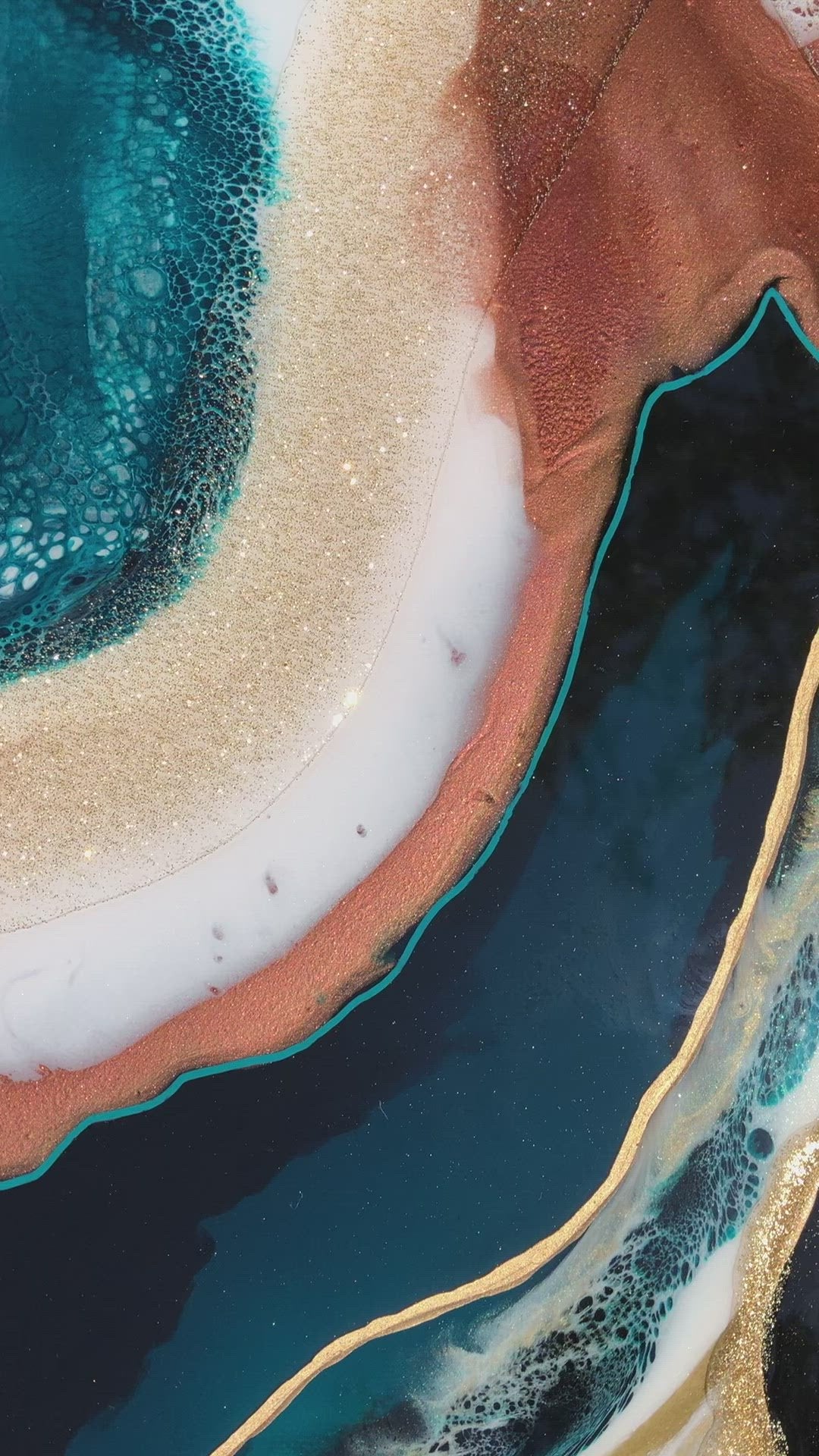 The soft phthalo blue waves, and white foamy crests draw you into their crystal and glass packed centre, with the edges representing rocky coastline.