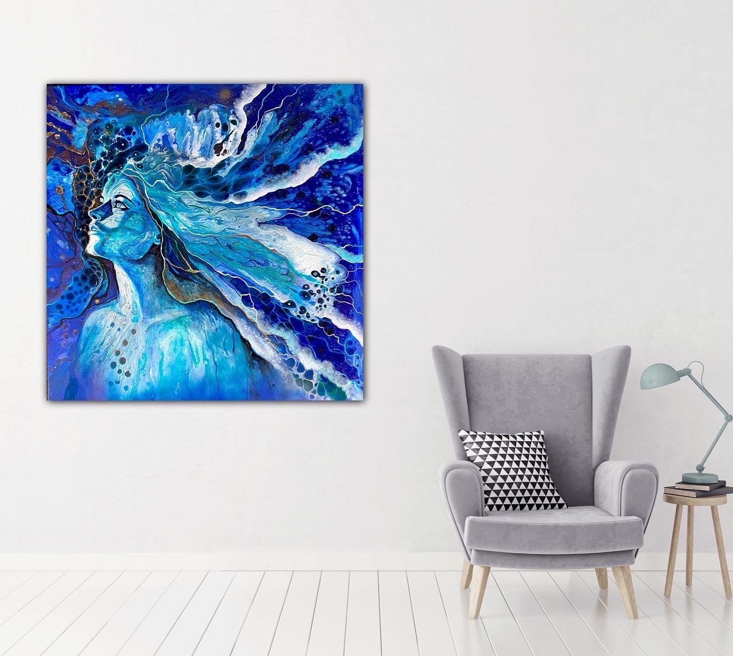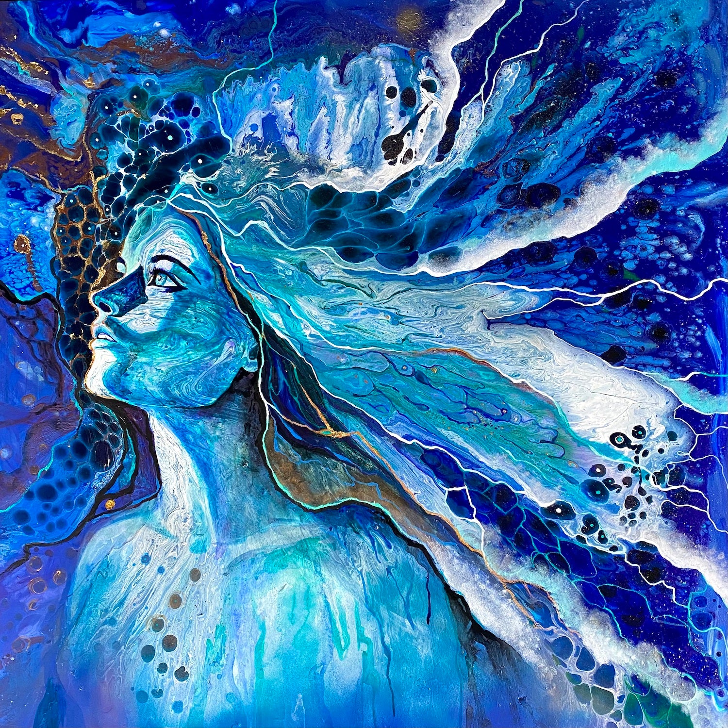 Painted in my usual colours of blue and turquoise with golden and copper accents this lady is a tribute to all women.