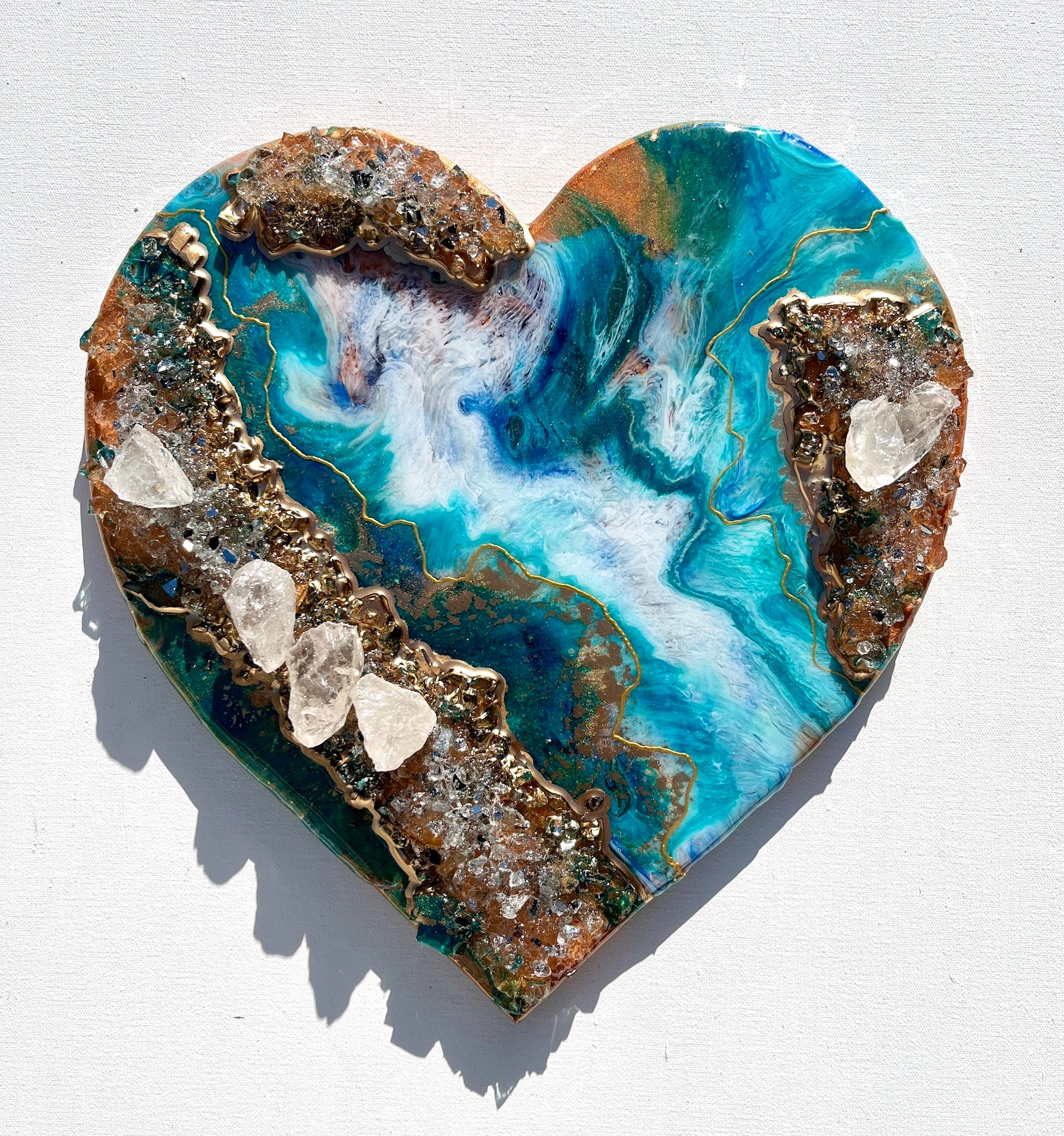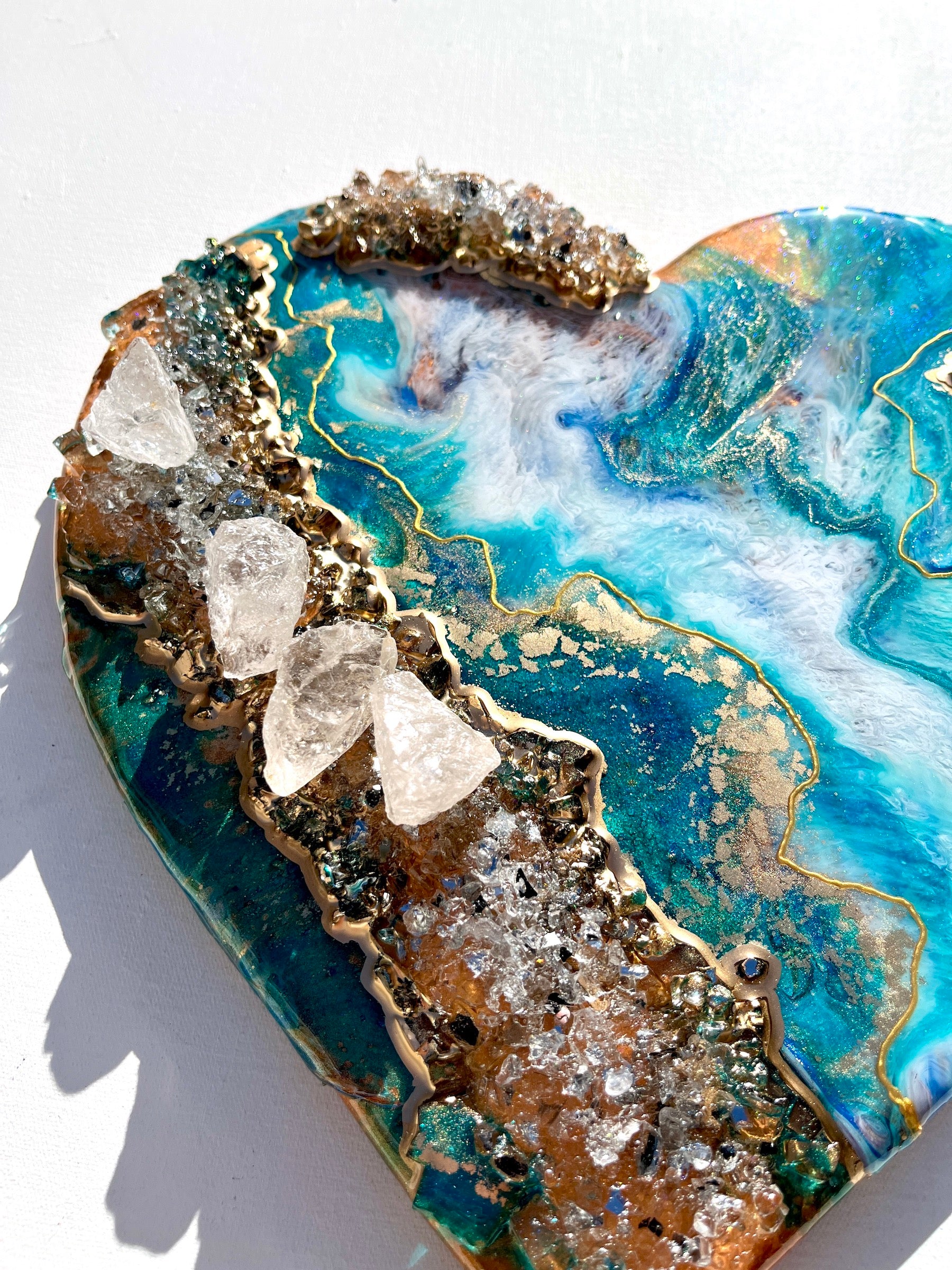 lnspired by the calming waters of the Pacific ocean, this artwork features glass and crystal quartz details surrounded by teal, dark blue and white waves with golden marks reminiscent of sun-kissed sand.