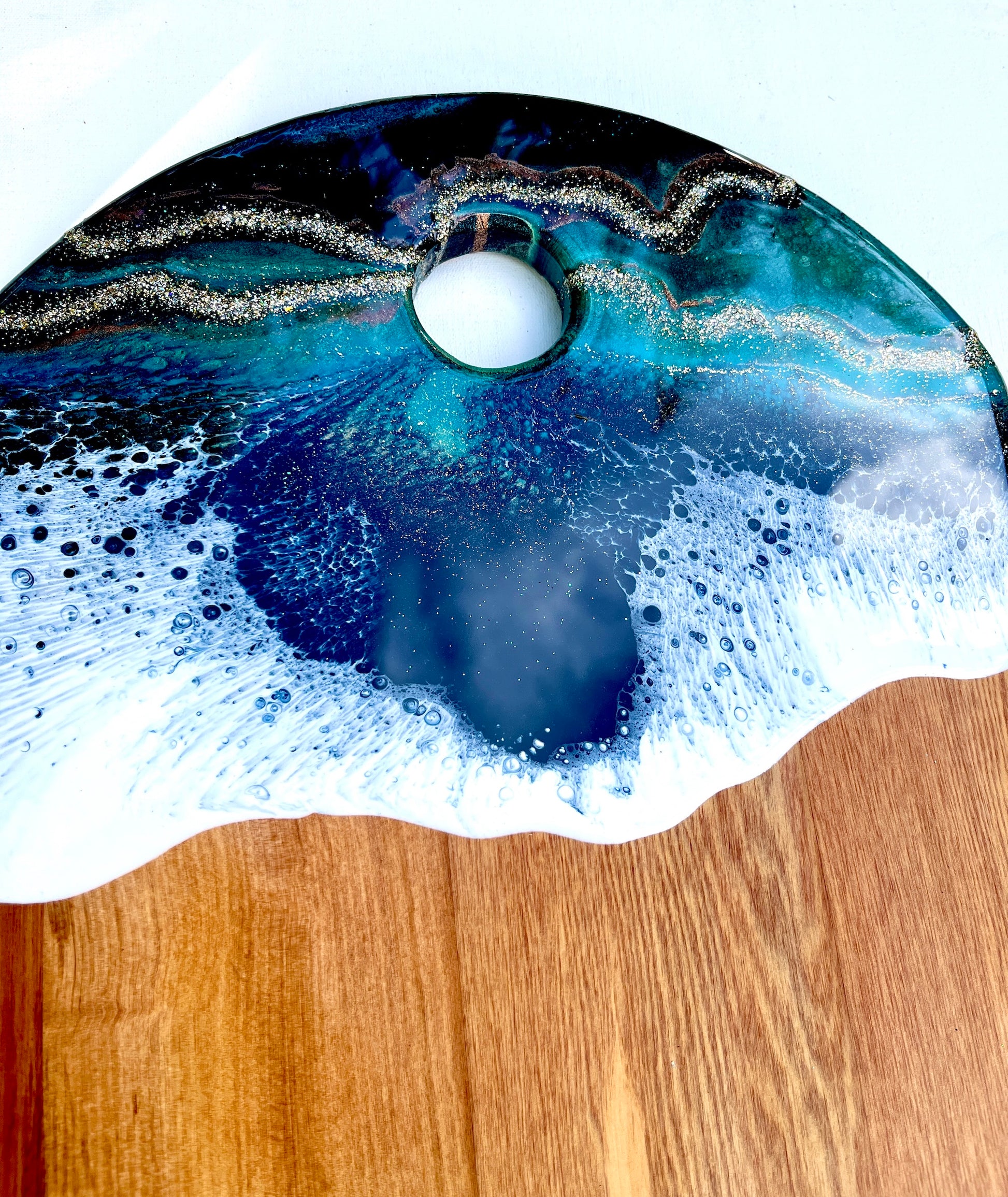 This gorgeous recycled rimu cheeseboard is lovingly painted in shades of deep blue and metallic green with white foamy waves that seem to crash on the beach. Features some delicate glittery gold lines.