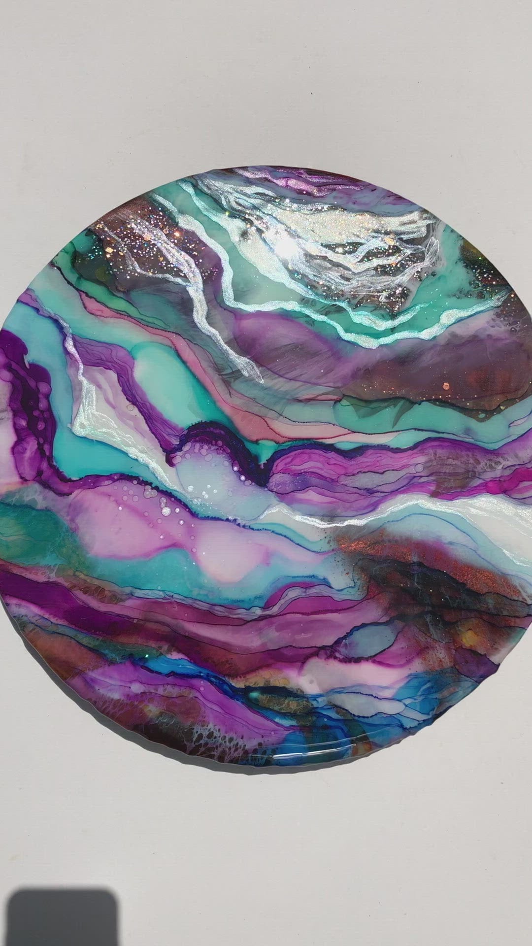 Colourfully painted to brighten up your day using shades of teal, blue, pinks and purples with underlaying copper tones.