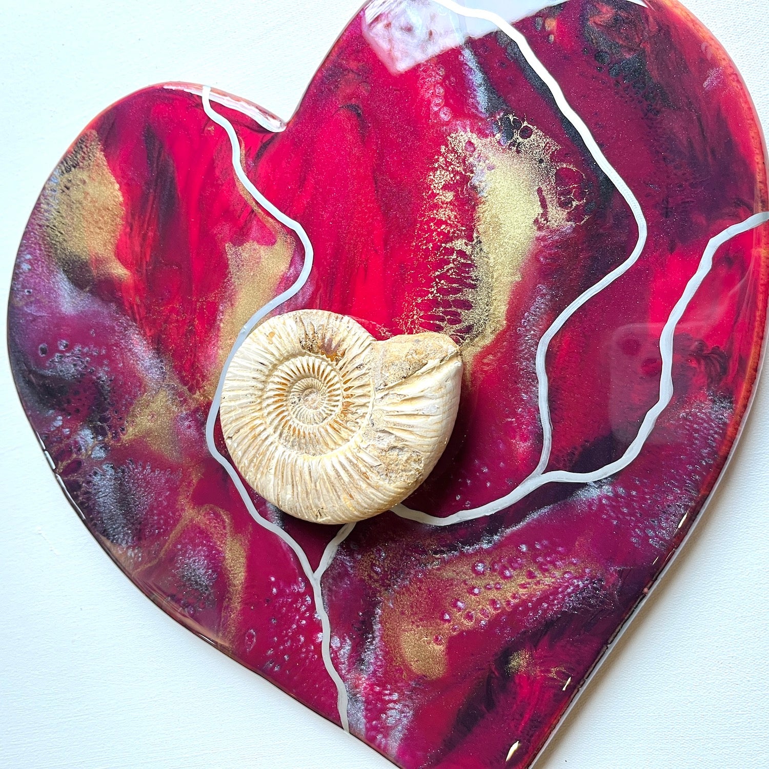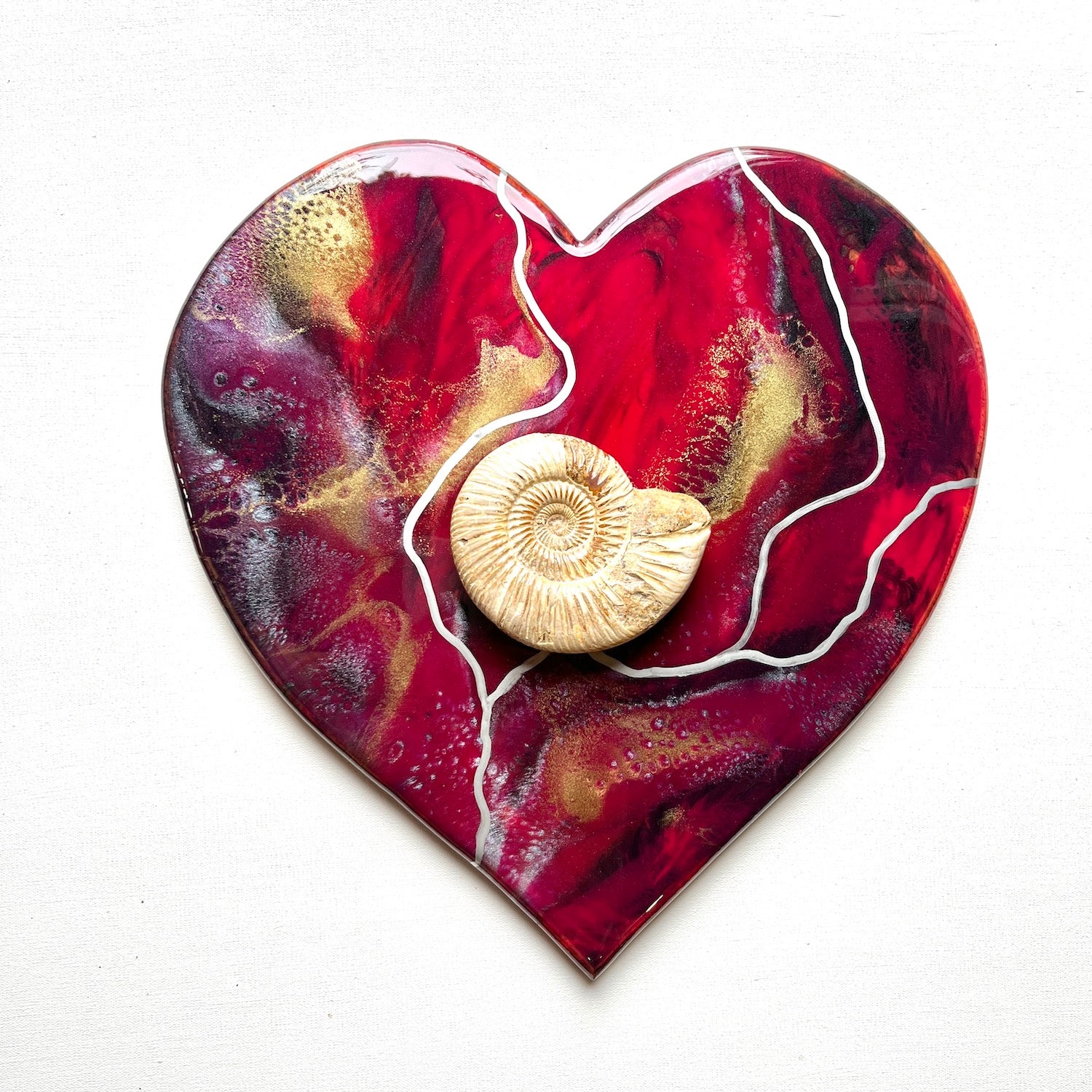 Painted in shades of deep red and black with gold and shimmering white accents. Featuring a beautiful Ammonite fossil shell with its beautiful and perfect spiral.