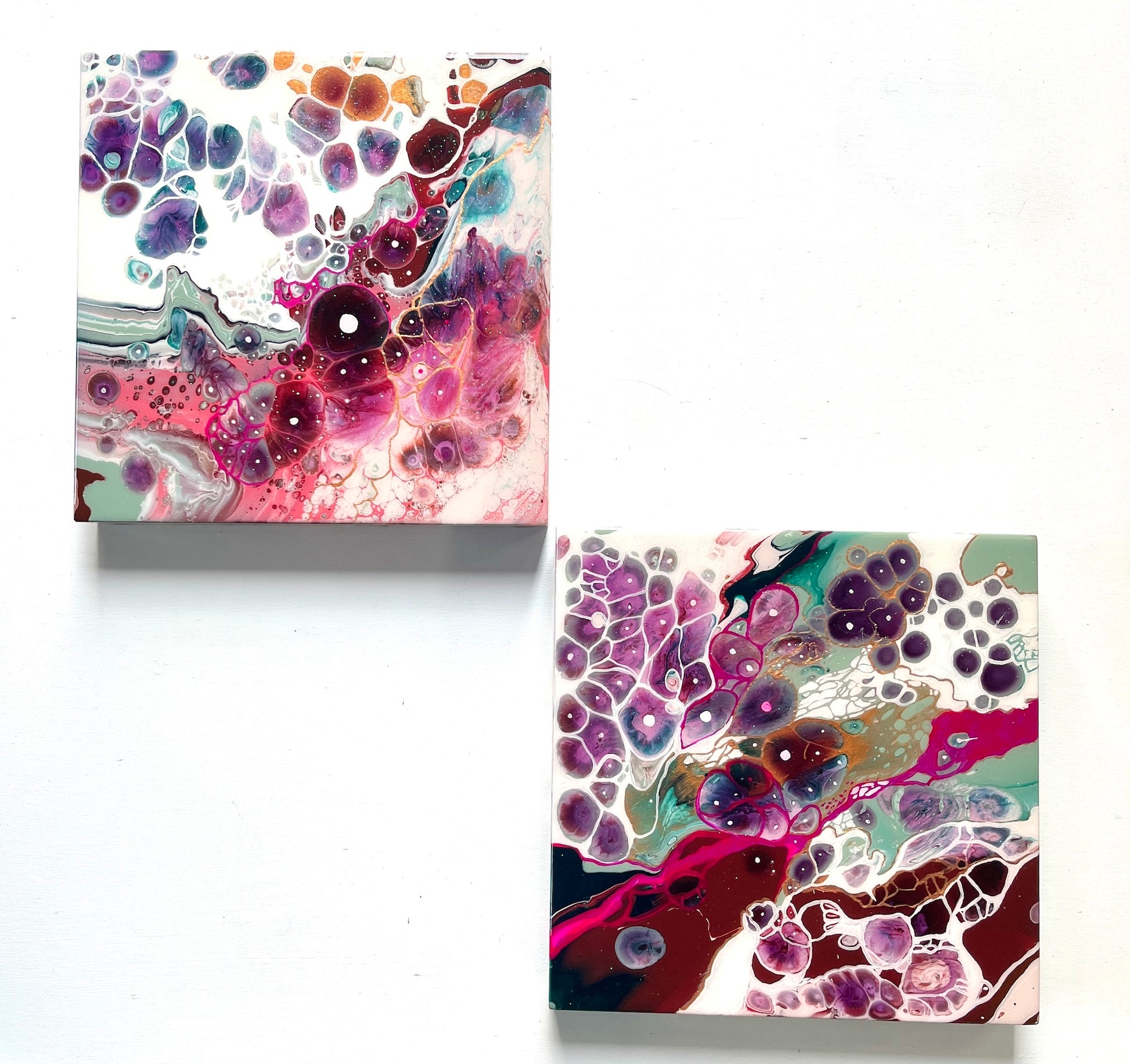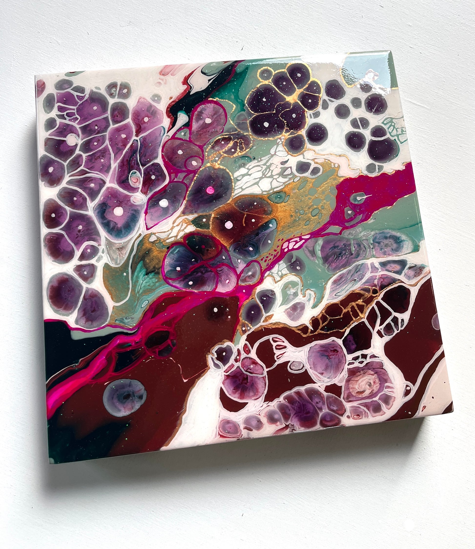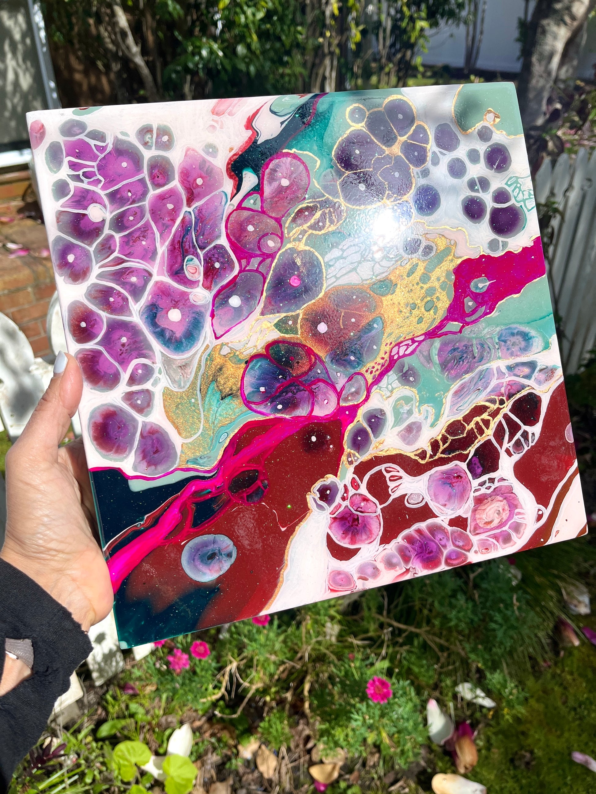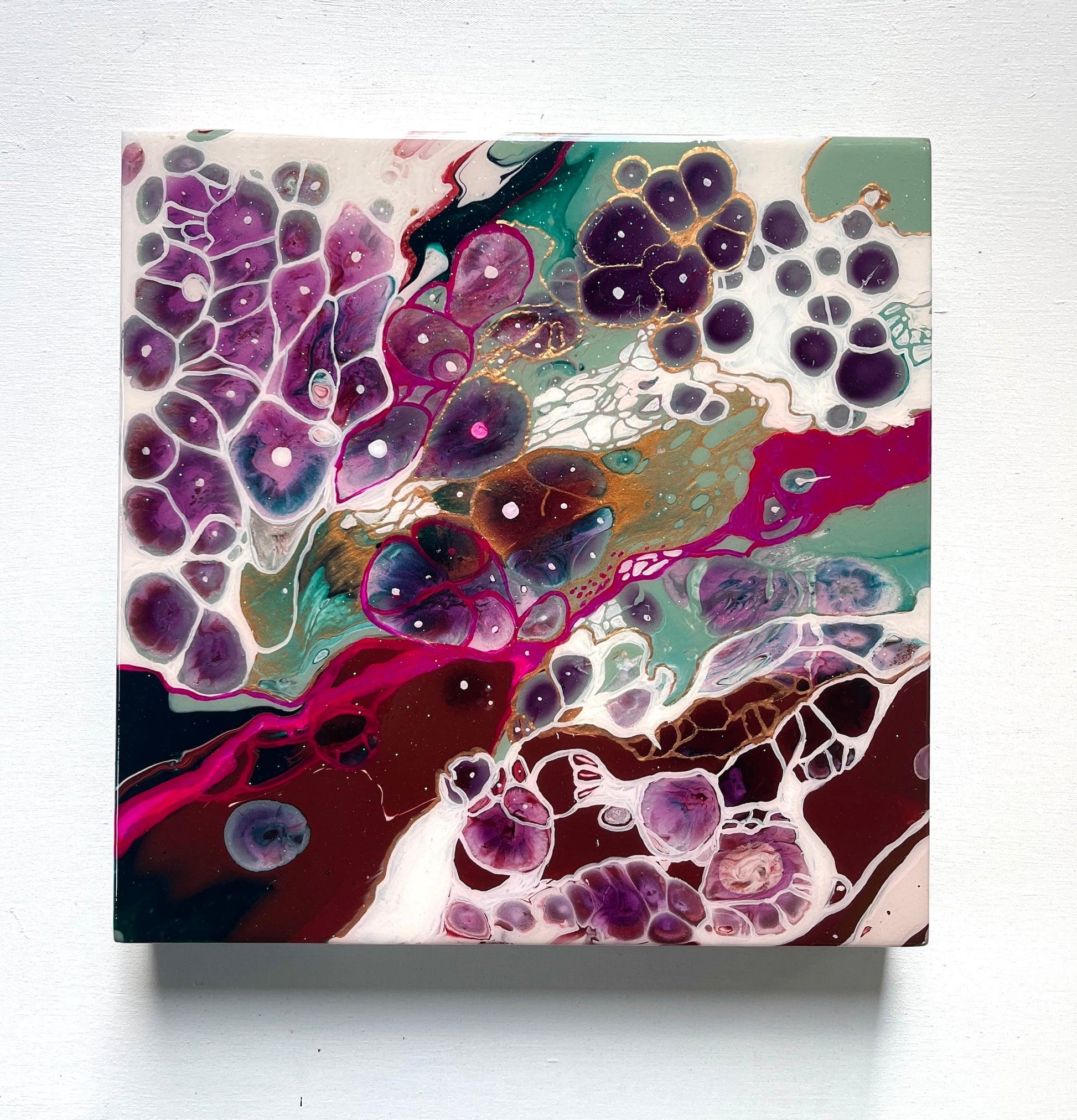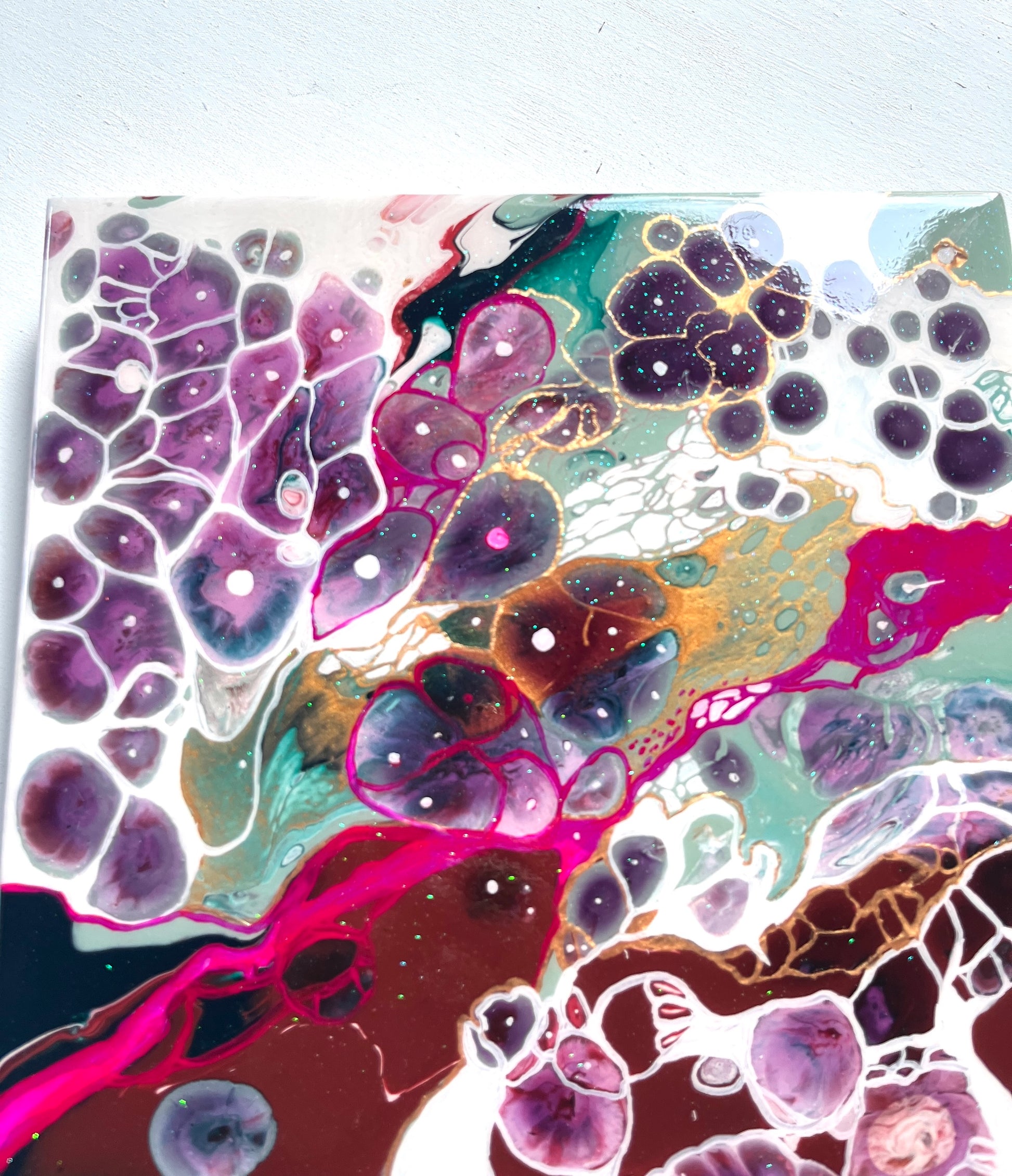 Painted using an acrylic pouring technique as a base and with a great detail of brush work added, this colourful painting is full of small mesmerising details.
