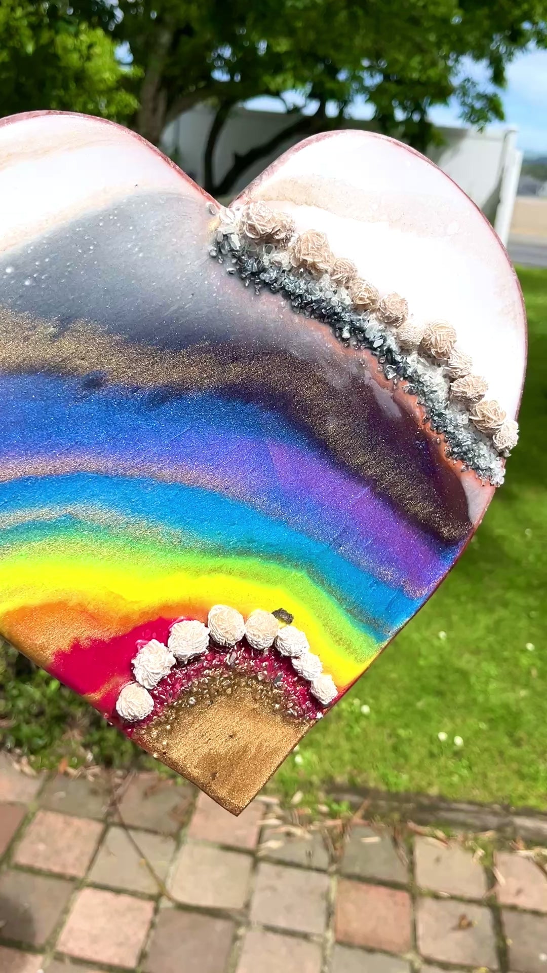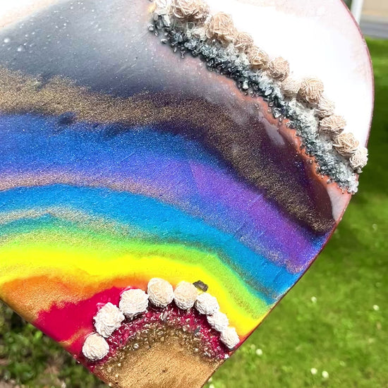 Painted with luminous rainbow colours, this love heart features beautiful desert rose mini stones .