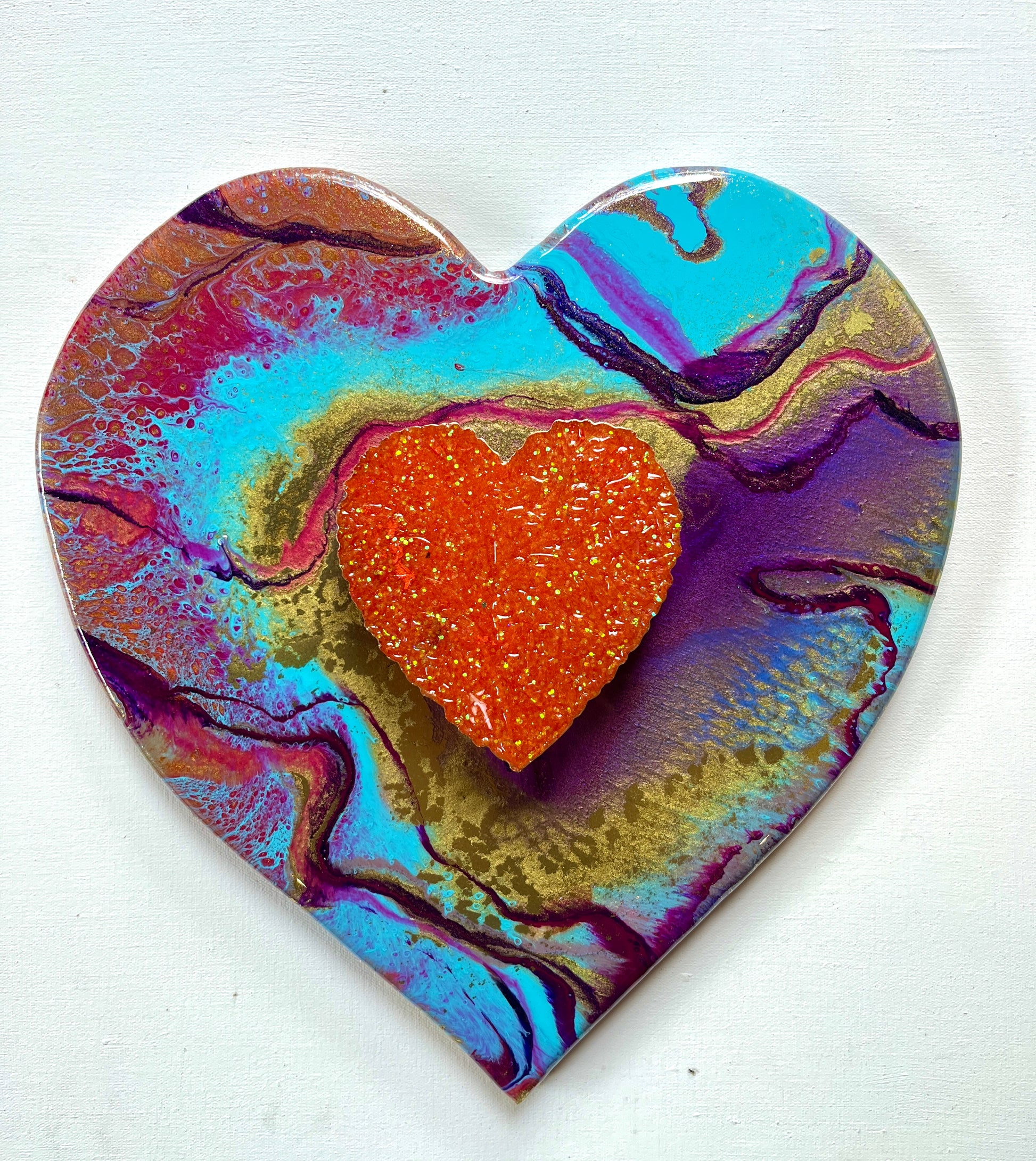 This love heart is painted dark pink, copper, orange, dark aubergine, teal and gold. Features a glittery orange love heart at its centre