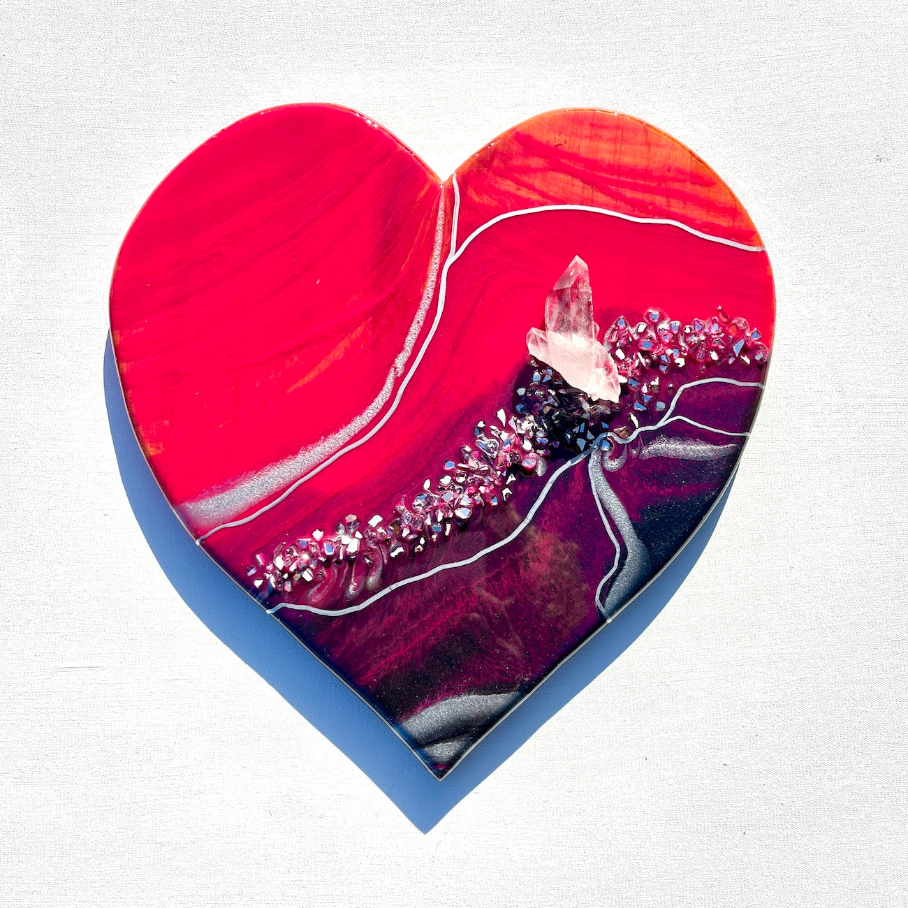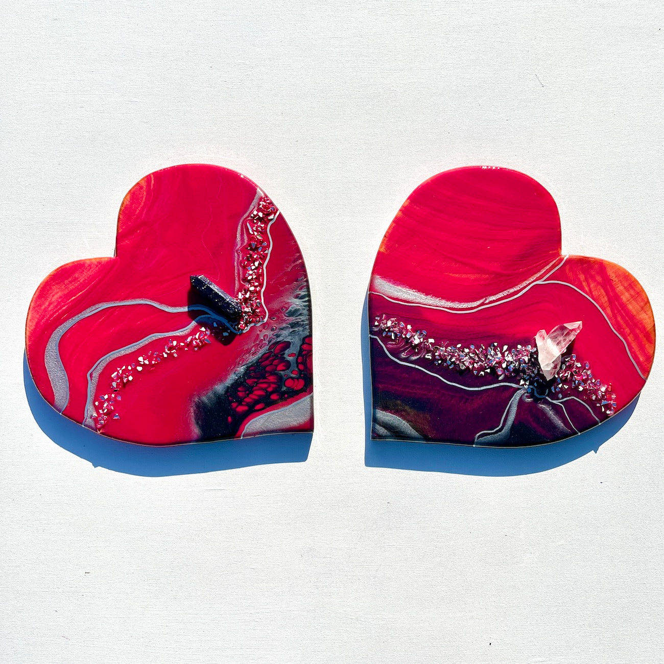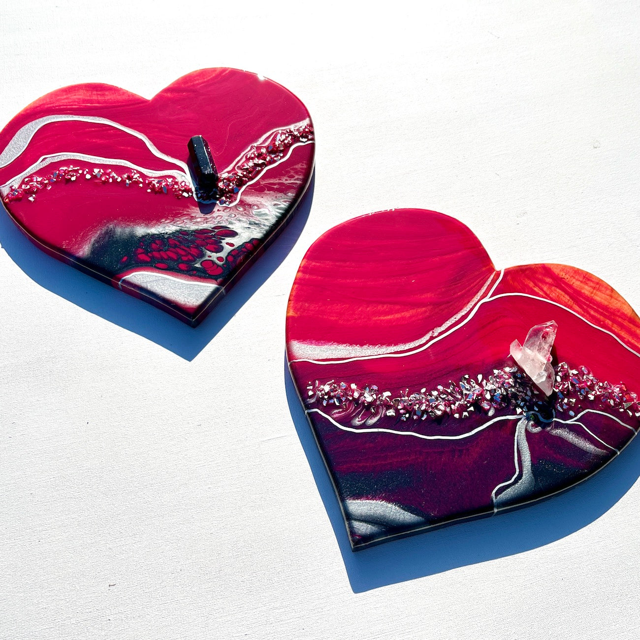 There are two available with different details and accents. Love heart on the left features a sparkling black aventurine crystal point and love heart on the right features a crystal quartz cluster. Sold separately. If both are available please choose a preference.