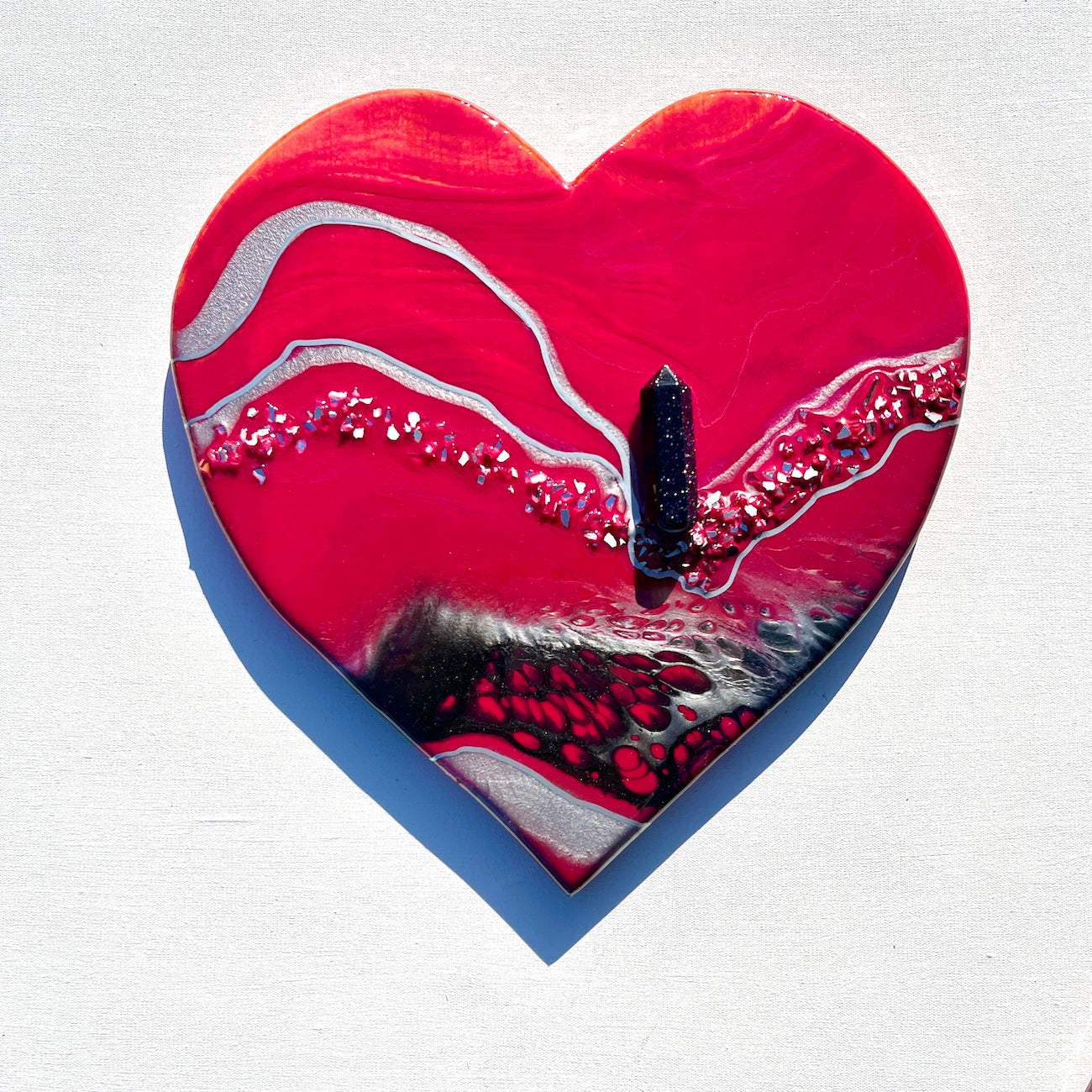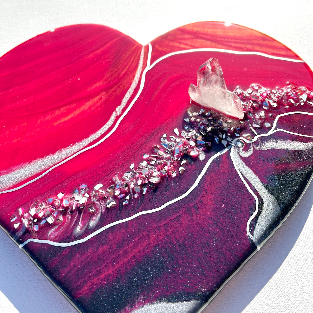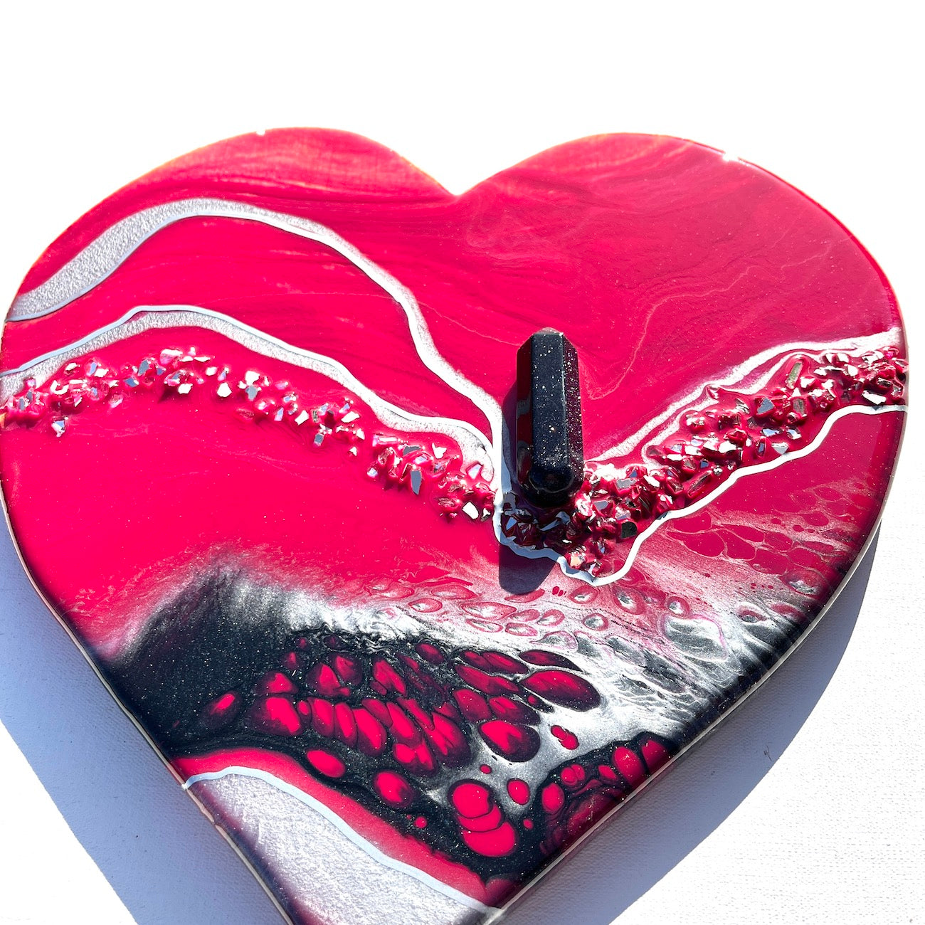 There are two available with different details and accents. Love heart on the left features a sparkling black aventurine crystal point and love heart on the right features a crystal quartz cluster. Sold separately. If both are available please choose a preference.