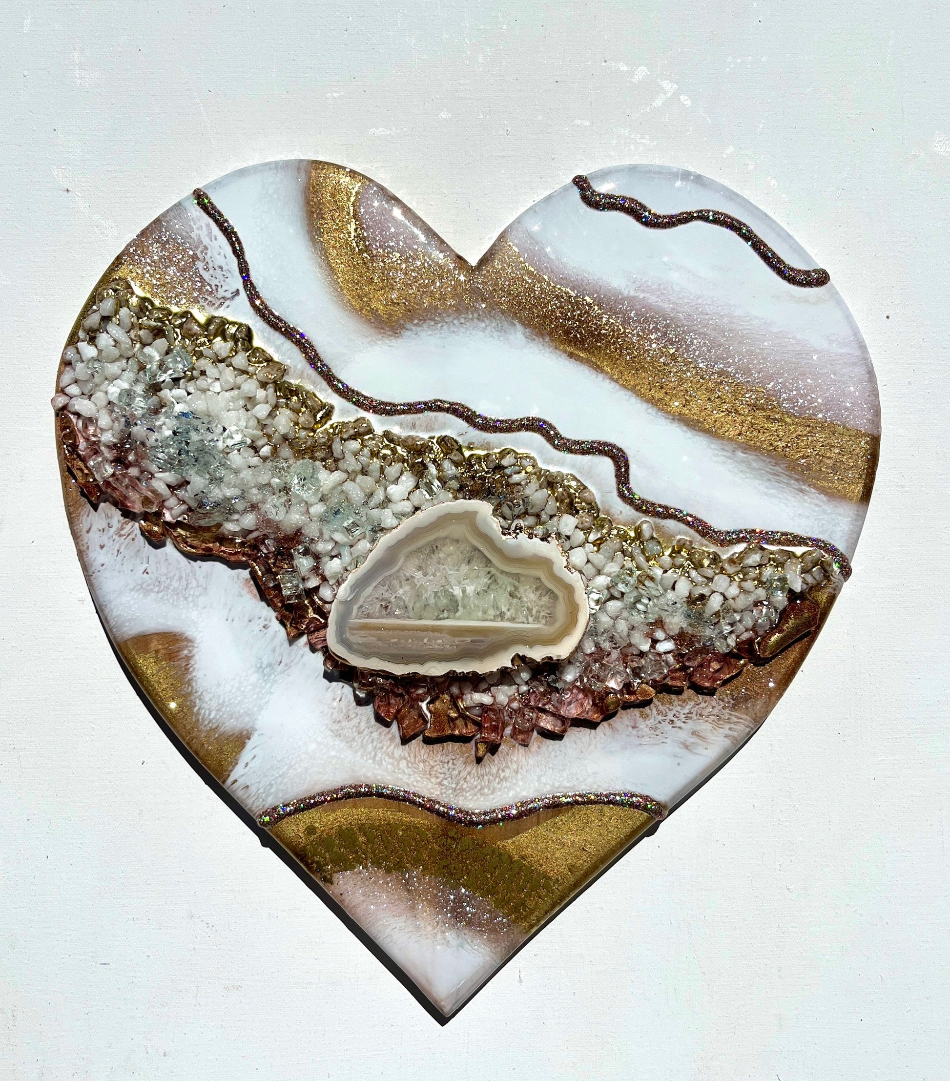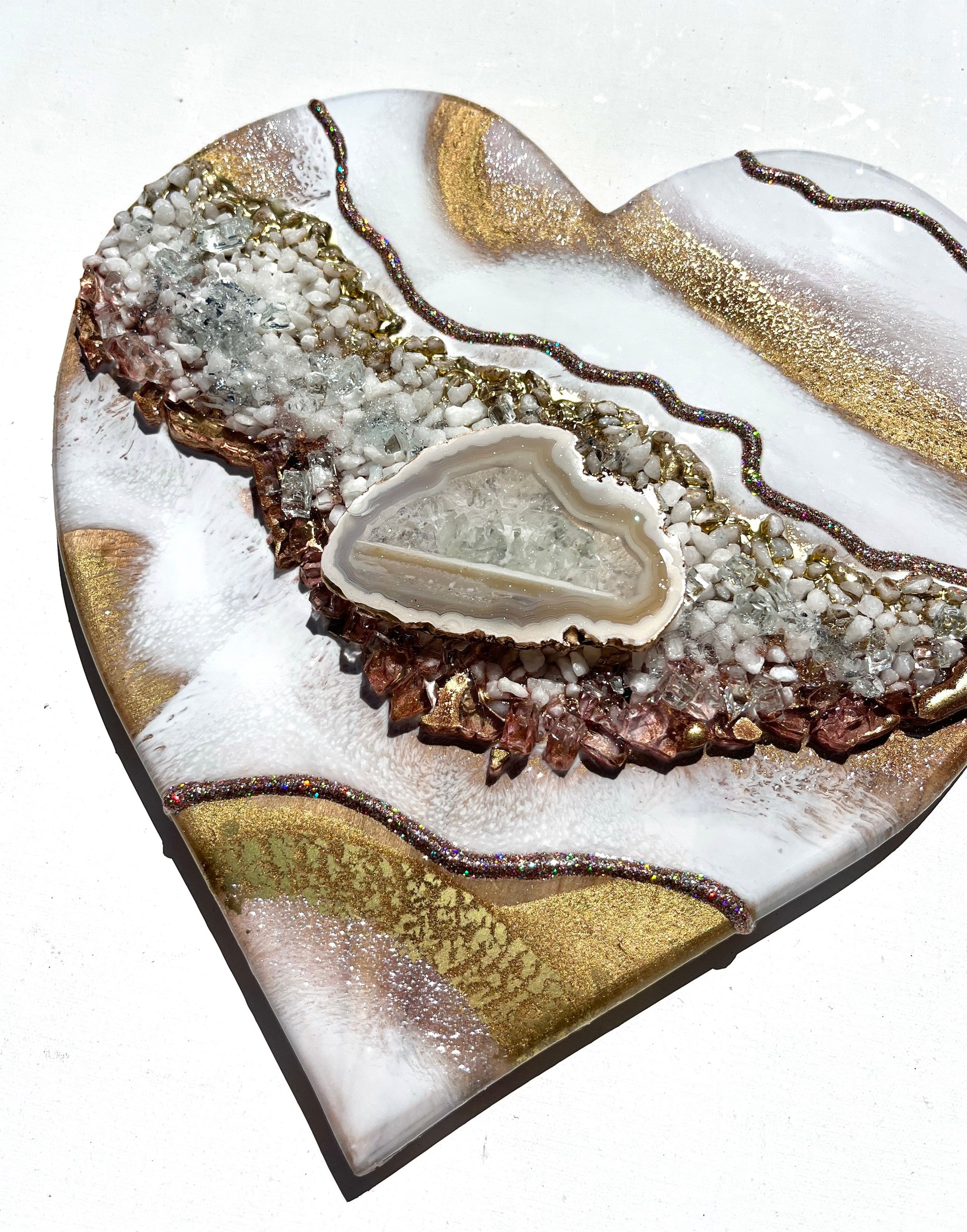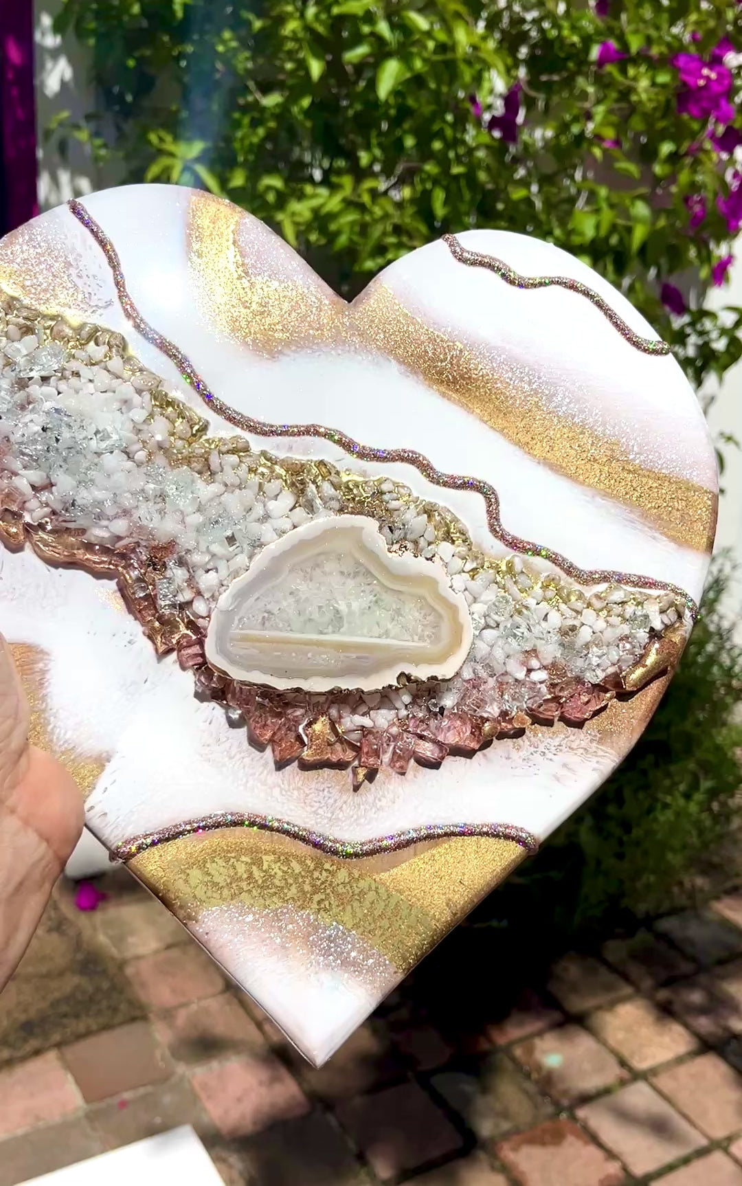 - The epitome of elegance and glamour, this unique piece will capture your heart. Painted in white and gold with copper accents, white stones and a beautiful white agate slice at its centre. With added 3D gold glitter lines for extra luxury!