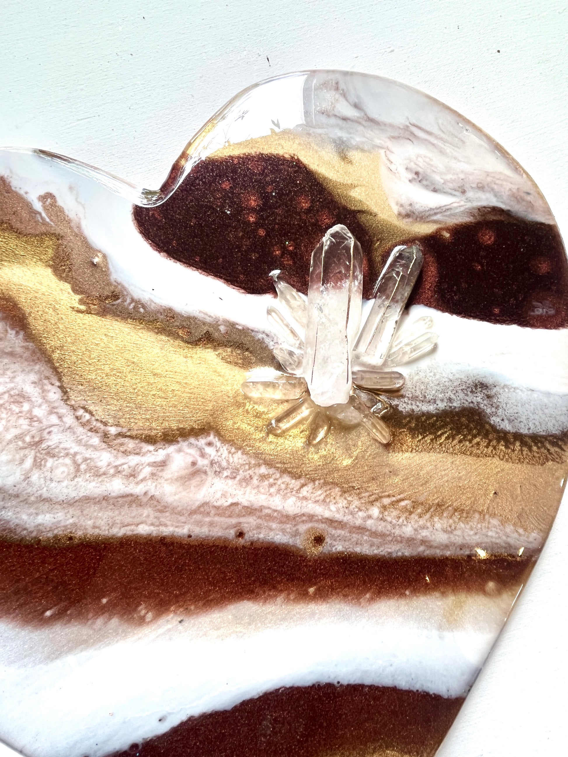 This gorgeous wooden love heart is painted using a deep copper, gold and shimmer white colours. Decorated with genuine crystal quartz points in the form of a flower.